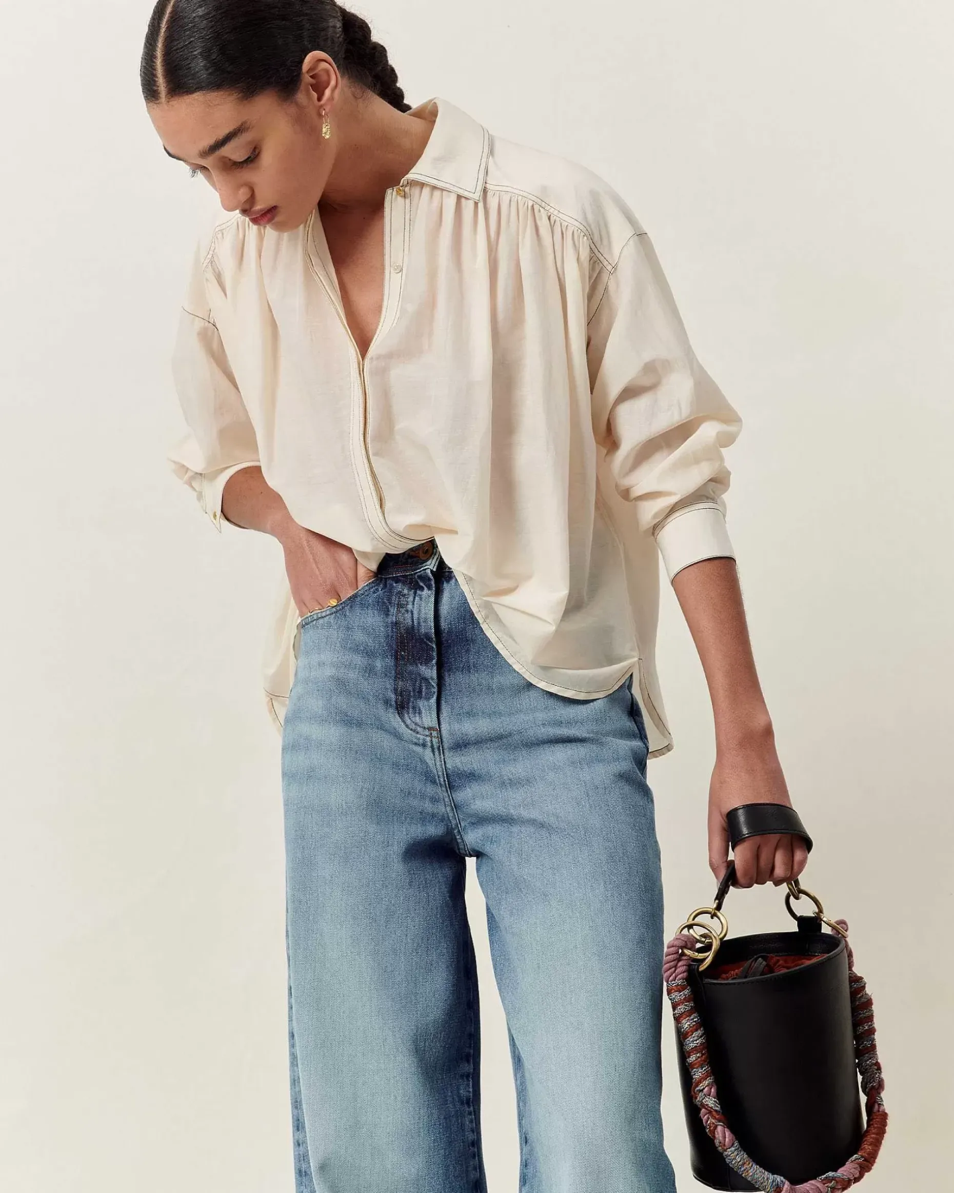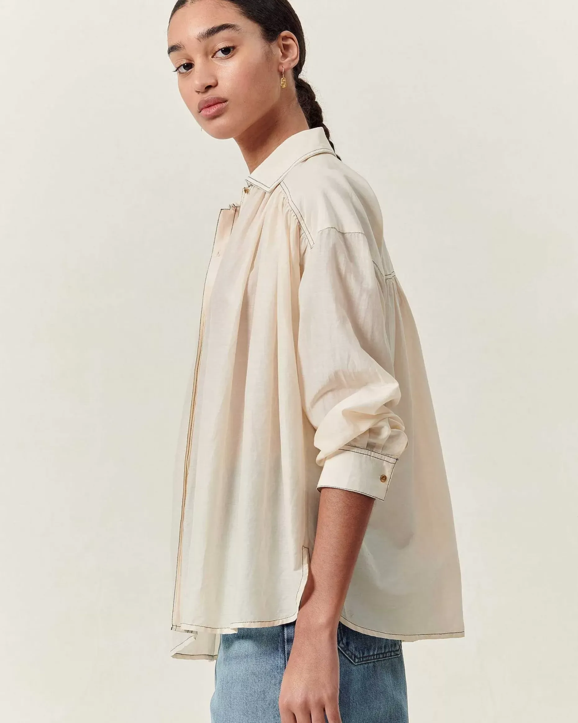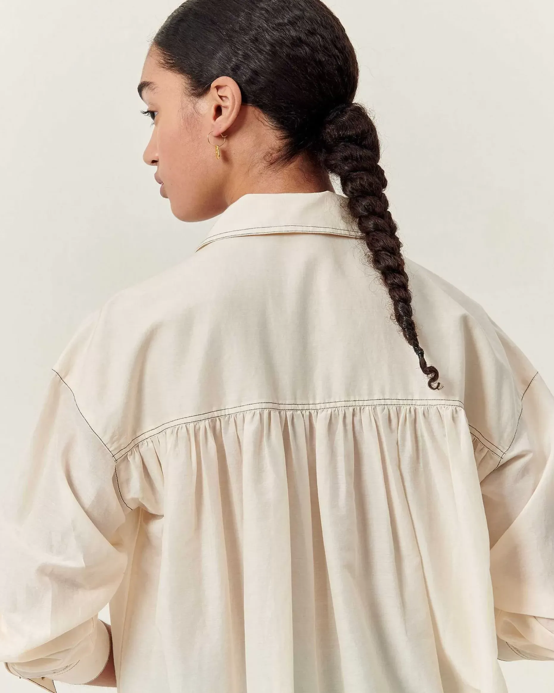 Weit Geschnittenes, Gerafftes Hemd Aus Baumwoll-Viskose, Kontrastierende Steppnähte.