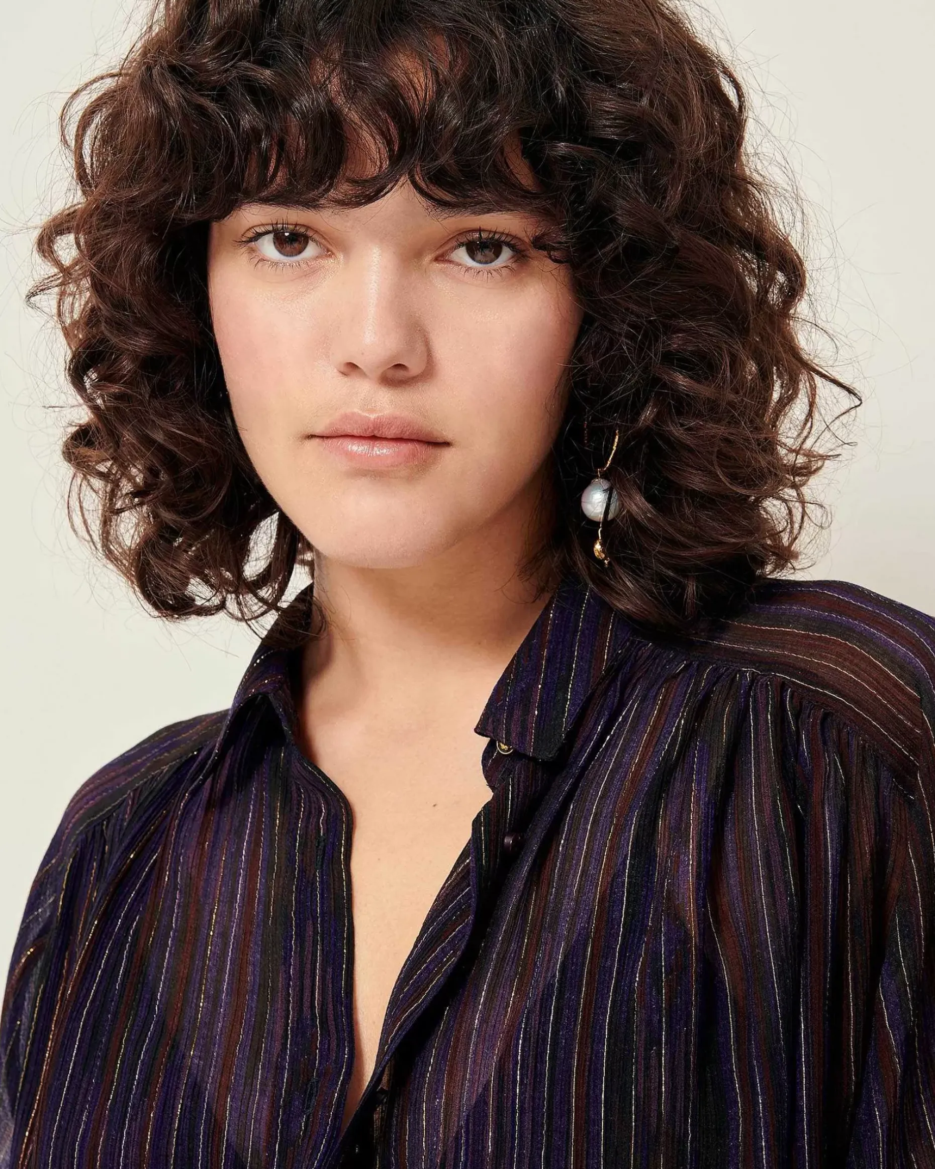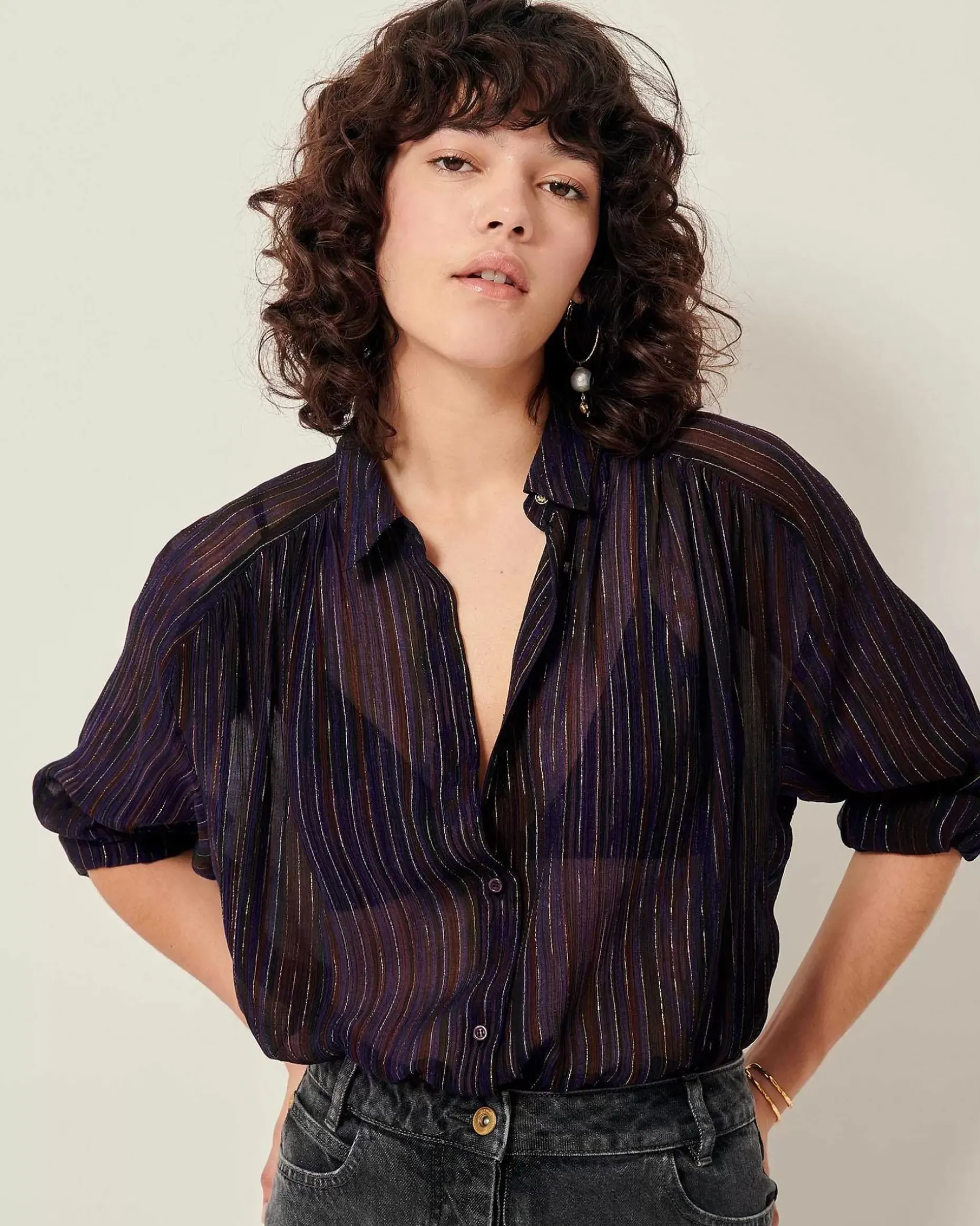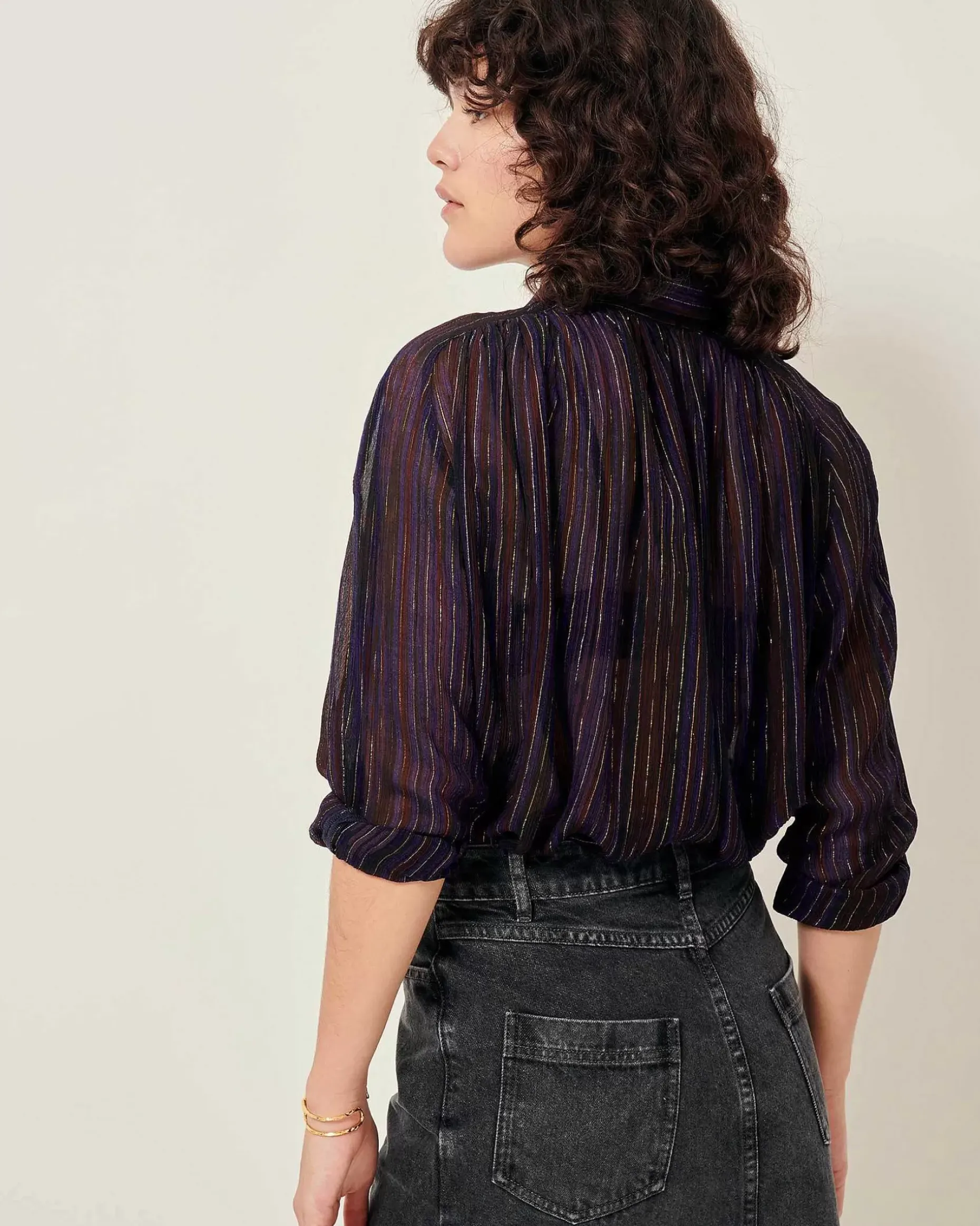 Weites Hemd Mit Raglanärmeln Und Zarten Raffungen Auf Vorder- Und Rückseite Aus Mit Zarten Metallic-Streifen Bedrucktem Musselin Aus Viskose-Seide, Exklusives Sessùn-Muster.
