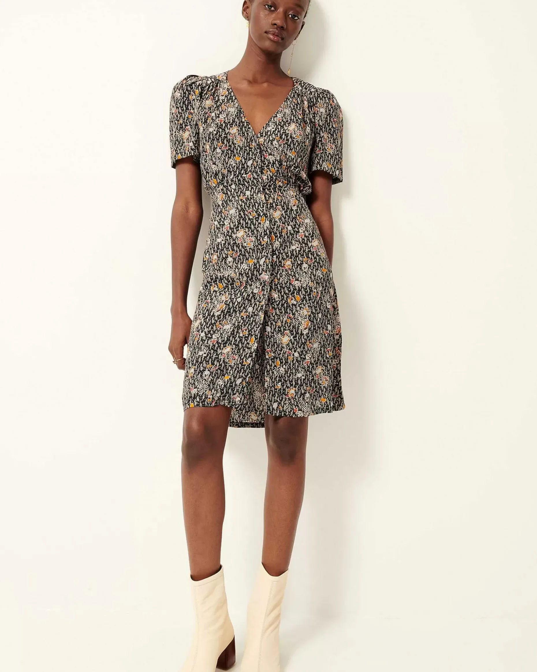 Kurzes, Geknöpftes Kleid Aus Fließendem Und Luftigem, Bedrucktem Viskosegewebe, Exklusives Sessùn-Muster.