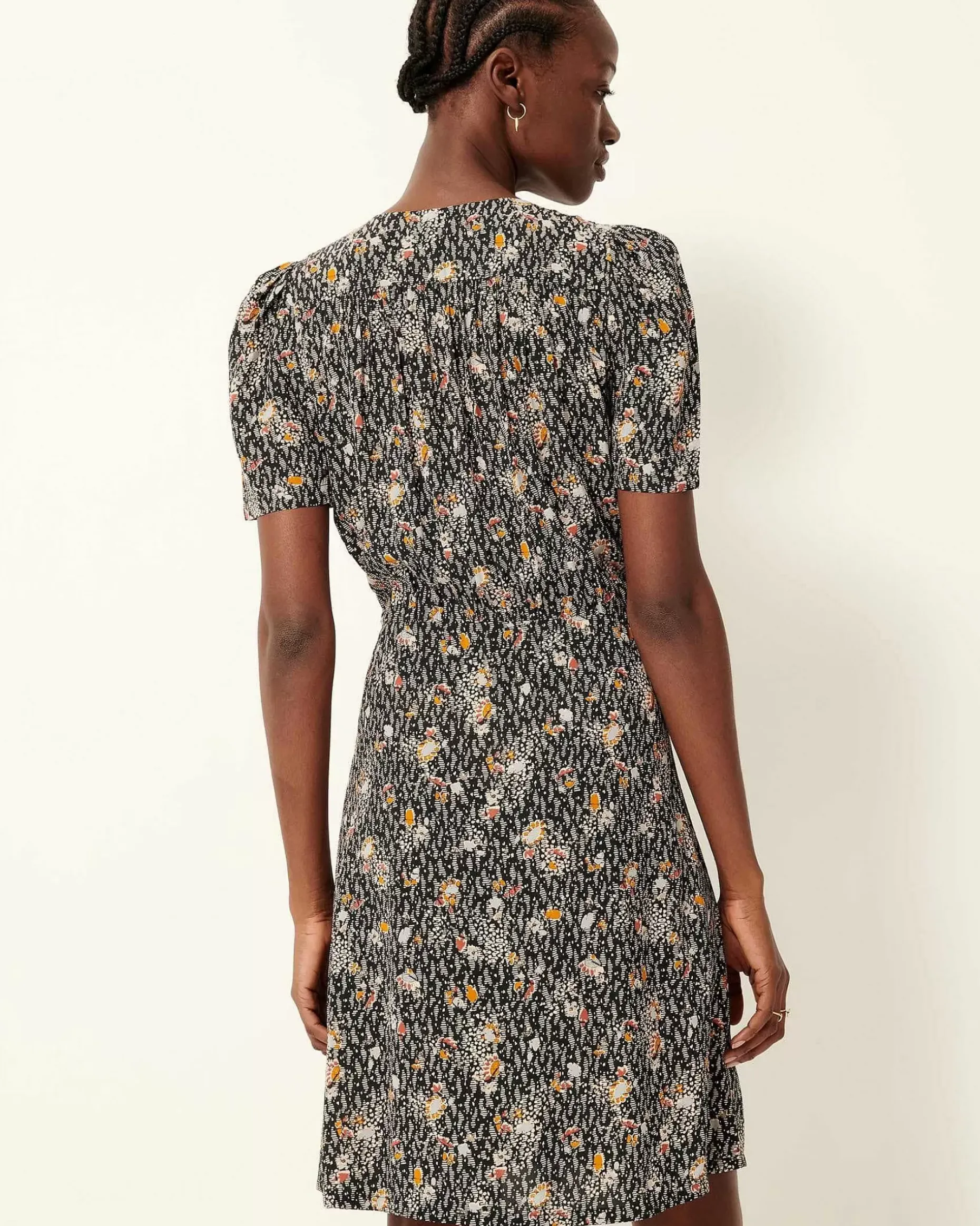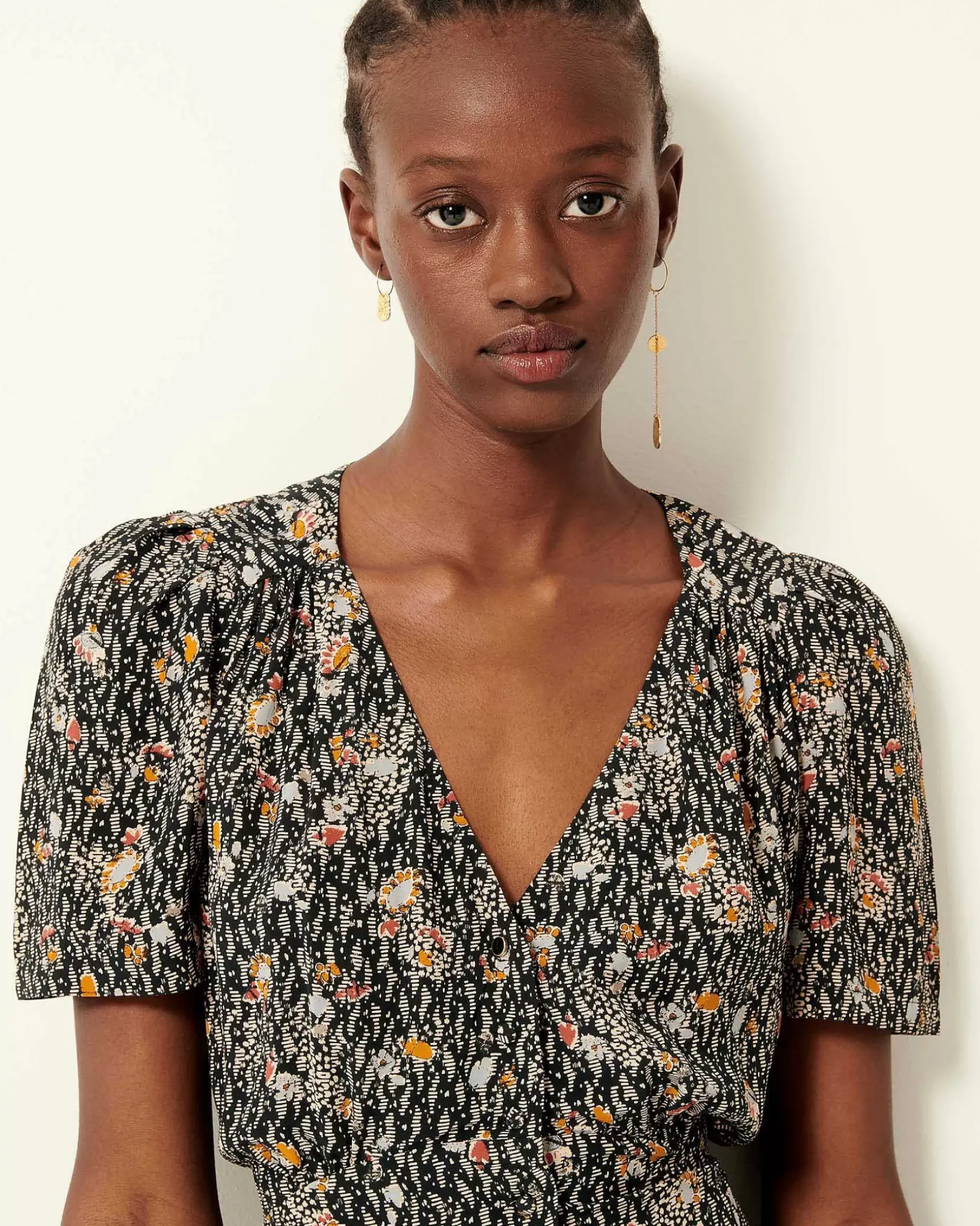 Kurzes, Geknöpftes Kleid Aus Fließendem Und Luftigem, Bedrucktem Viskosegewebe, Exklusives Sessùn-Muster.Die Für Die Herstellung Dieses Artikels Verarbeitete Viskose Wurde Aus Holz Aus Zertifiziert Nachhaltiger Und Im Respektvollen Umgang Mit Ressourcen…