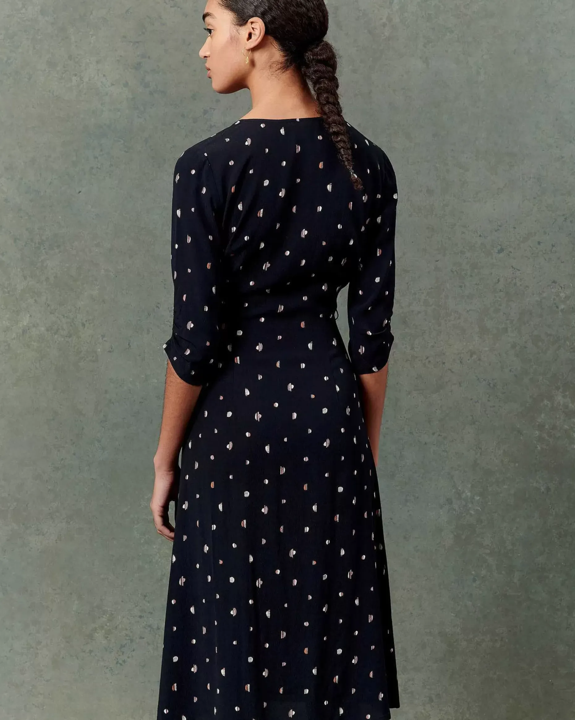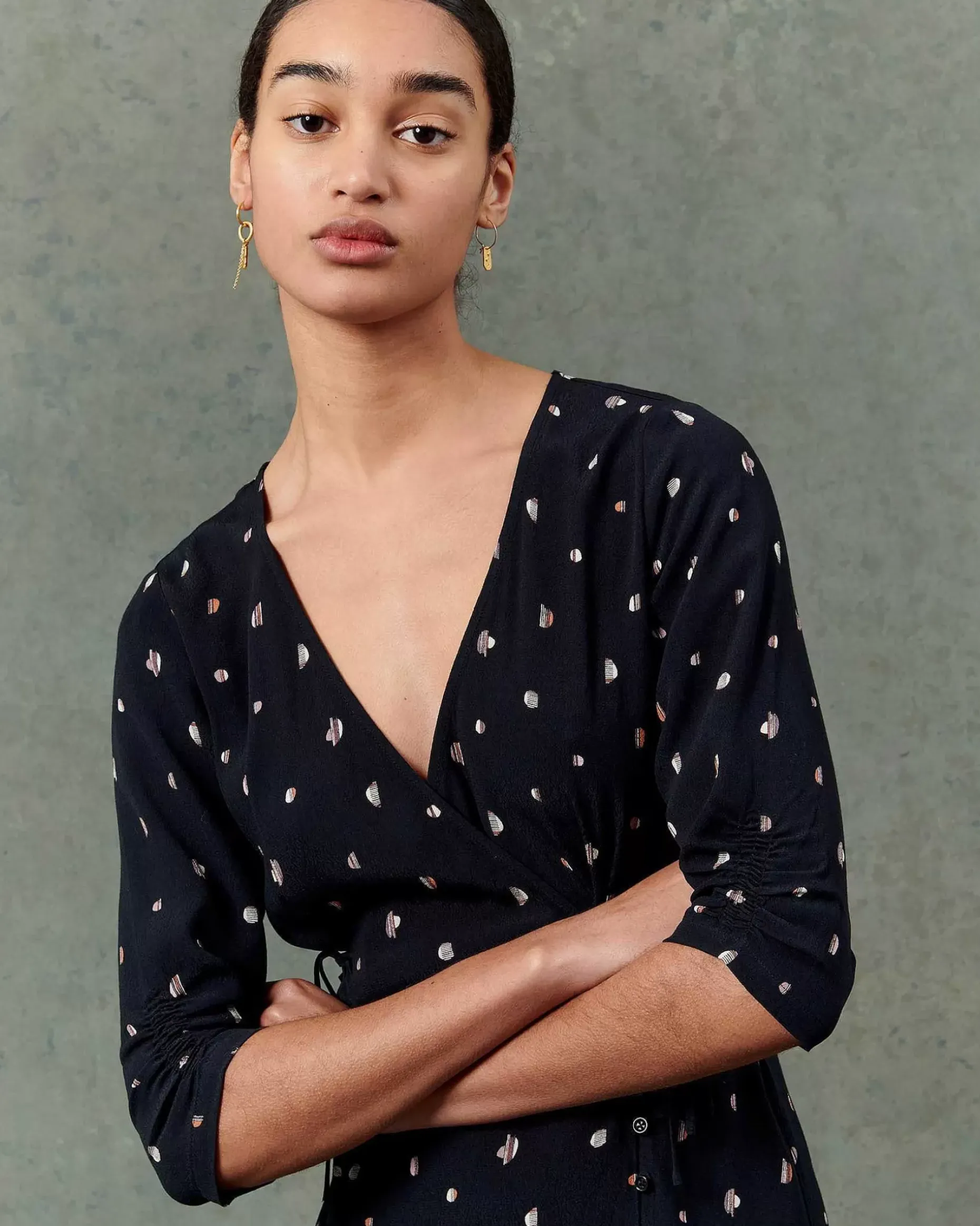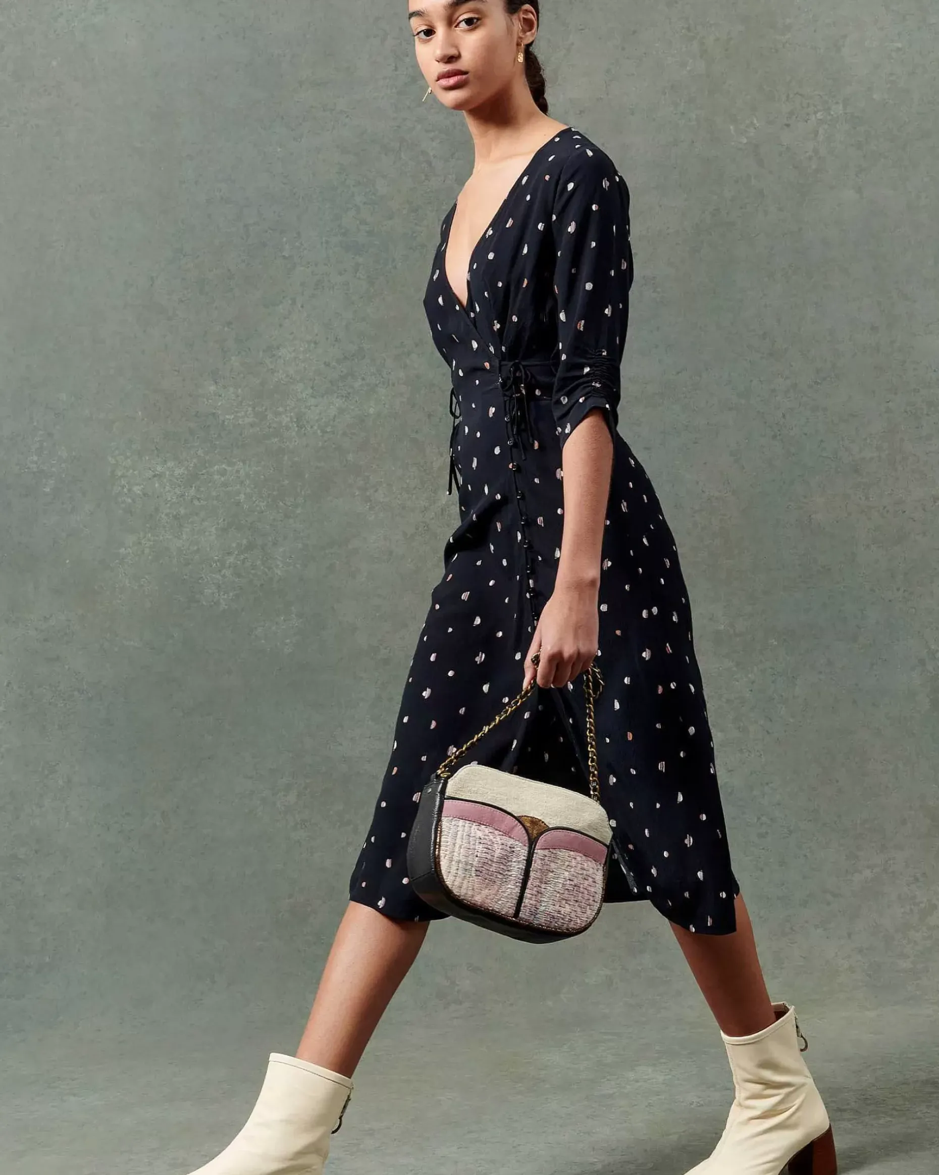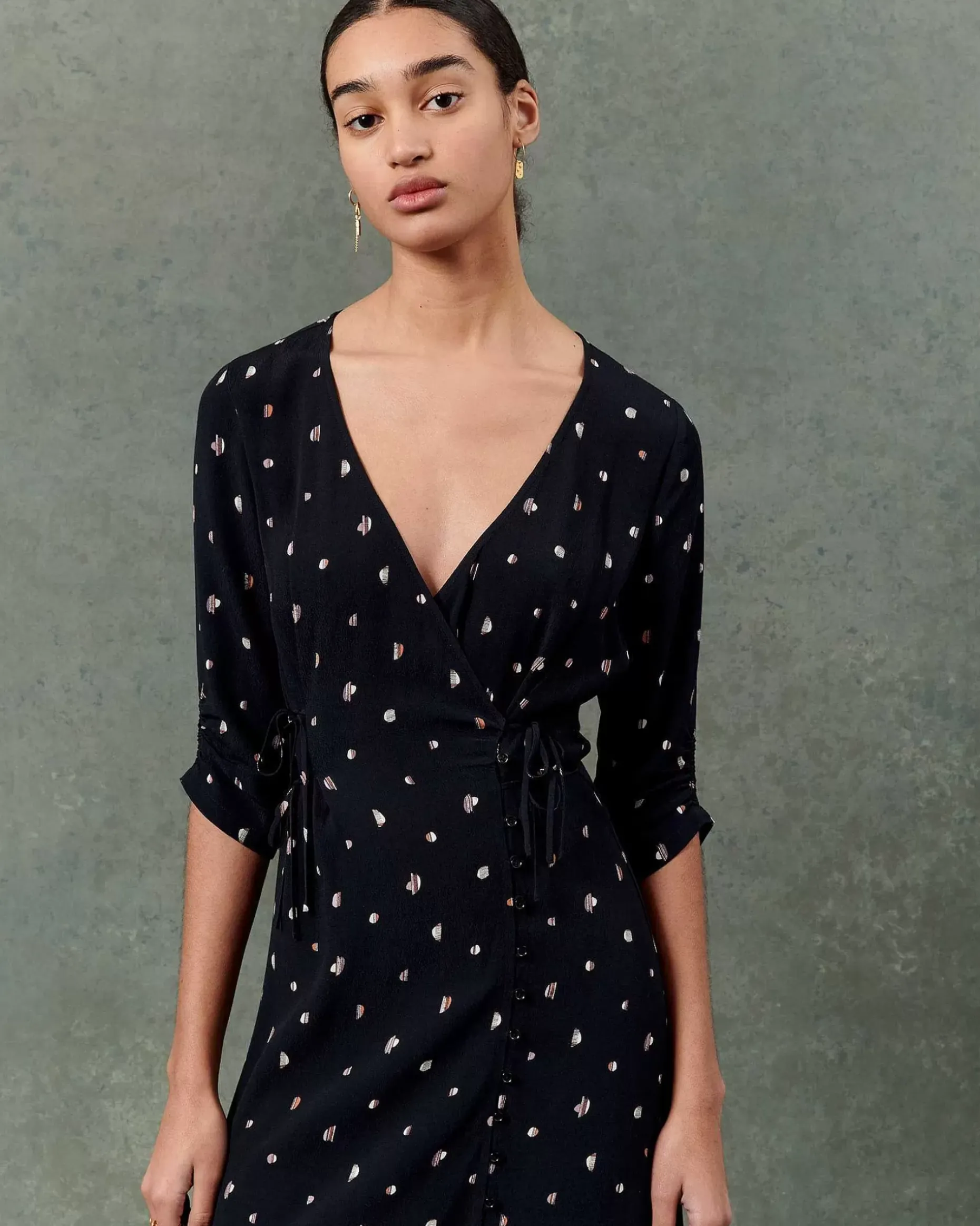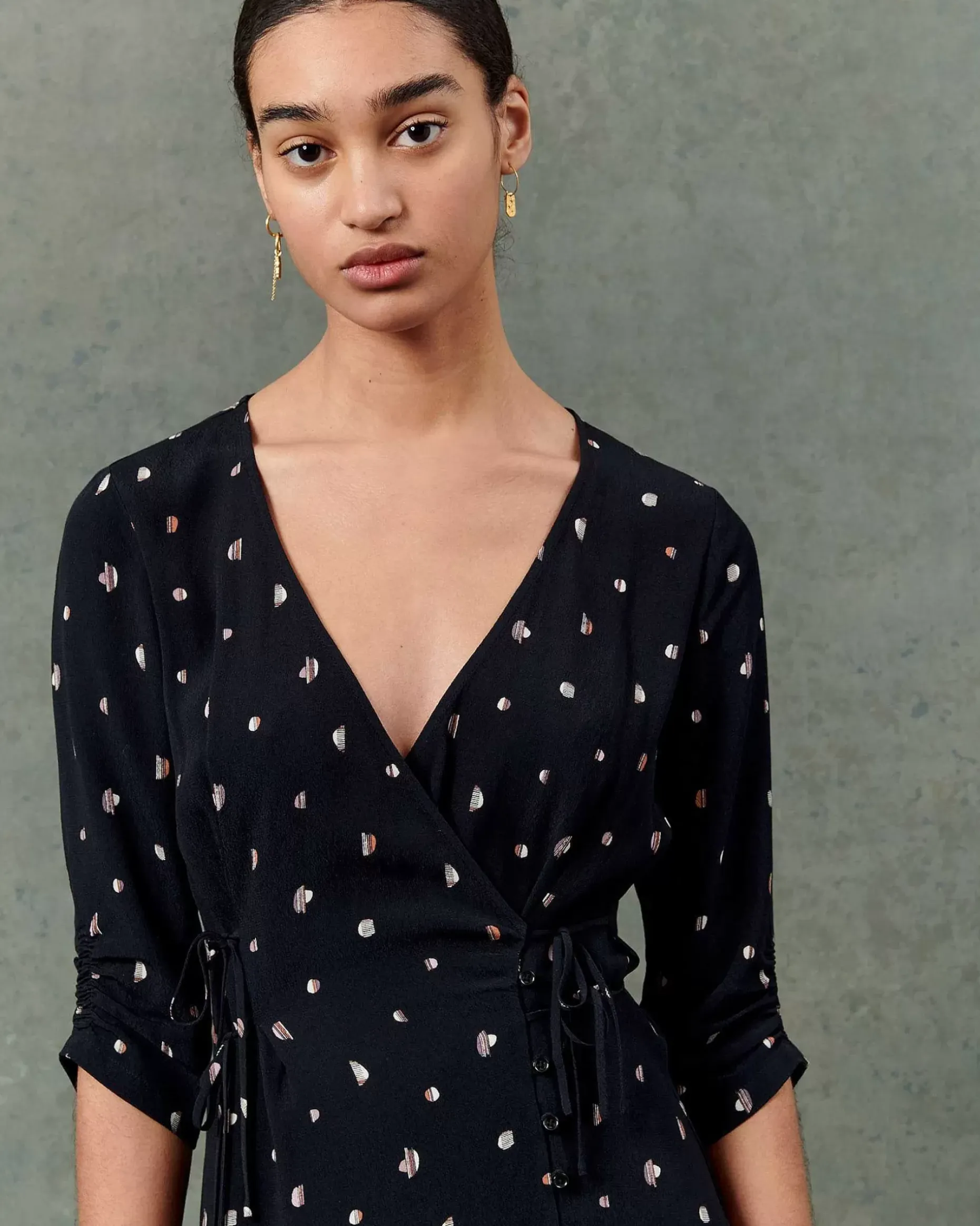 Halblanges Wickelkleid Mit Bindebädern Aus Bedrucktem Viskosekrepp, Exklusives Sessùn-Muster.