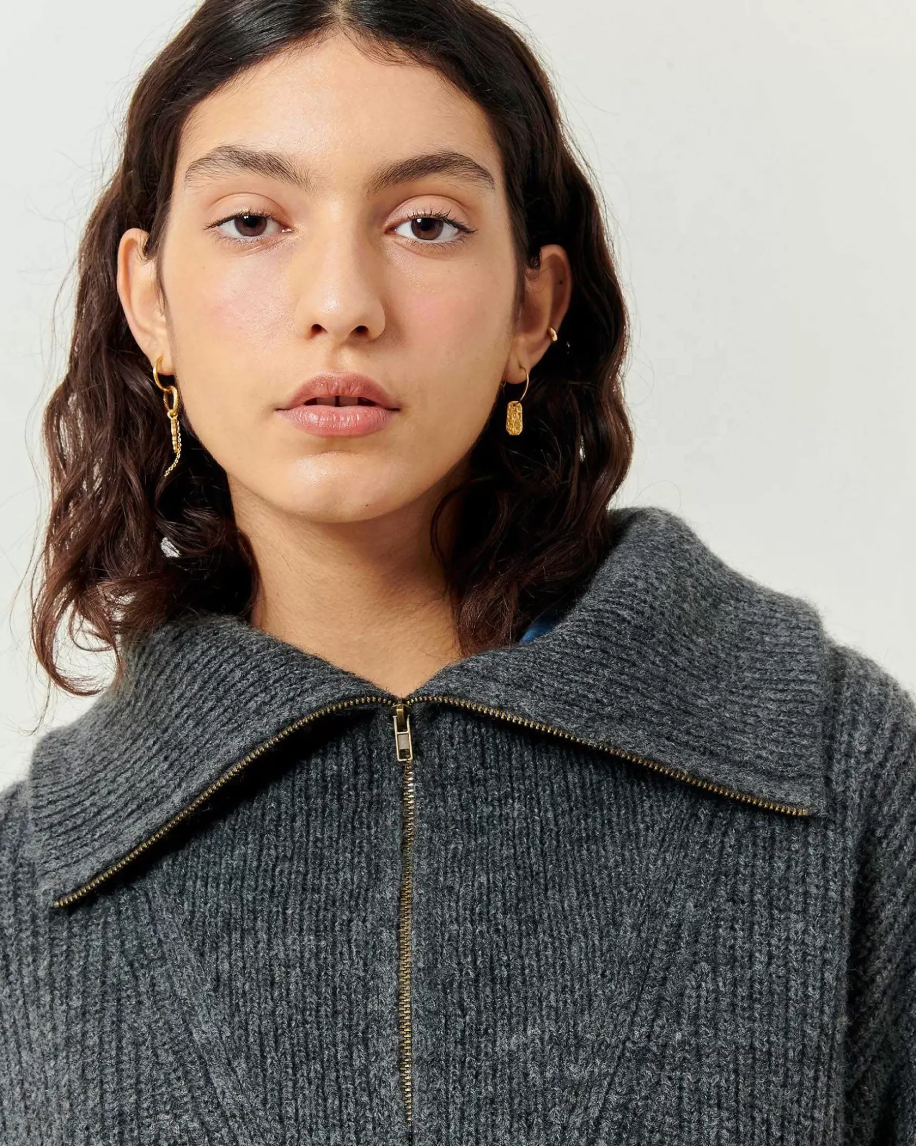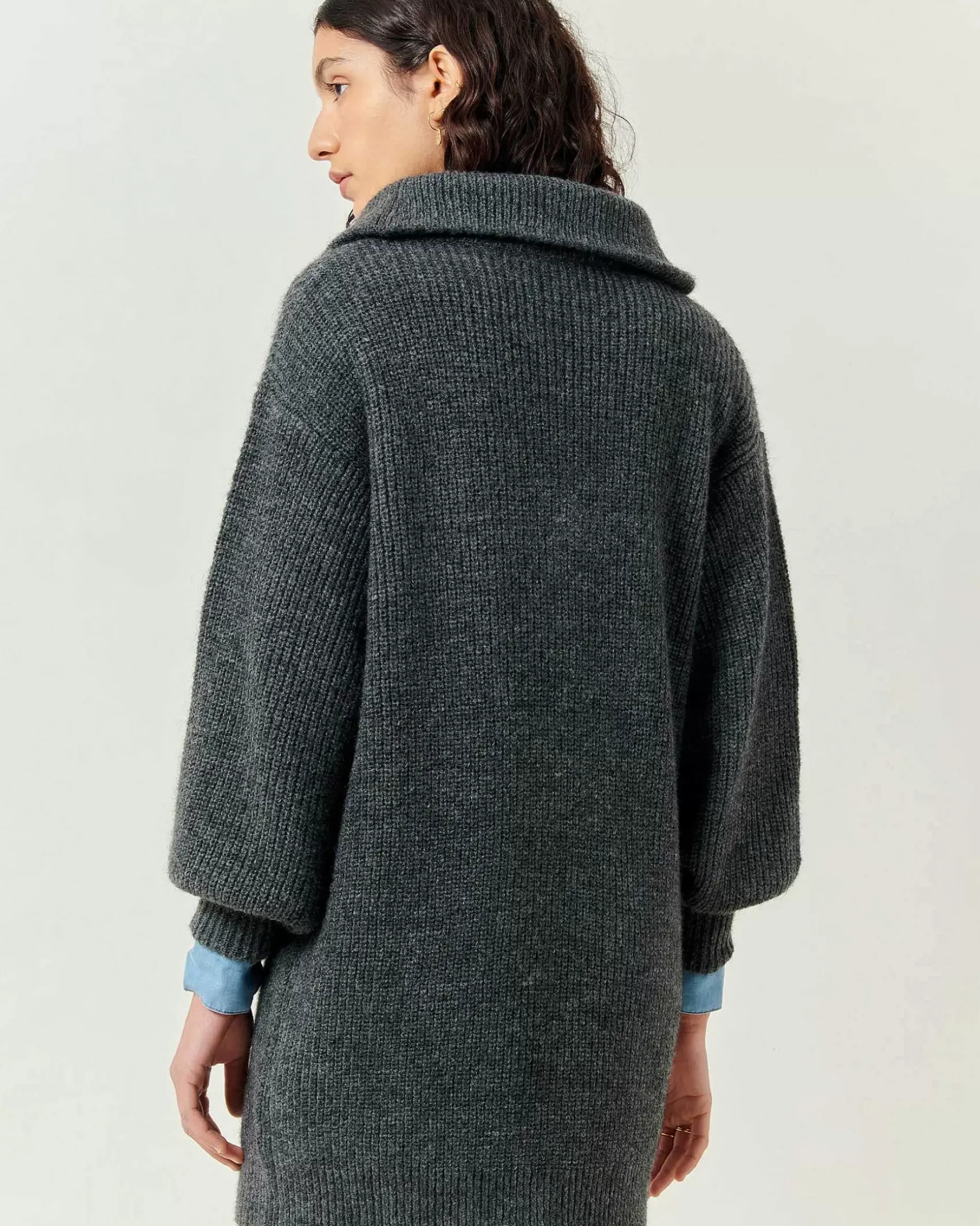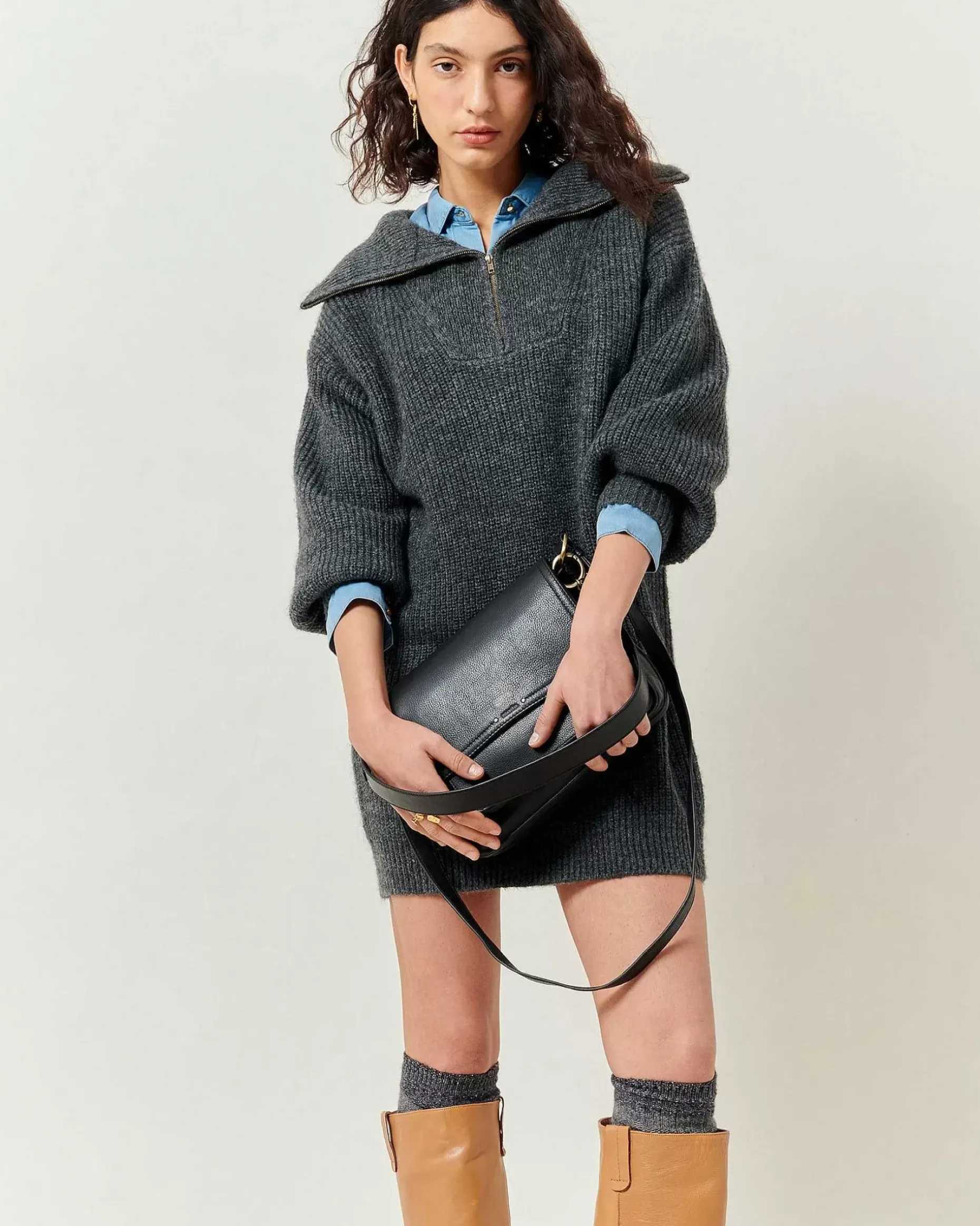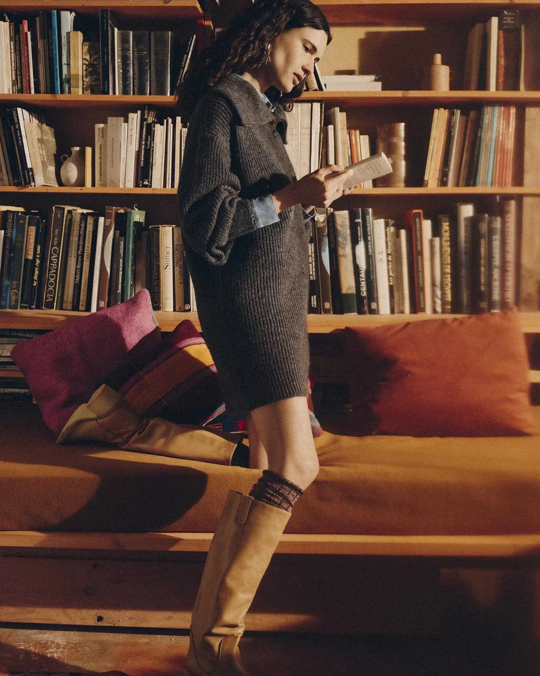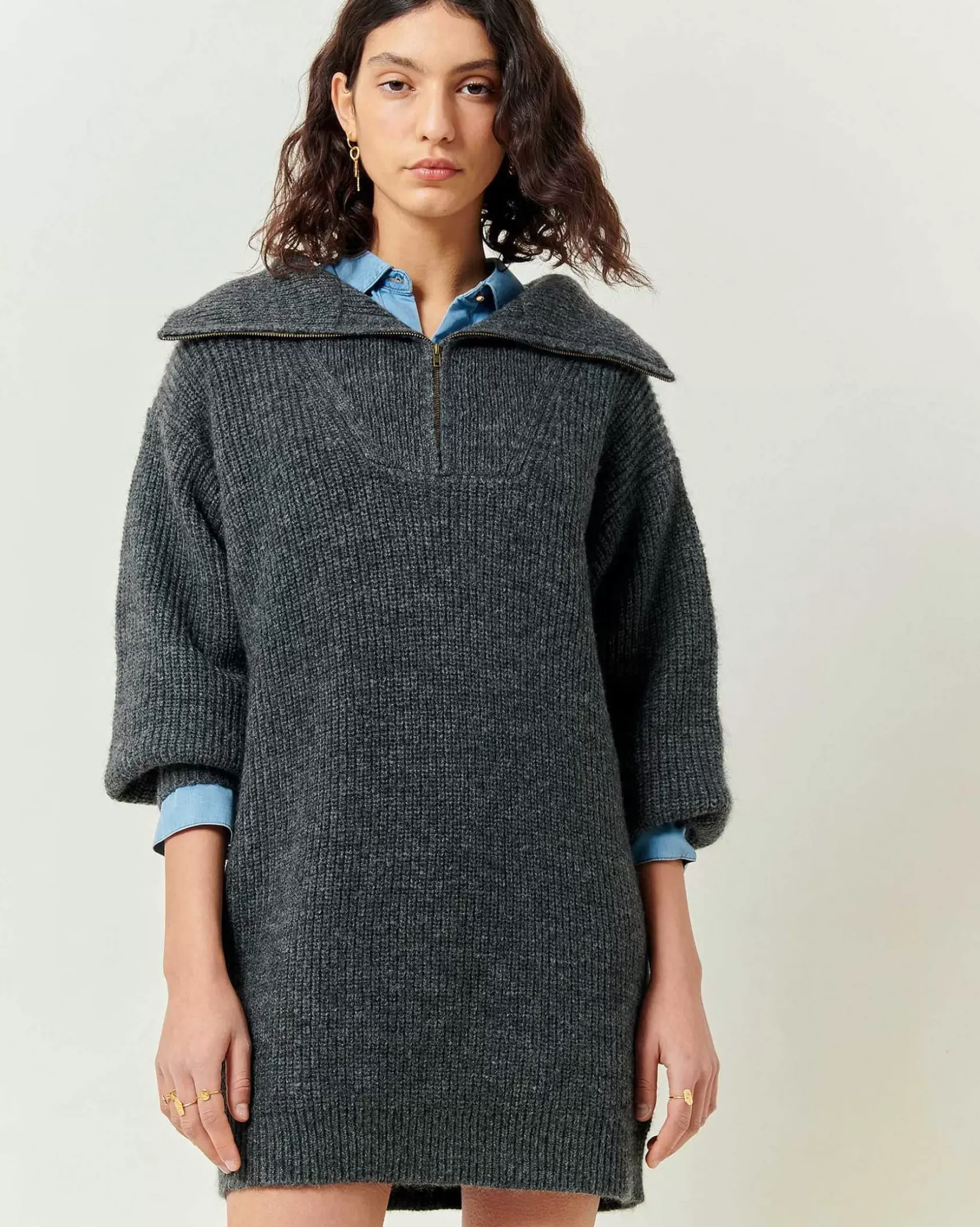 Kurzes Kleid Mit Troyerkragen Aus Flauschigem, Perlenbesetztem Rippstrick.