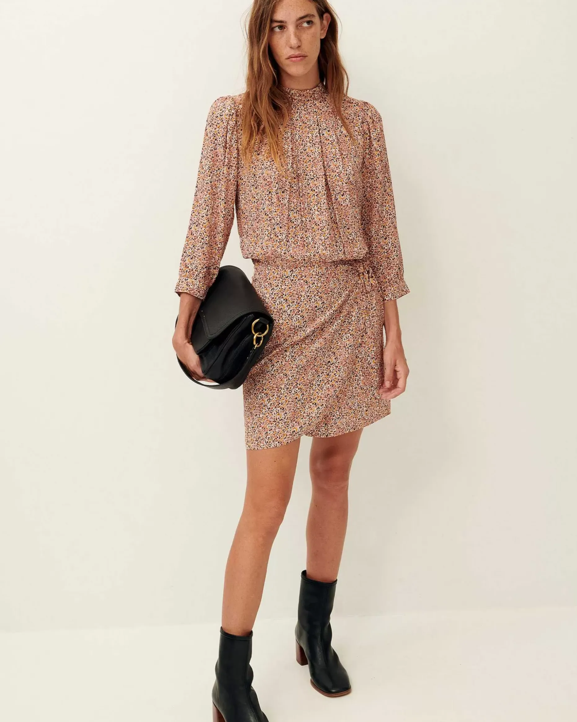 Kurzes, Überkreuztes Kleid Mit Bindebändern Aus Bedrucktem Viskose-Krepp, Exklusives Sessùn-Muster.