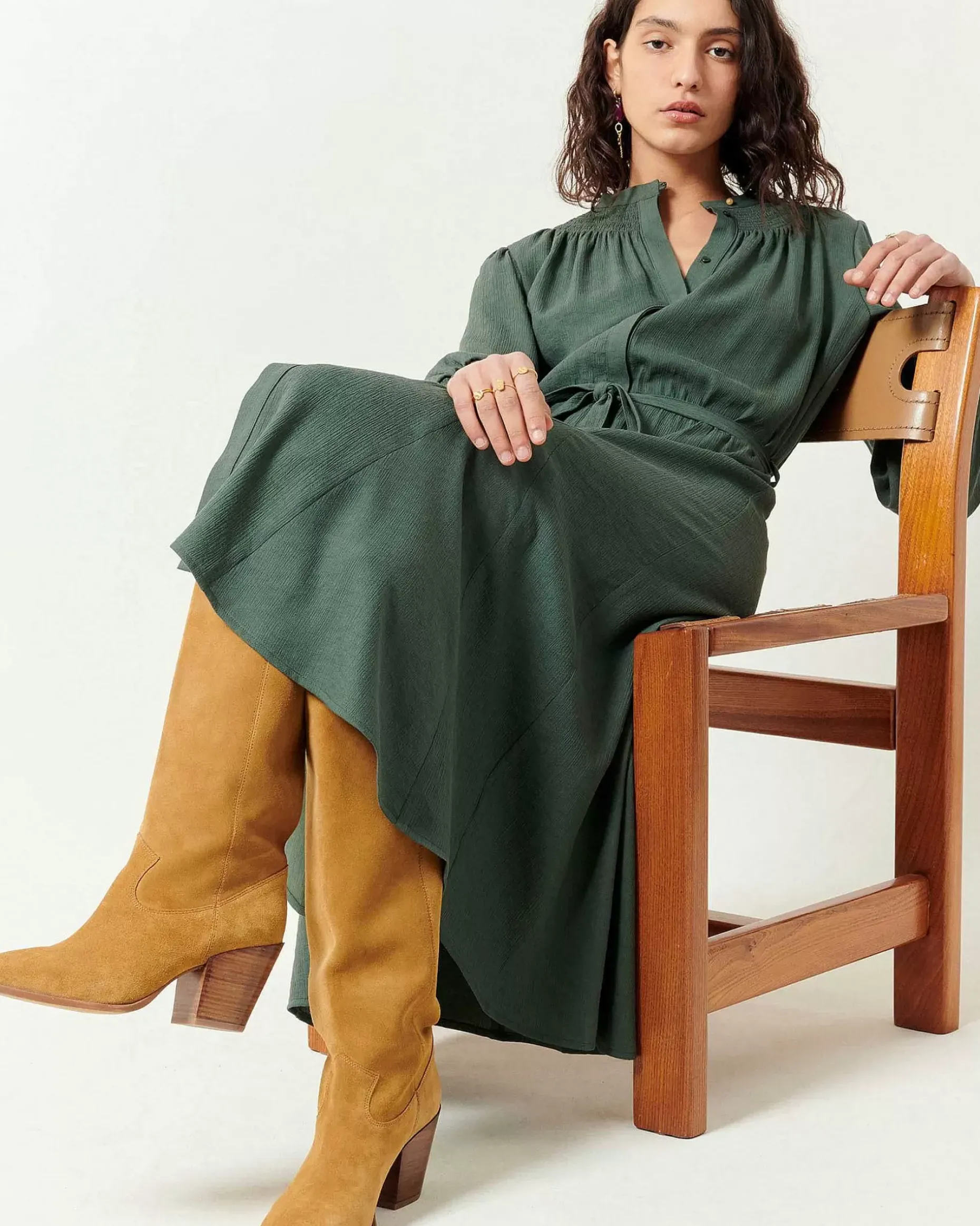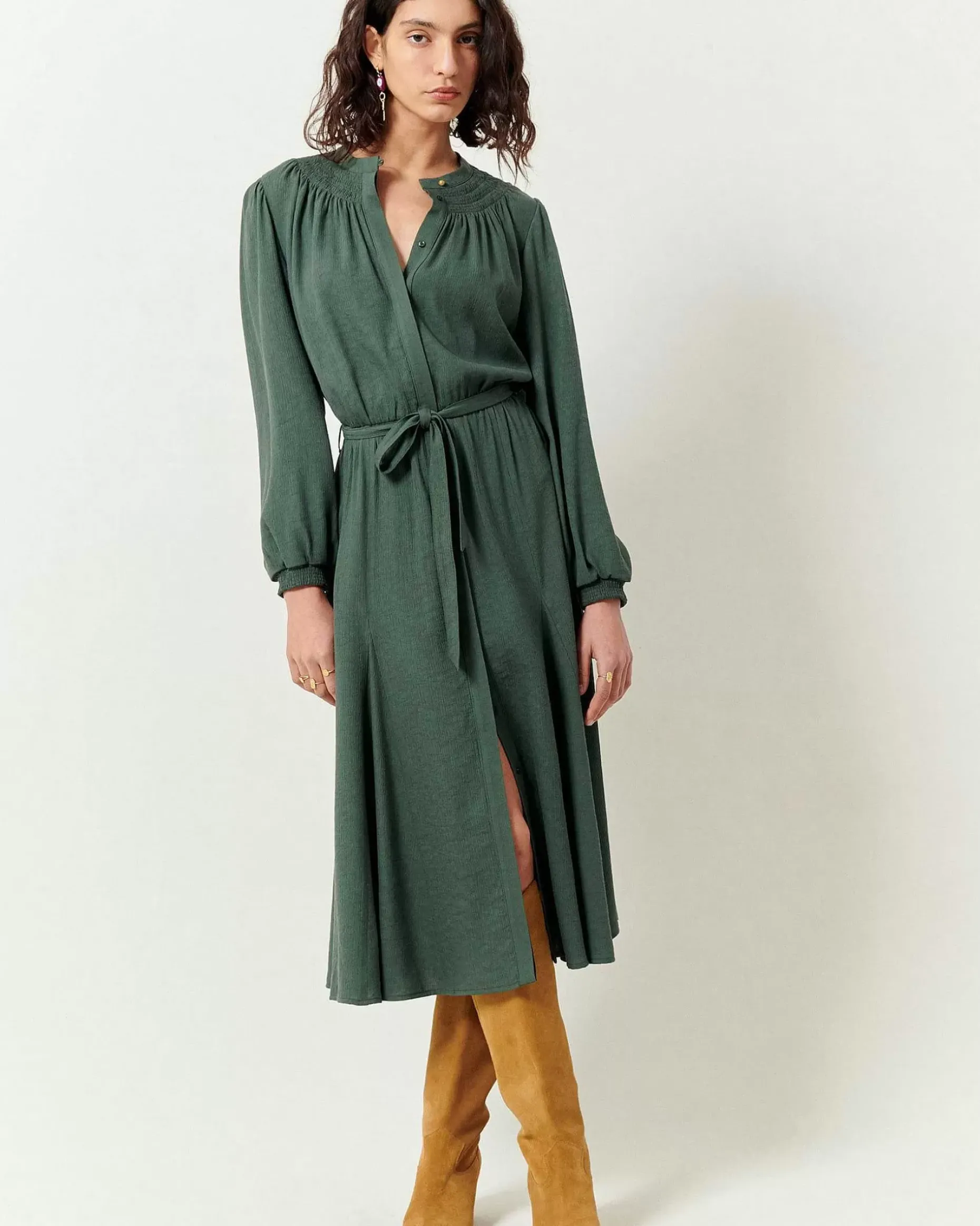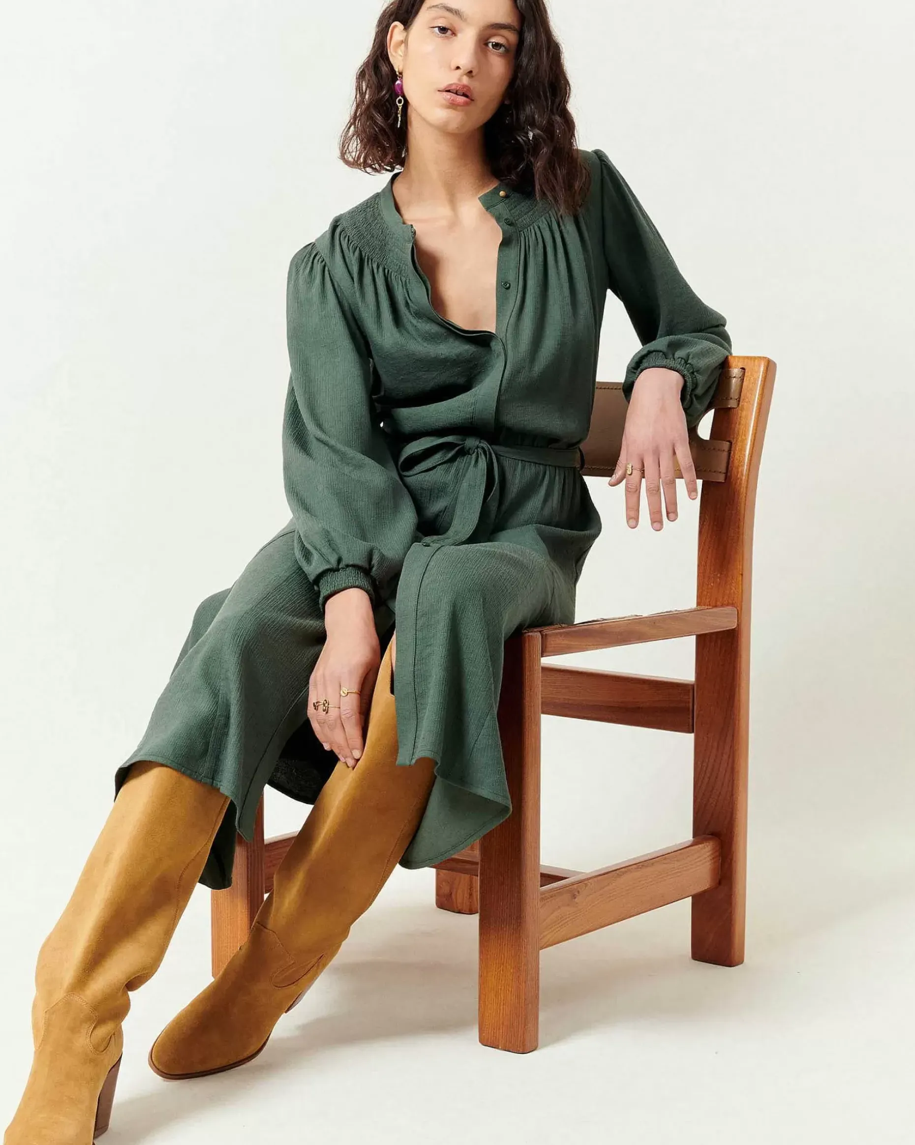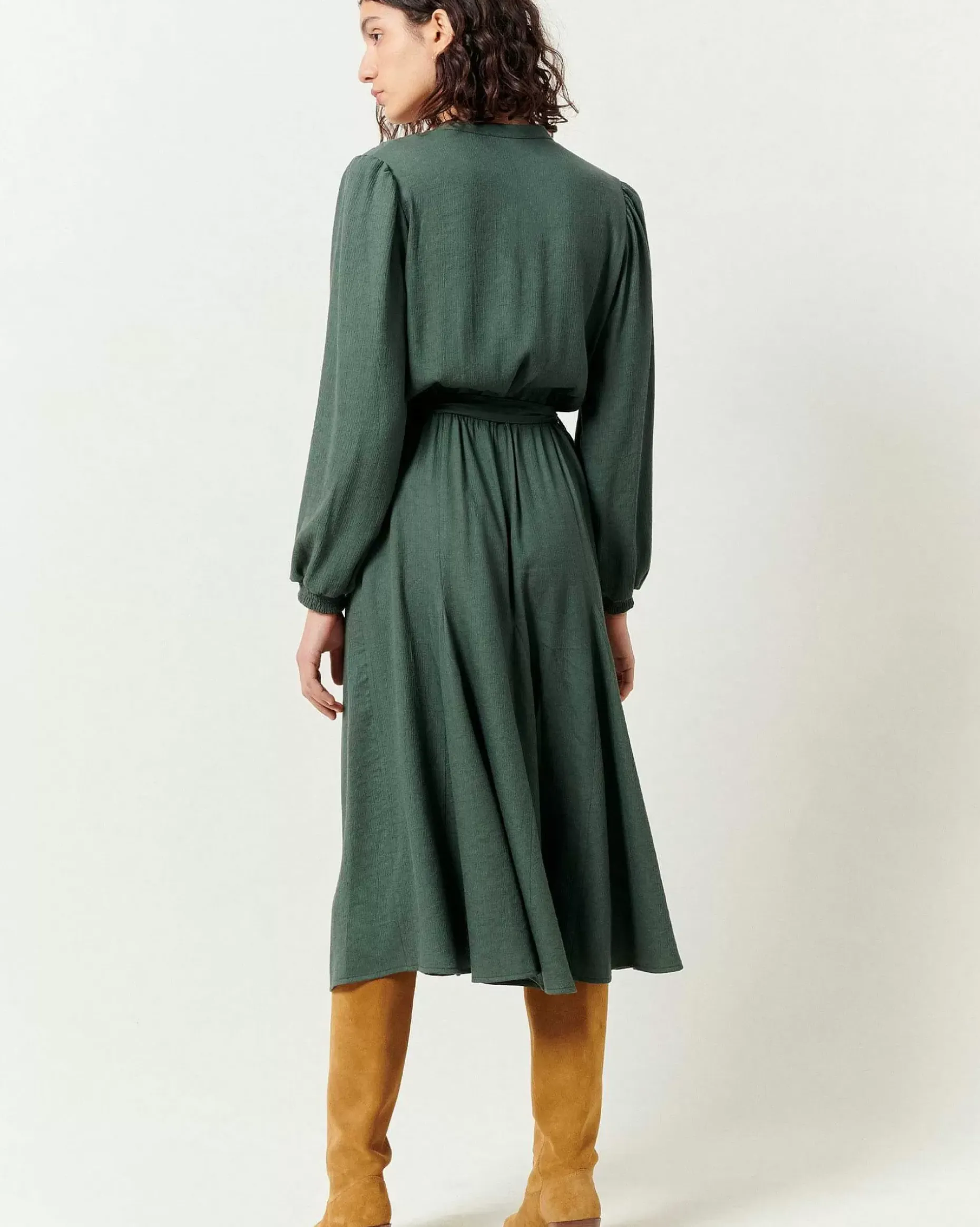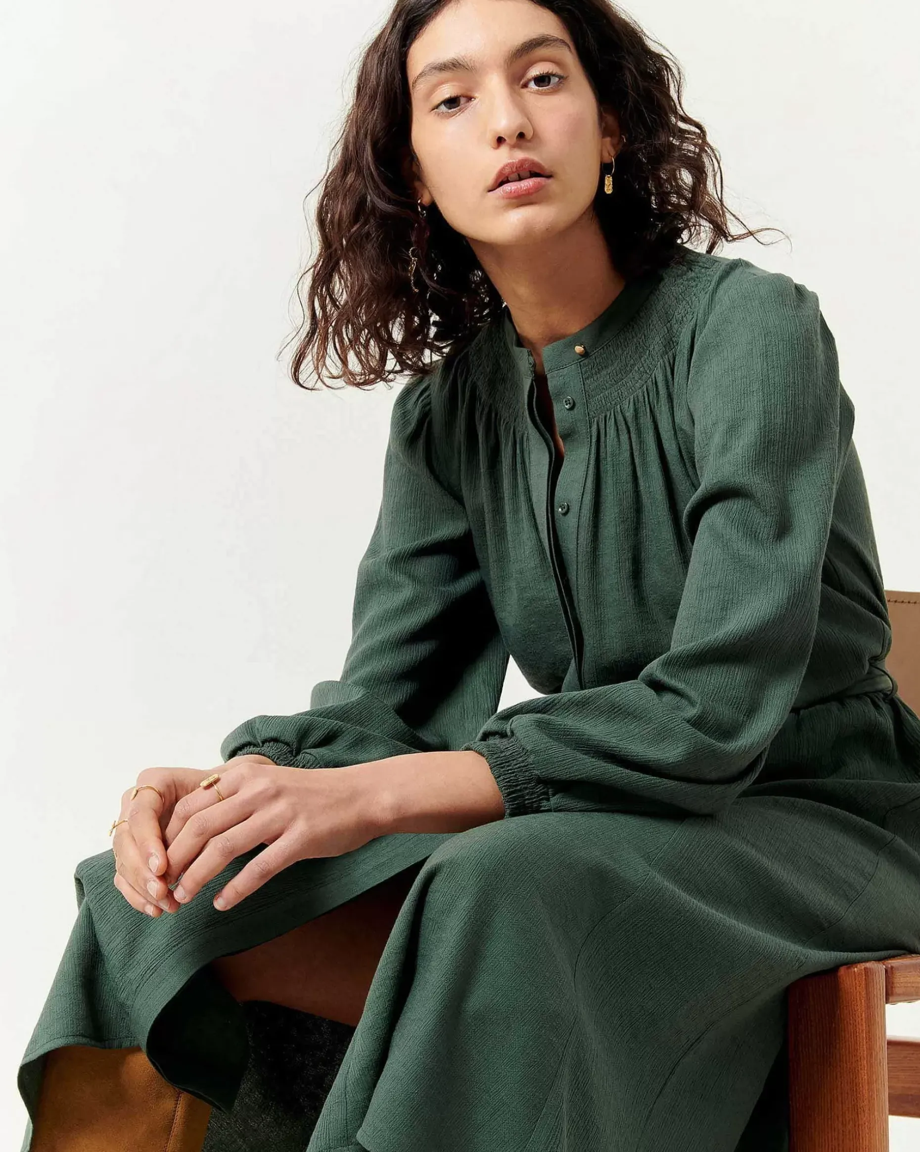 Langes Kleid Mit Godets Am Kleidrock Aus Ton-In-Ton Jacquard-Krepp Aus Viskose. Abgesteppte Raffungen Am Ausschnitt.