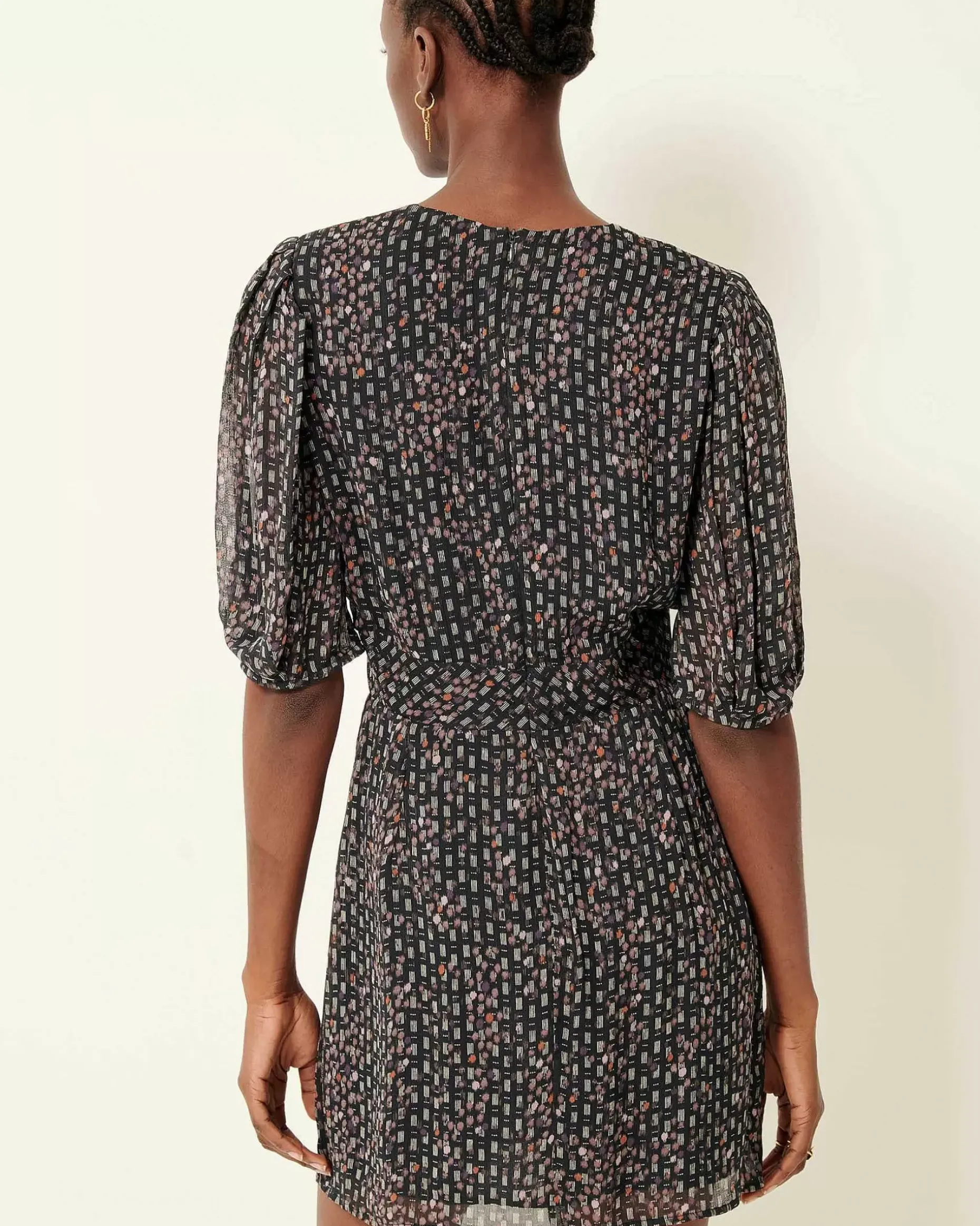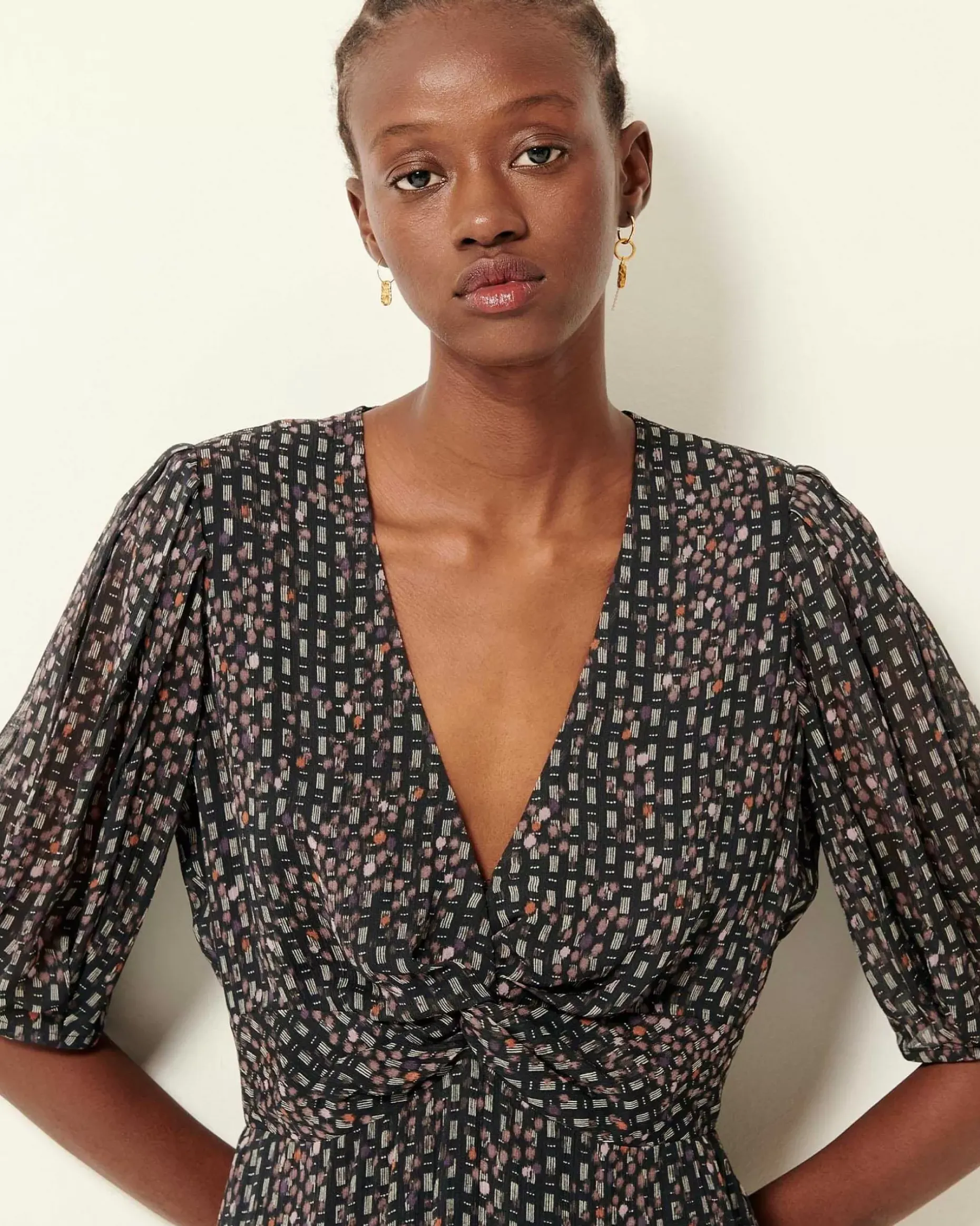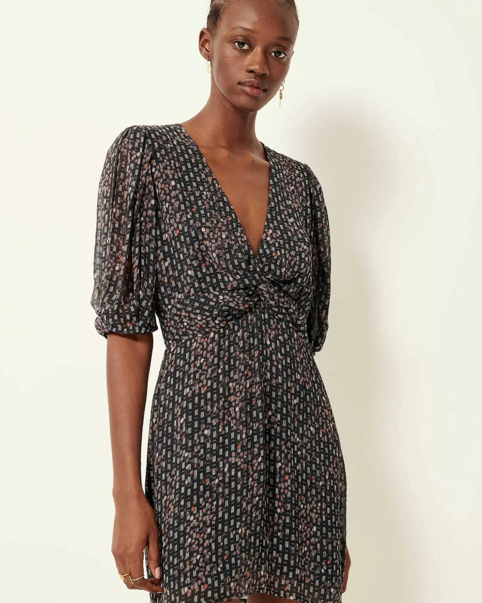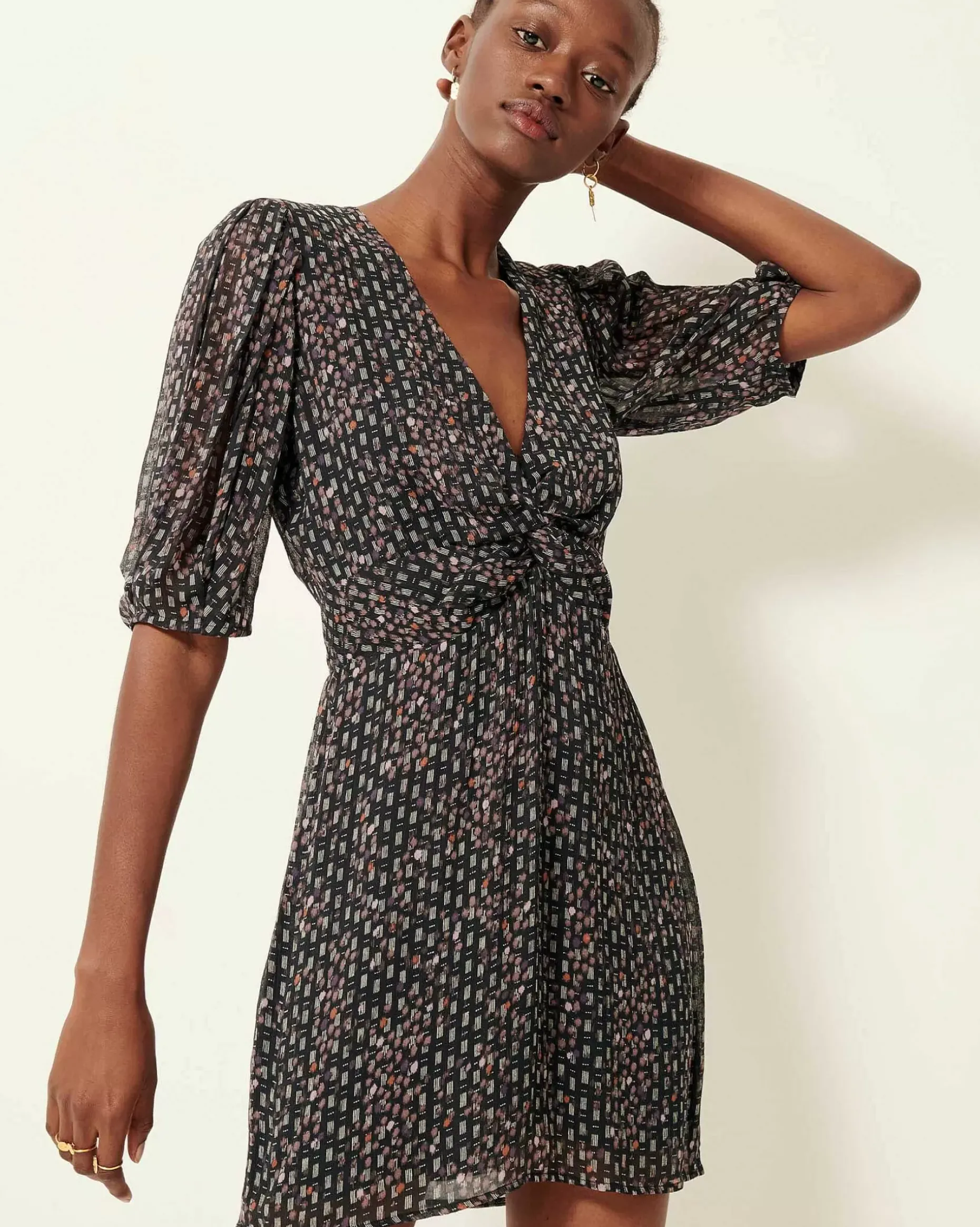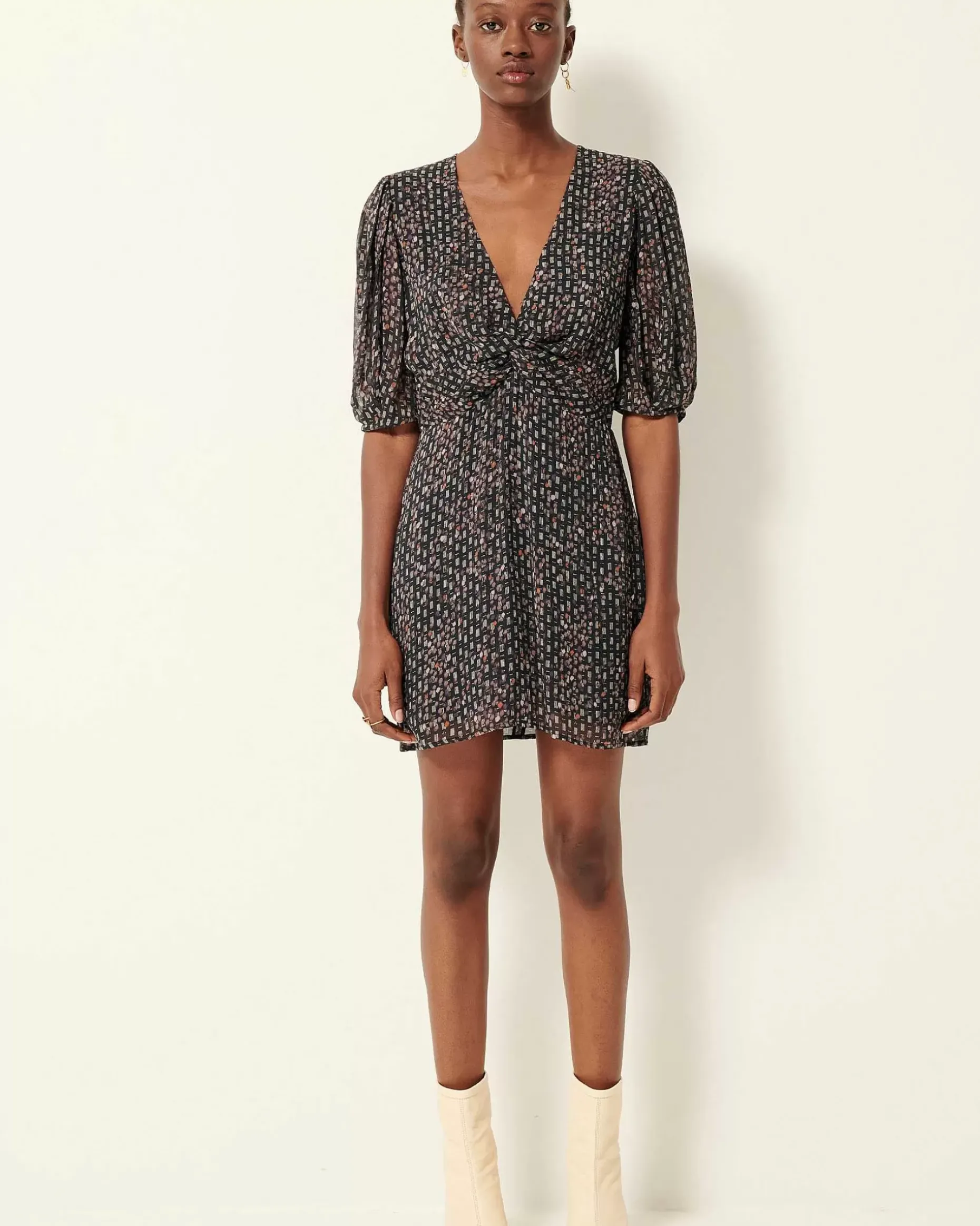 Kurzes, Vorn Geknotetes Kleid Aus Bedrucktem Viskose-Musselinkrepp, Exklusives Sessùn-Muster.