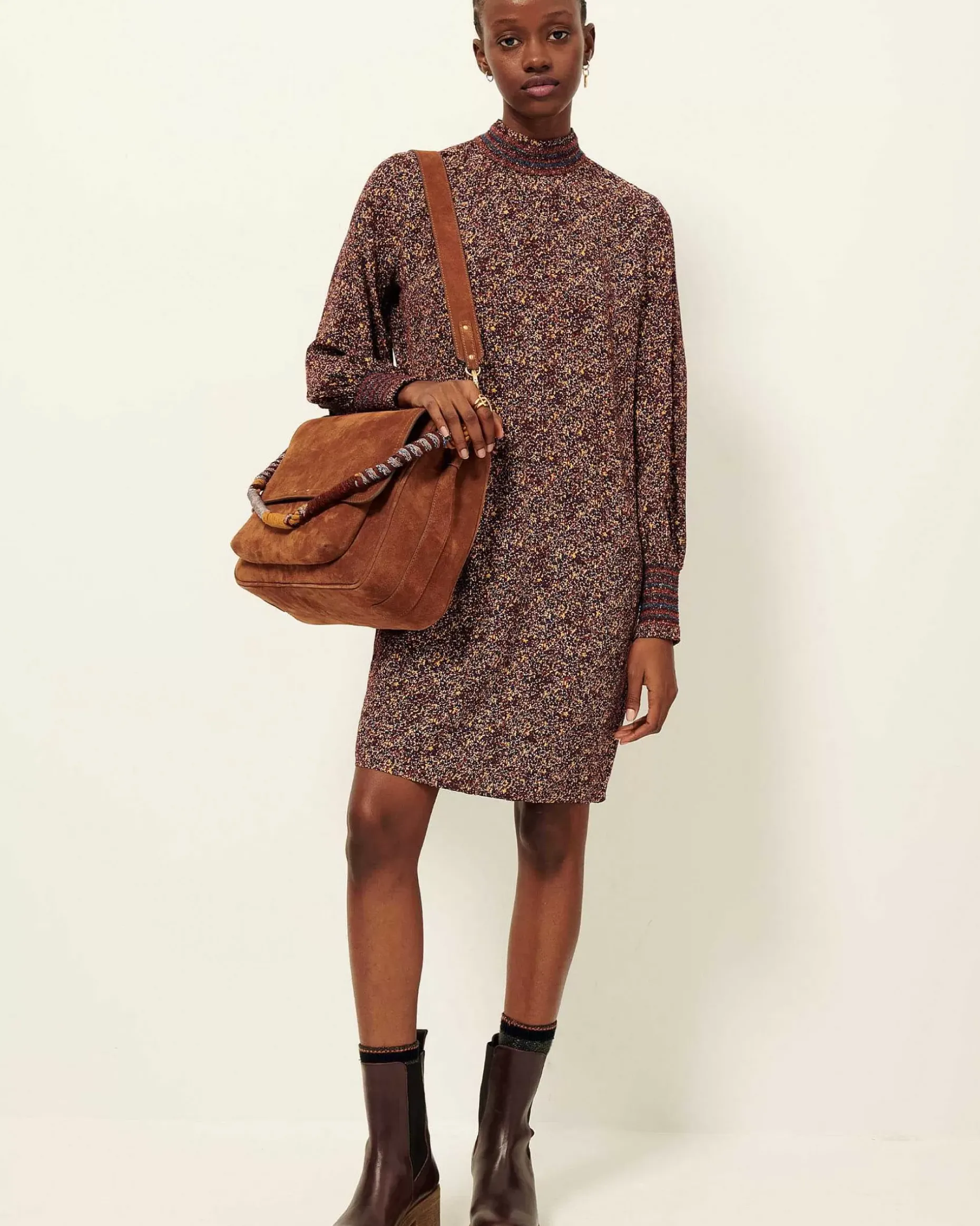 Gerade Geschnittenes Kleid Mit Ballonärmeln Aus Gemustertem Viskose-Krepp, Exklusives Sessùn-Muster.