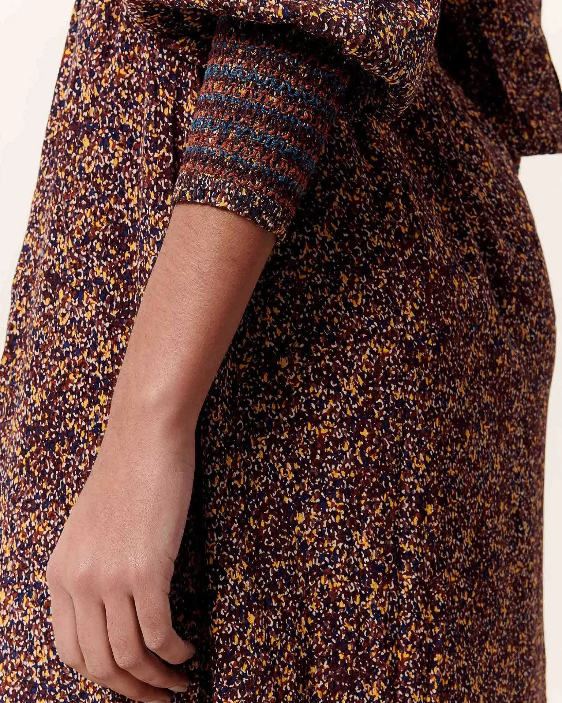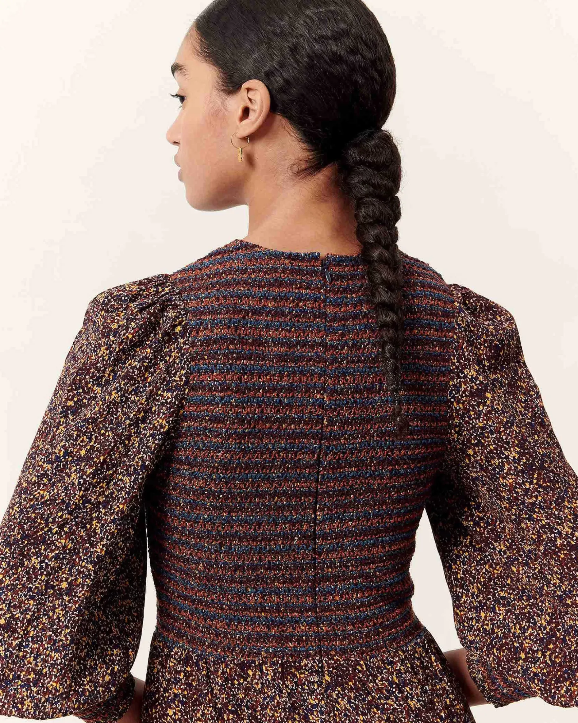 Gesmoktes Kleid Mit Ballonärmel Aus Gemustertem Viskose-Krepp, Exklusives Sessùn-Muster.