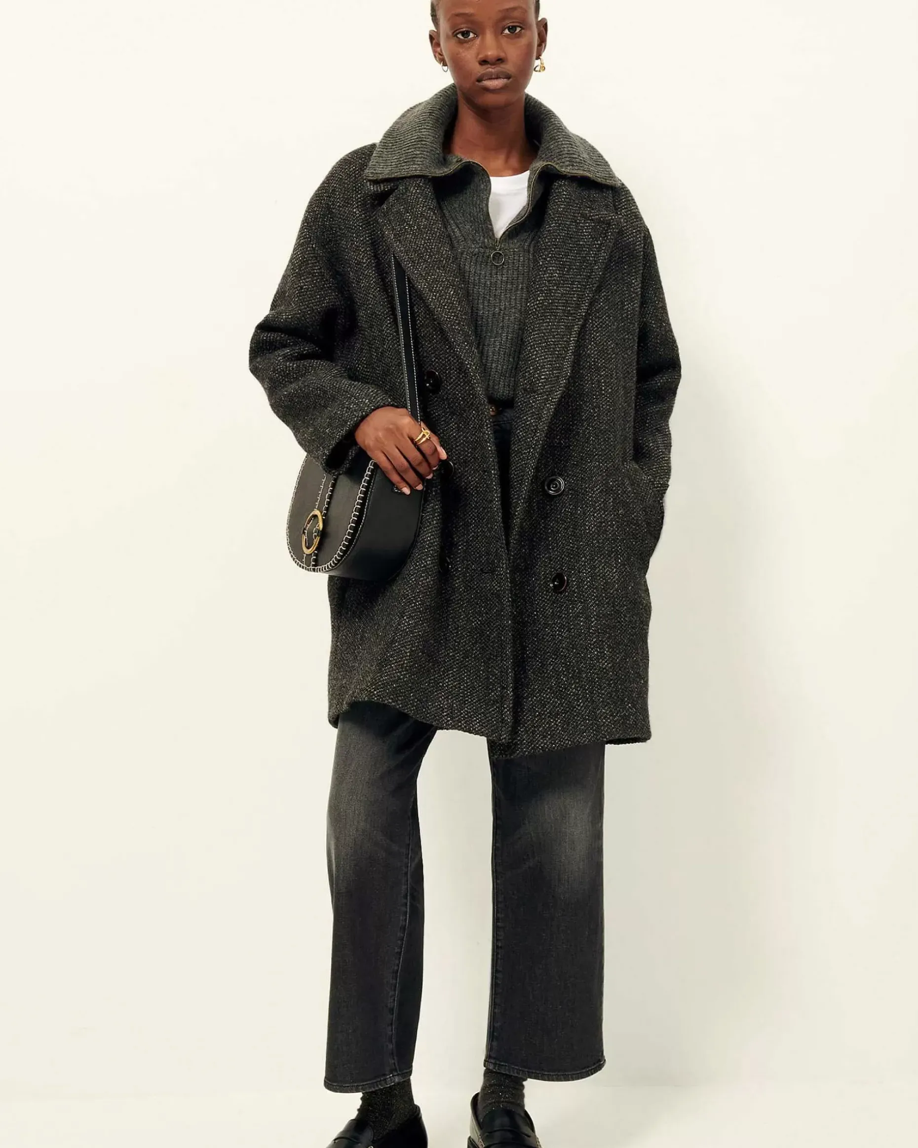 Weit Geschnittener Mantel Mit Doppelter Knopfleiste Aus Zweifarbigem Natté Aus Bouclé-Garnen, Italienische Webarbeit.