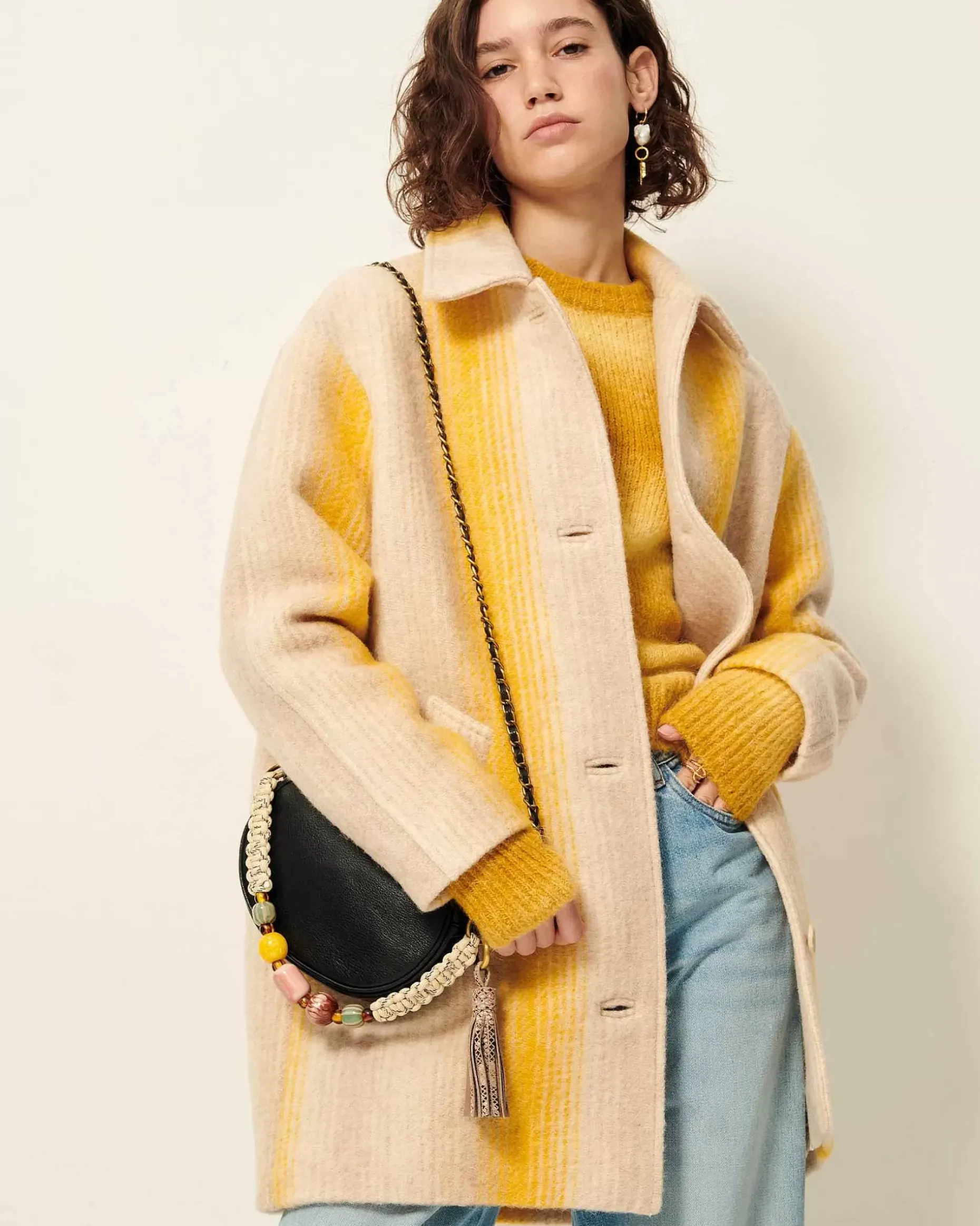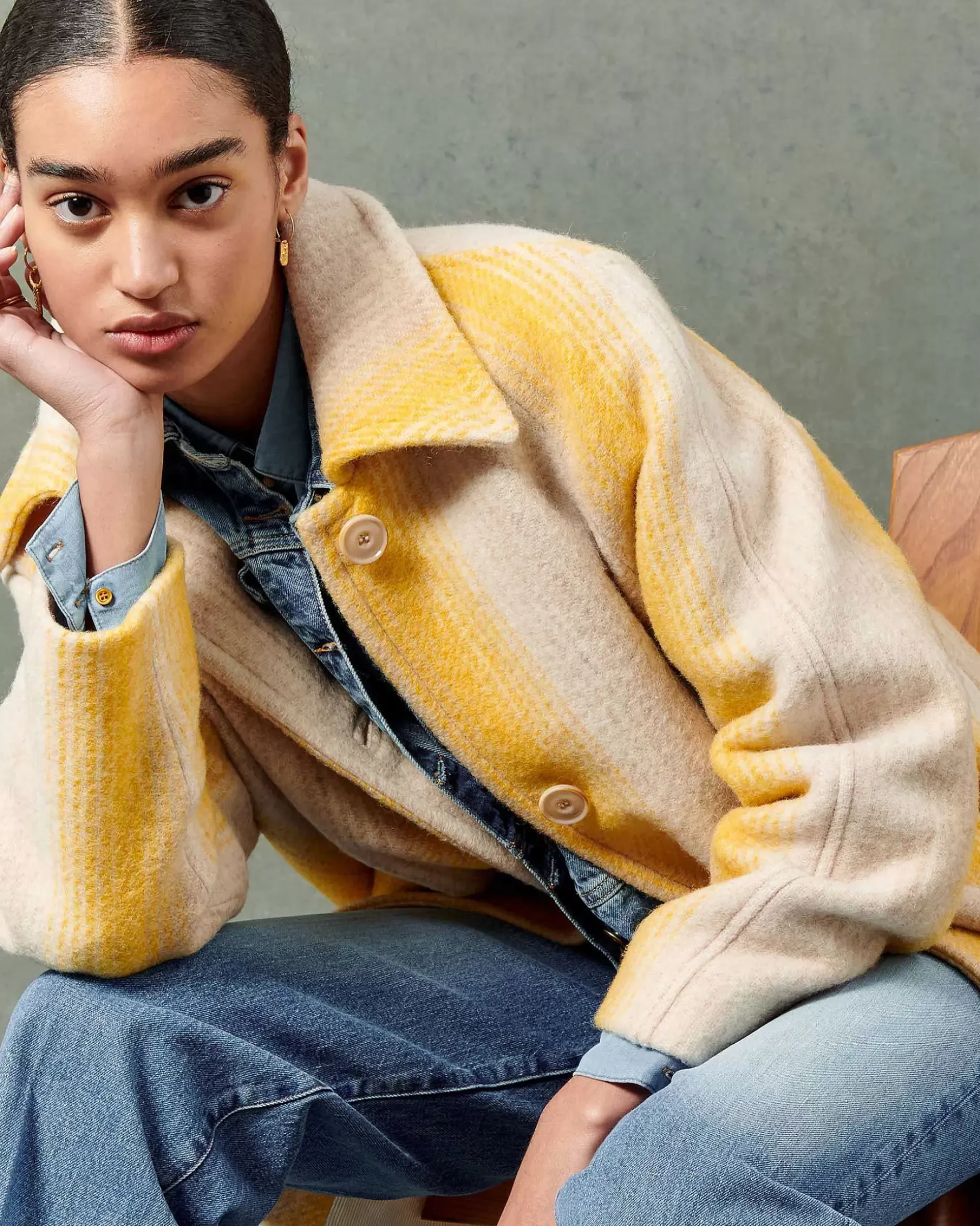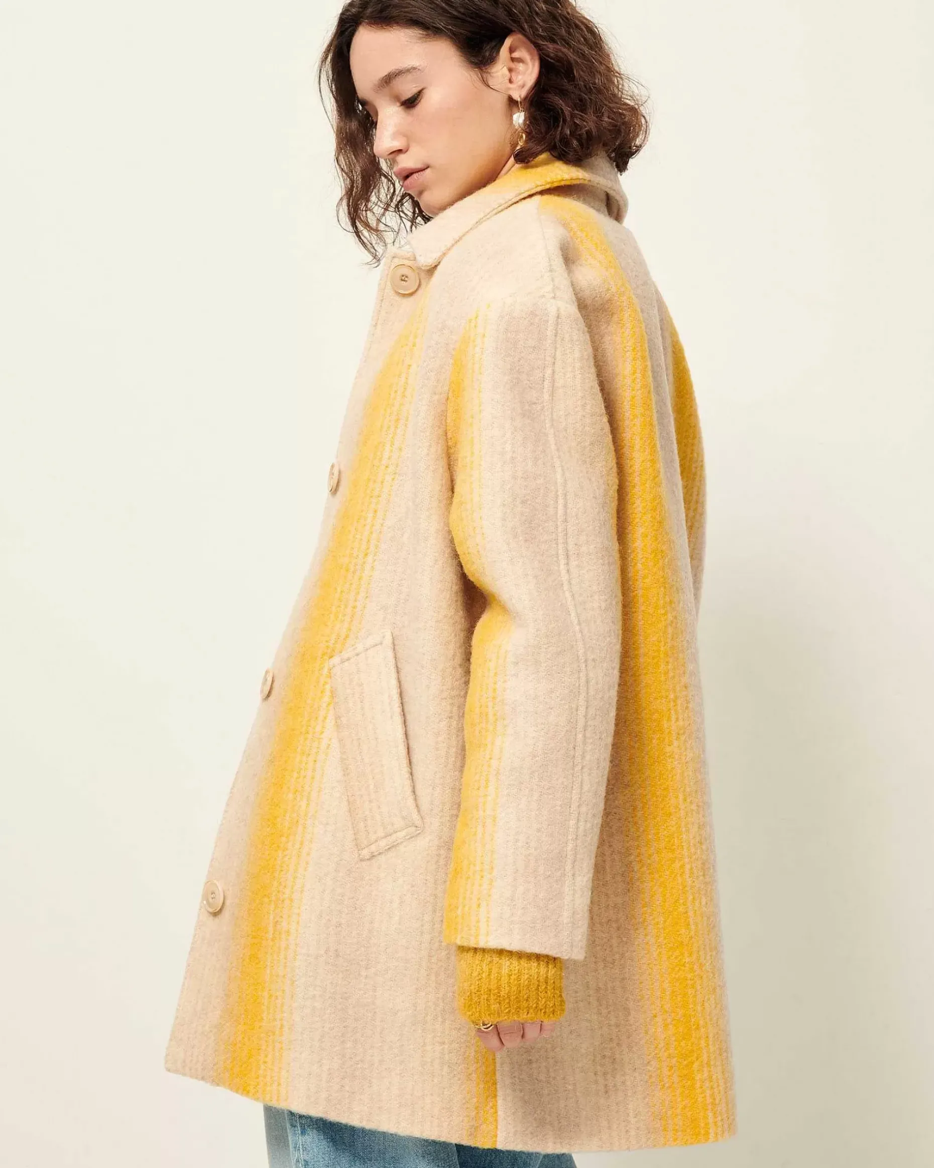 3/4-Langer Mantel Mit Raglanärmeln Aus Flauschigem Schurwollgewebe Mit Breiten, Fantasievoll Gestalteten Streifen, Italienische Webarbeit.