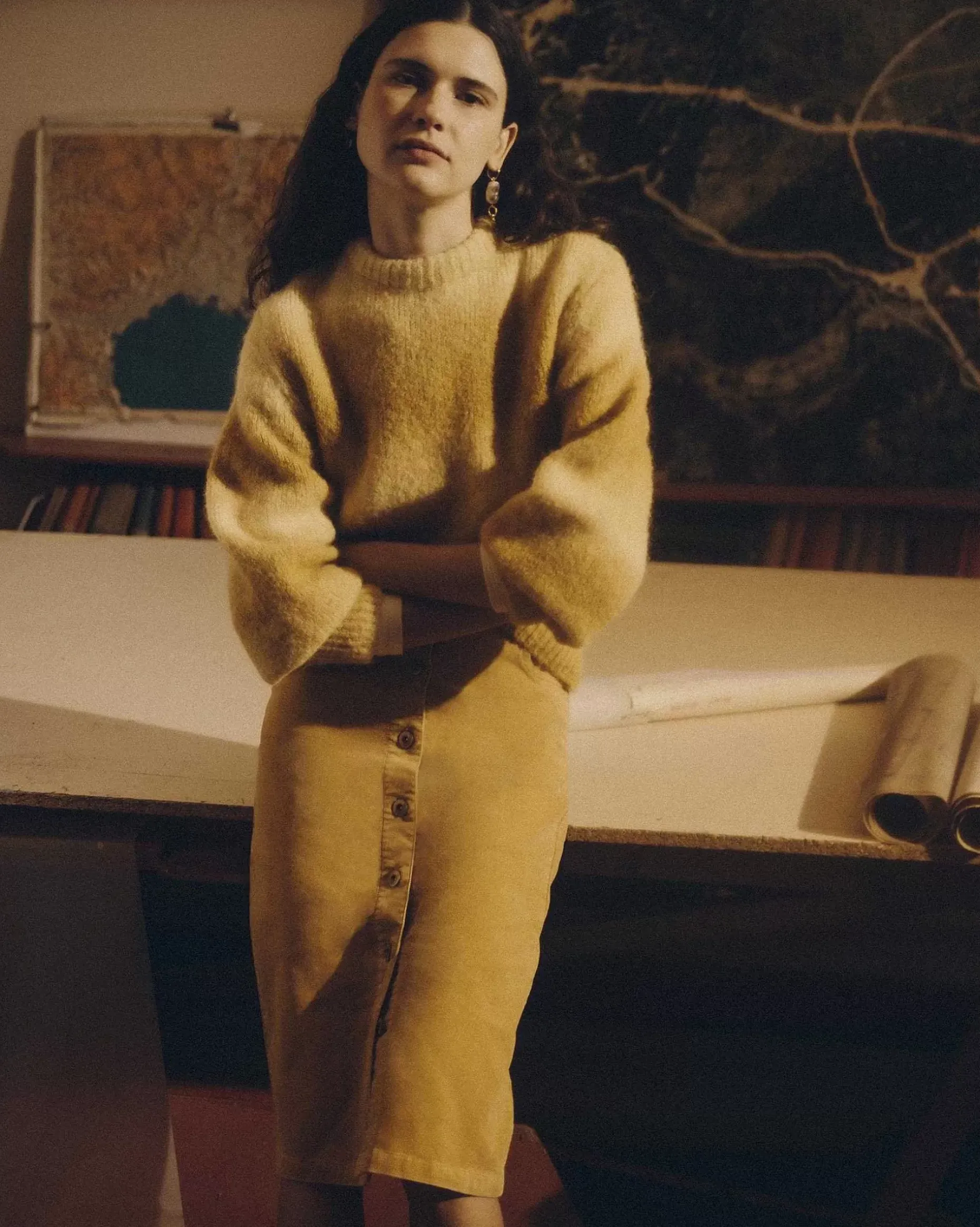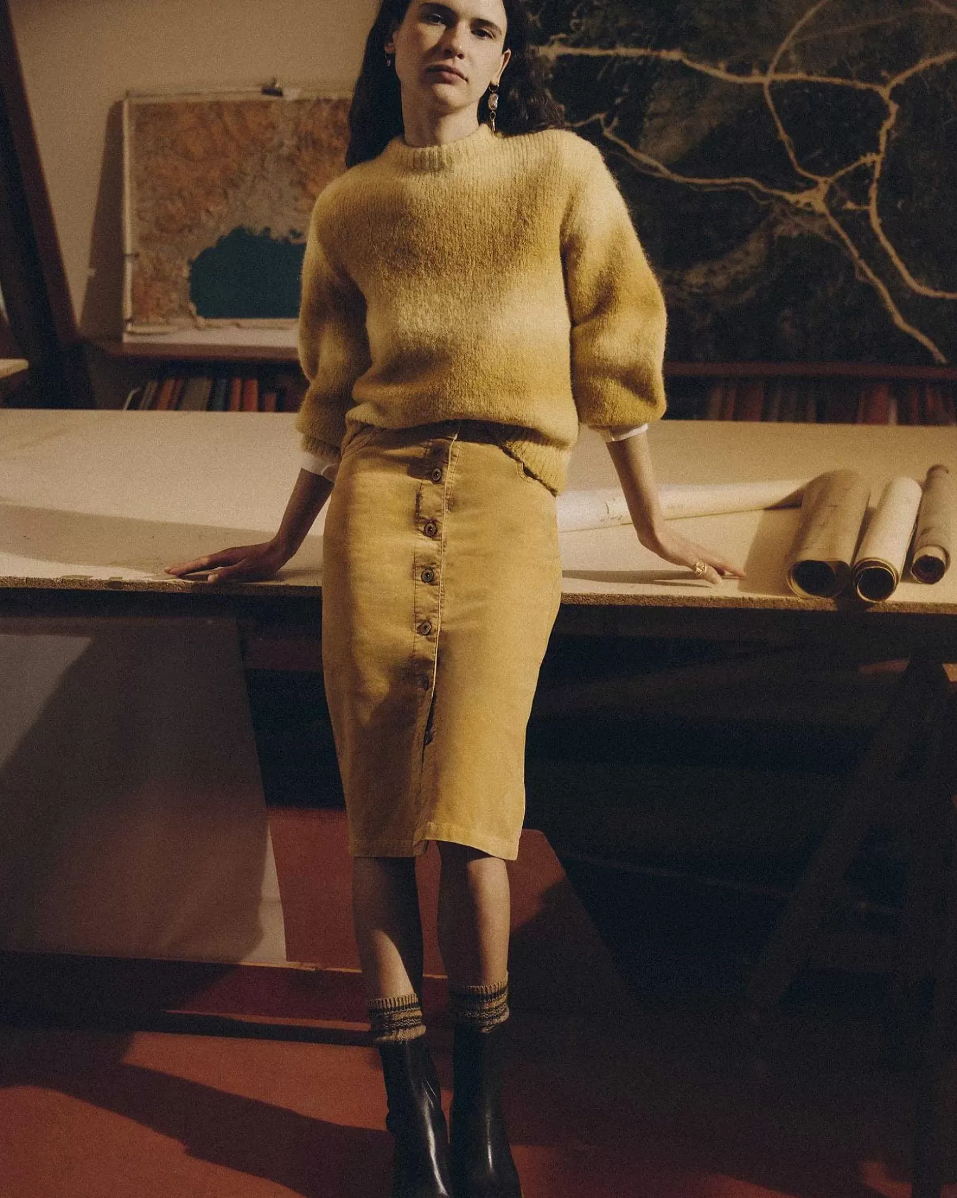 Halblanger Bleistiftrock Aus Tauchgefärbtem Und Verwaschenem Feincord, Pigmentfärbung.