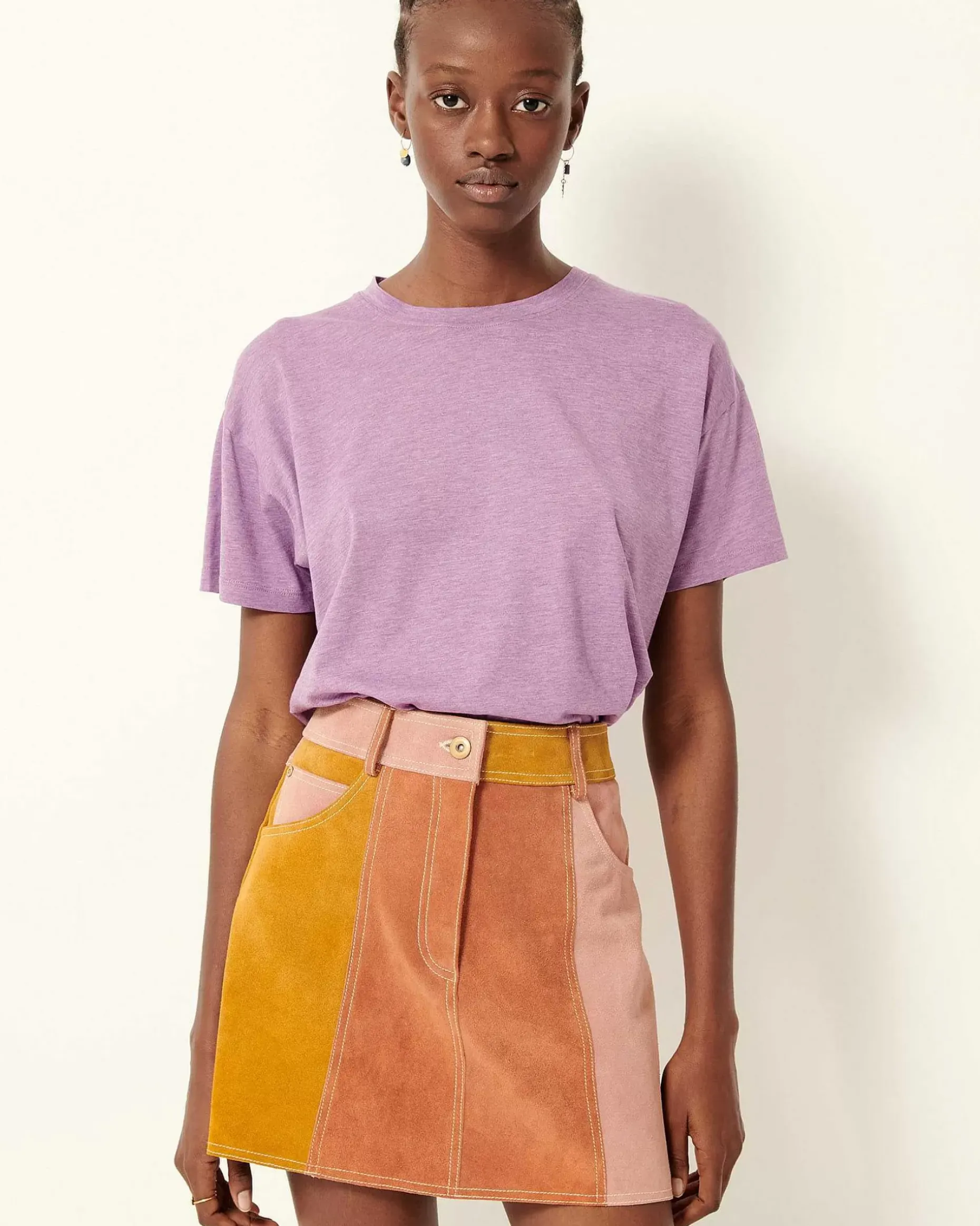 Kurzer Patchwork-Trapezrock Aus Bunten Spaltlederstücken.