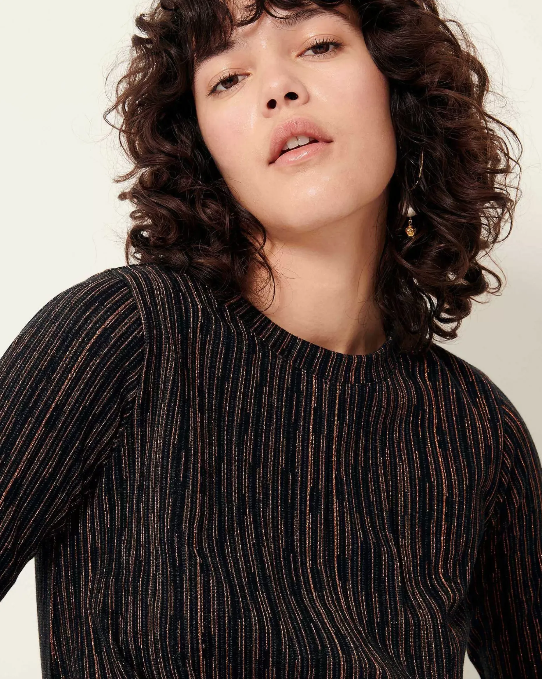 Vorn Gebundenes Langarmshirt Aus Interlock-Jersey Mit Metallisch Schimmernder Jacquardmusterung, Portugiesische Anfertigung.