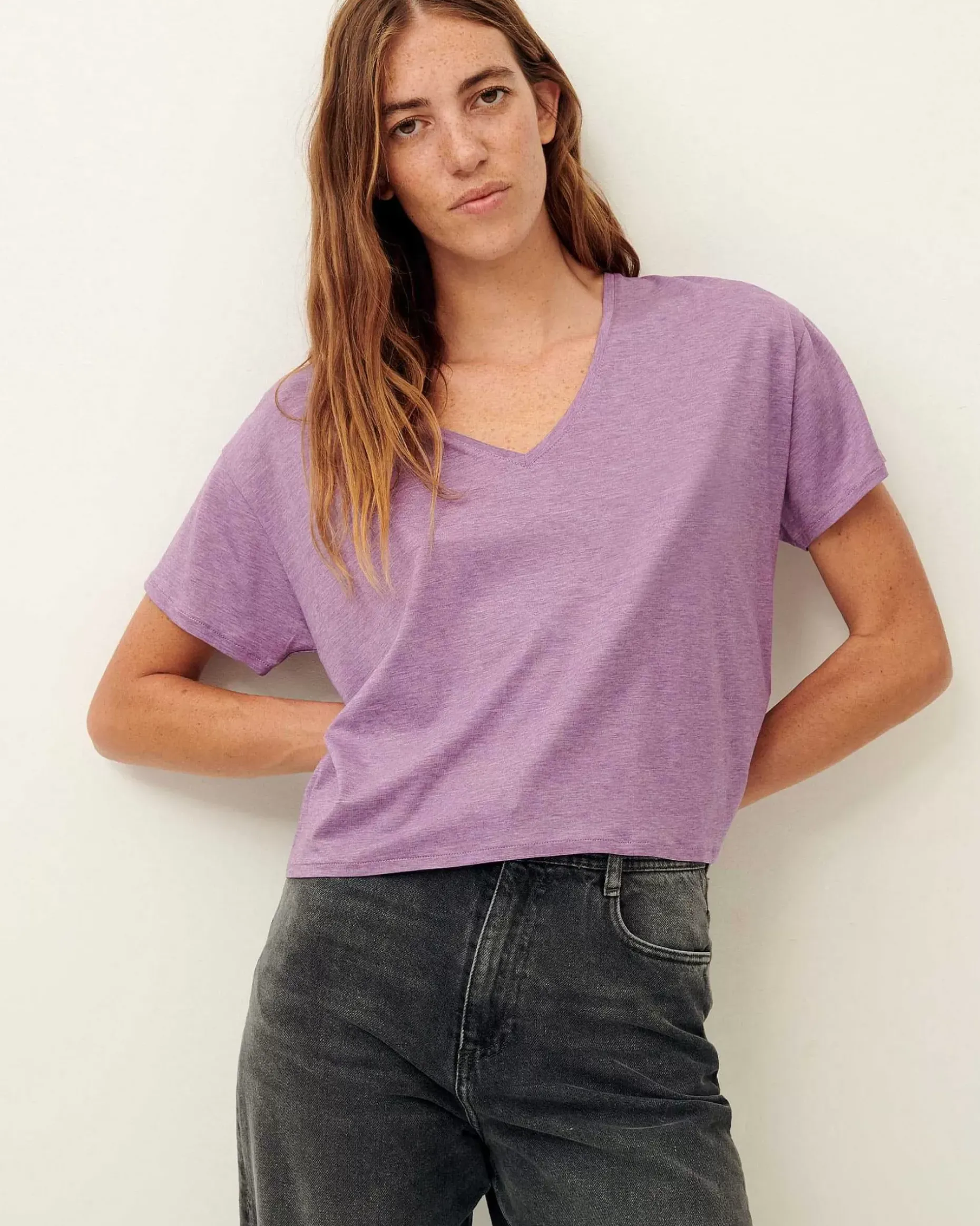 Weites Shirt Mit V-Ausschnitt Und Kurzen Ärmeln Aus Fließendem Jersey, In Portugal Angefertigt.
