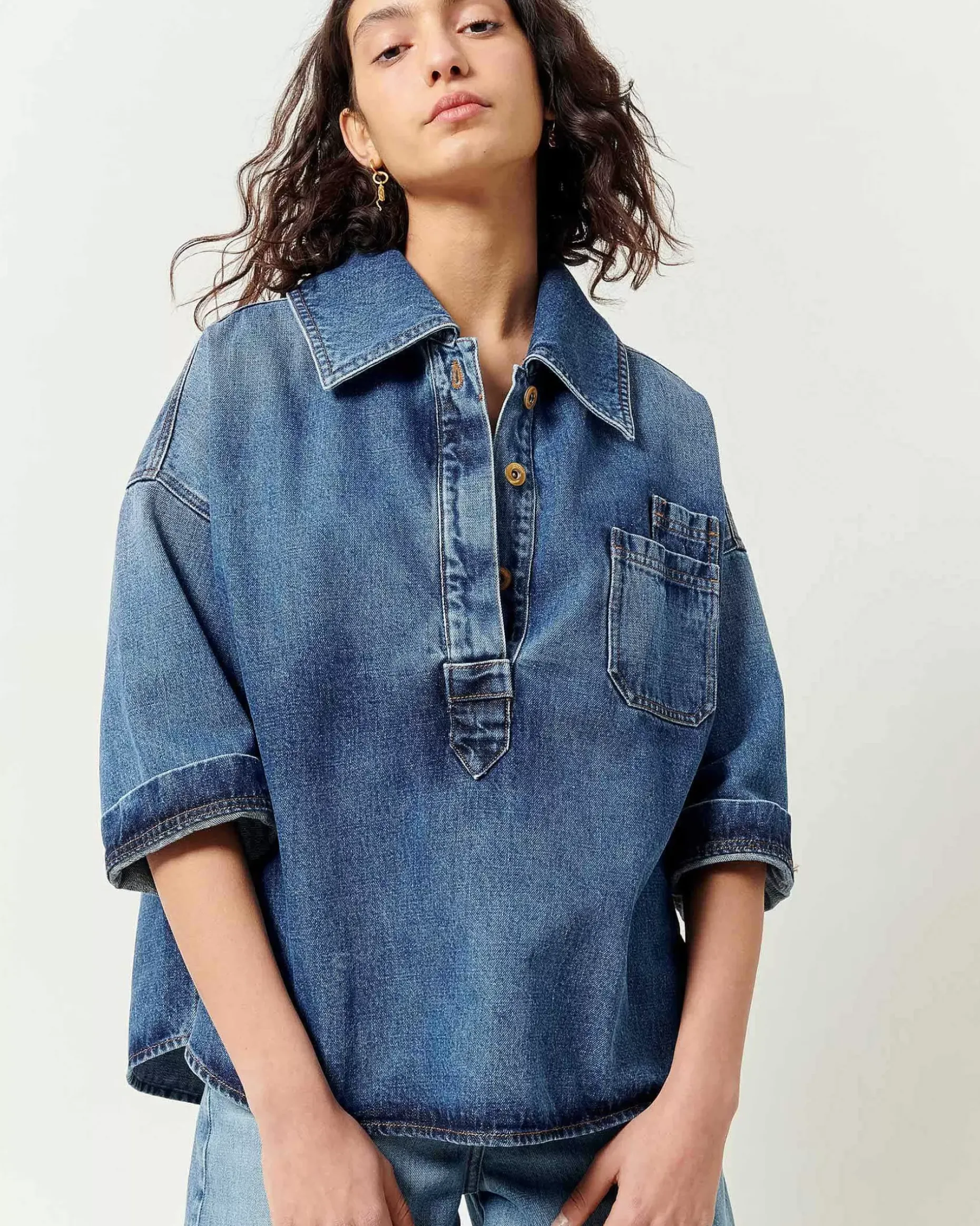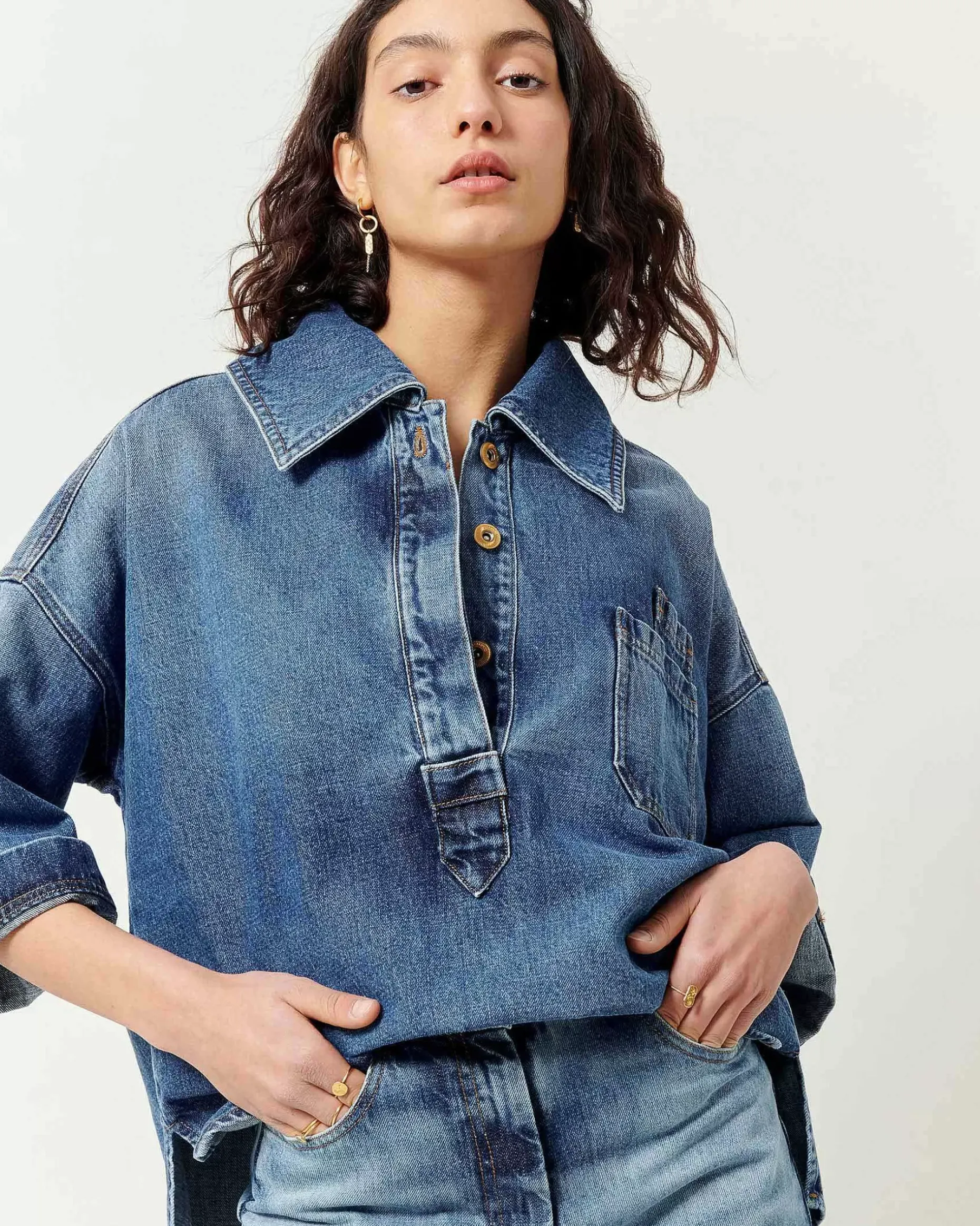 Matrosenhemd Mit Poloknopfleiste Und Aufgesetzten Taschen Aus Stonewashed Denim.