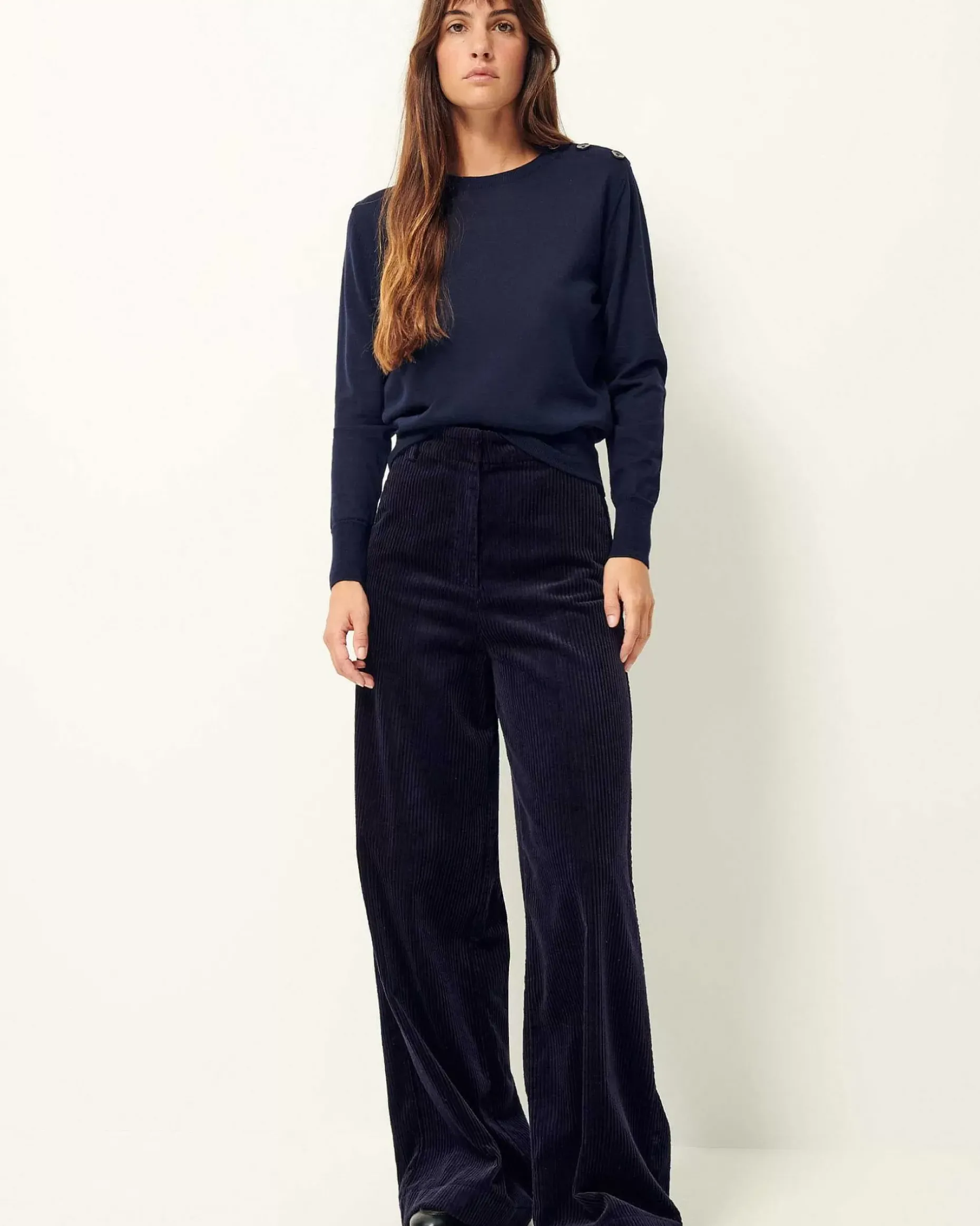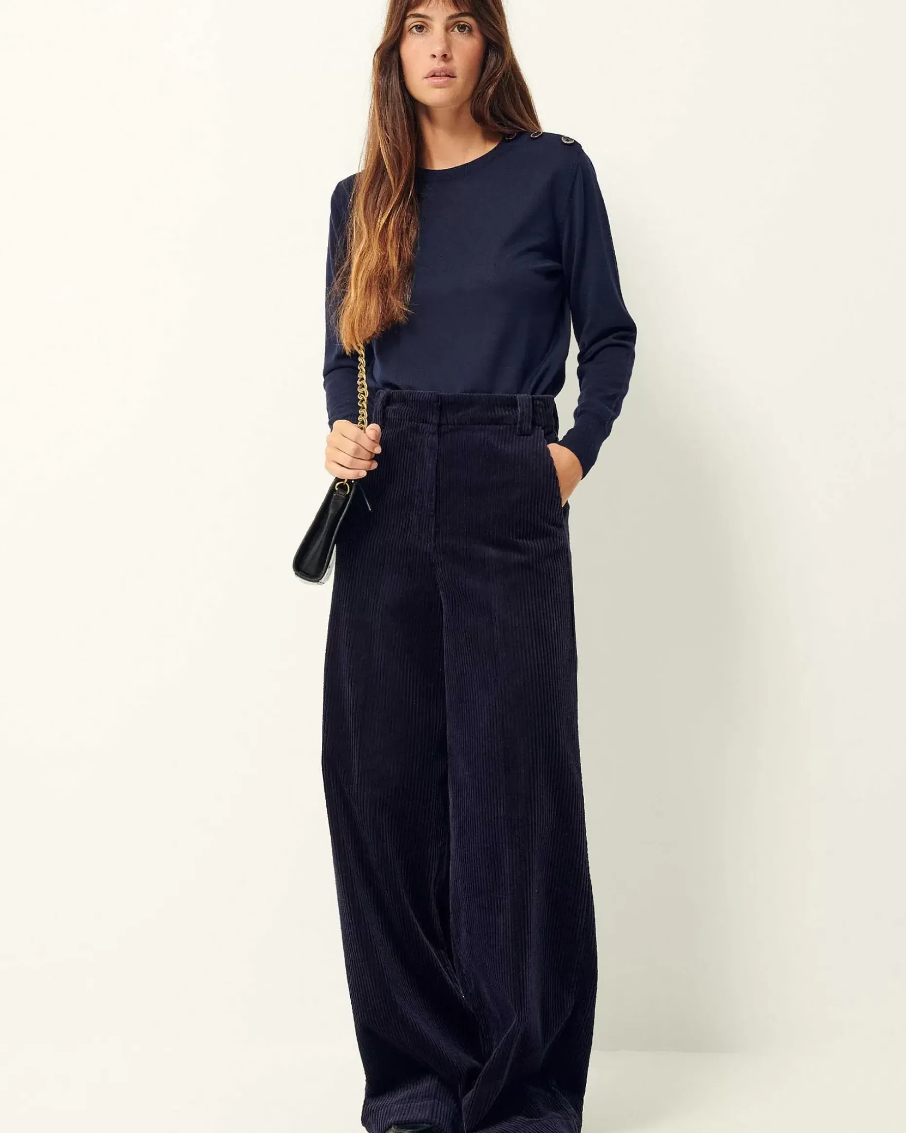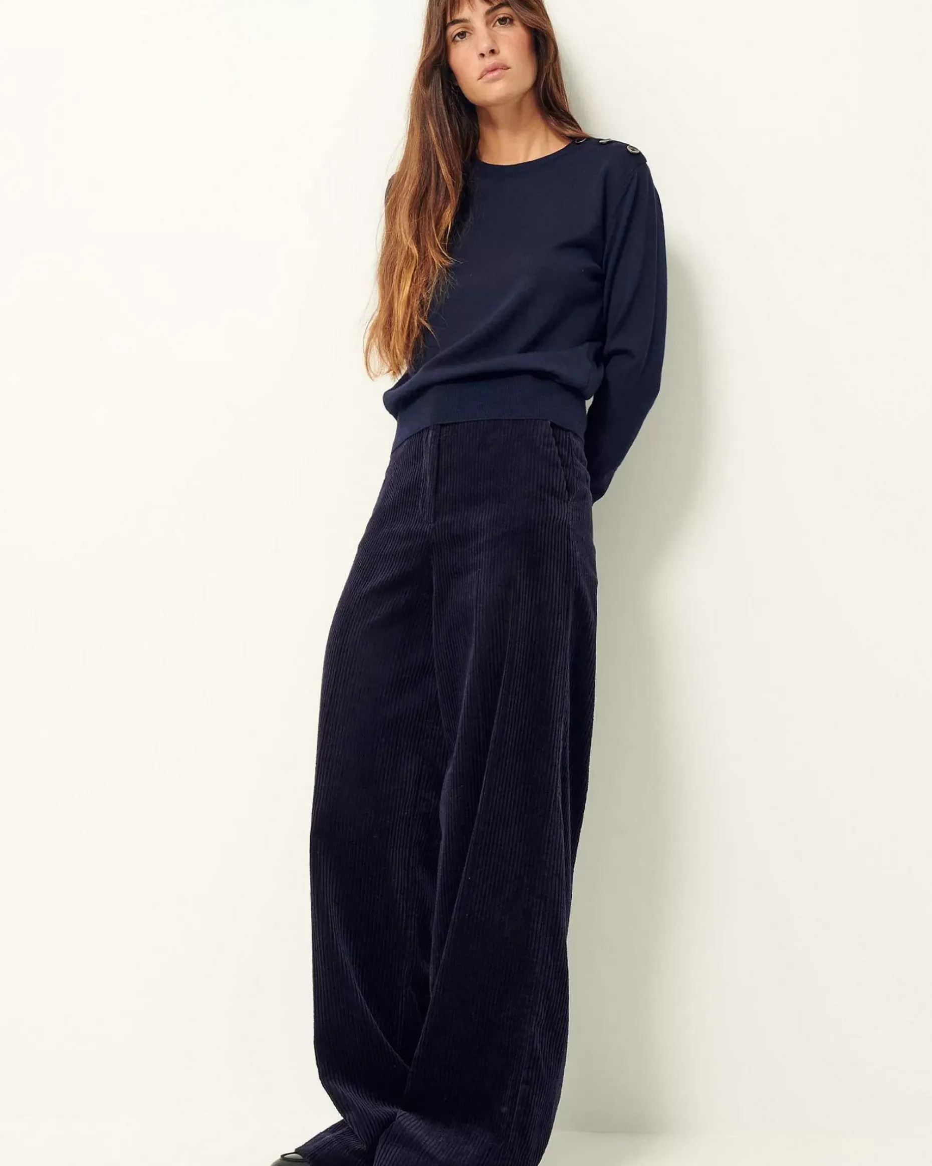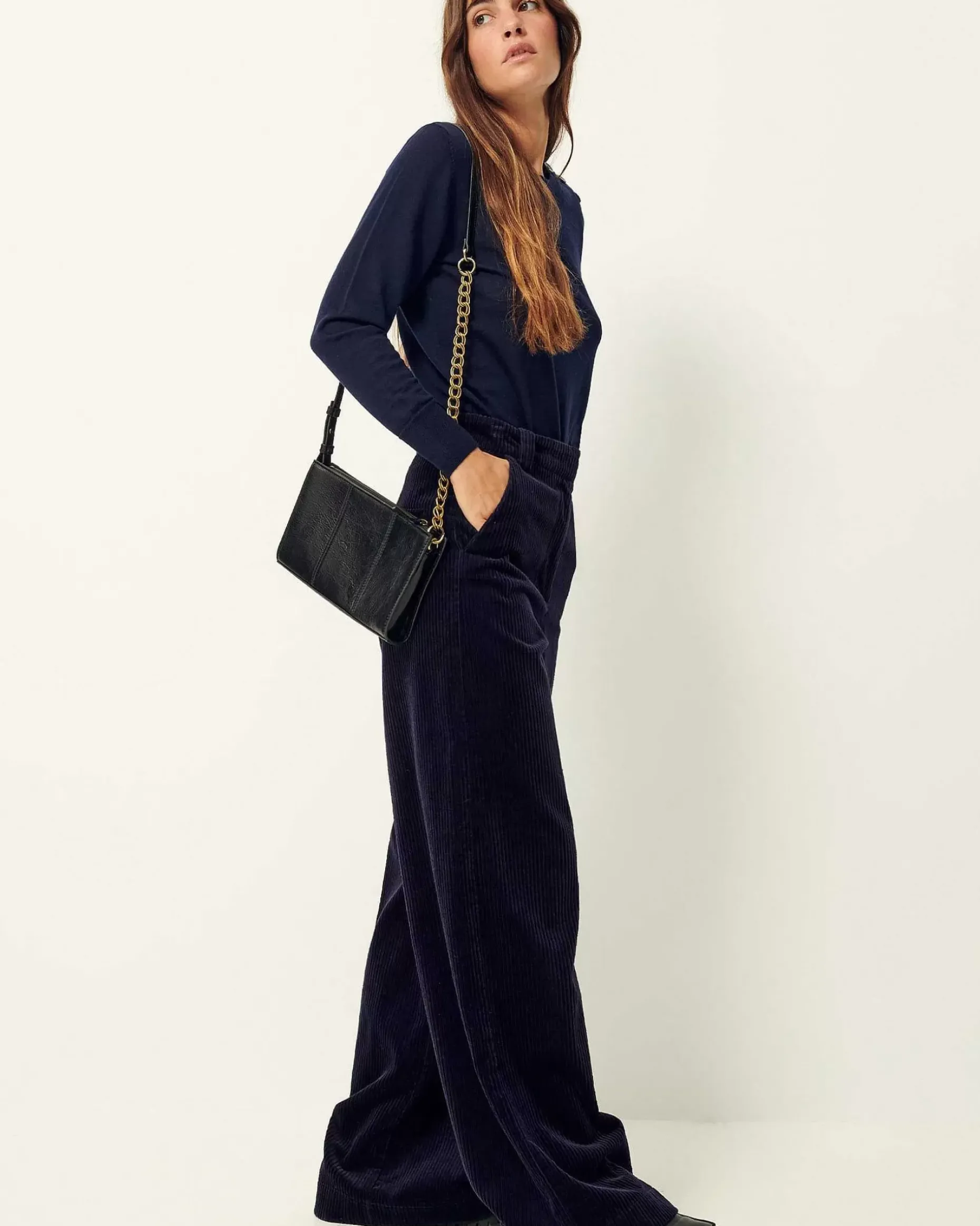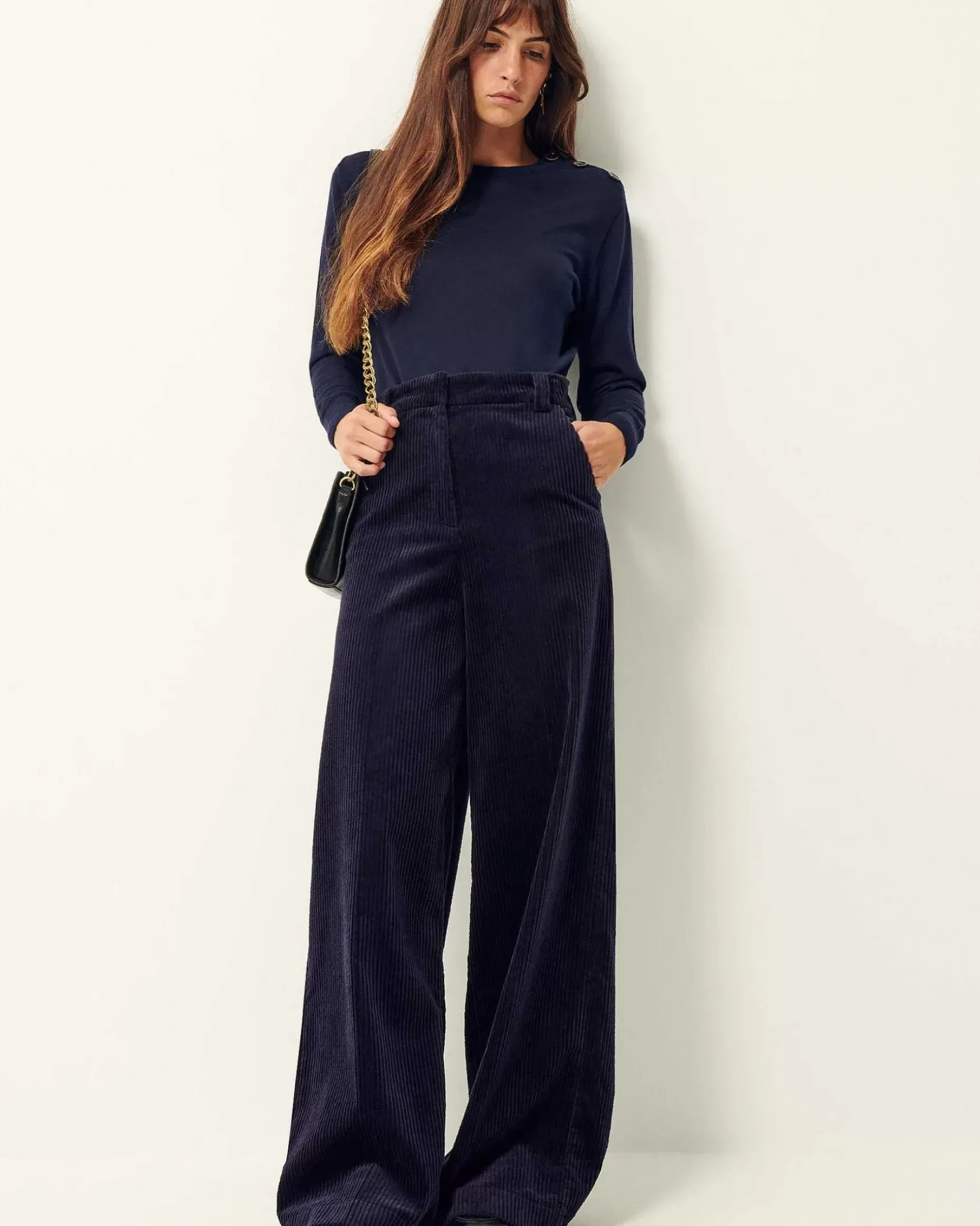 Weite, Ausgestellte Hose Mit Paspeltaschen Und Bügelfalten Entlang Des Beins Aus Gewaschenem Feincord.