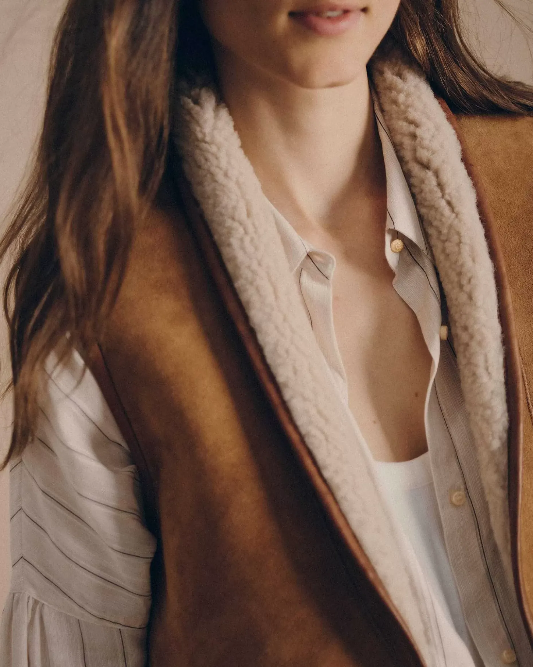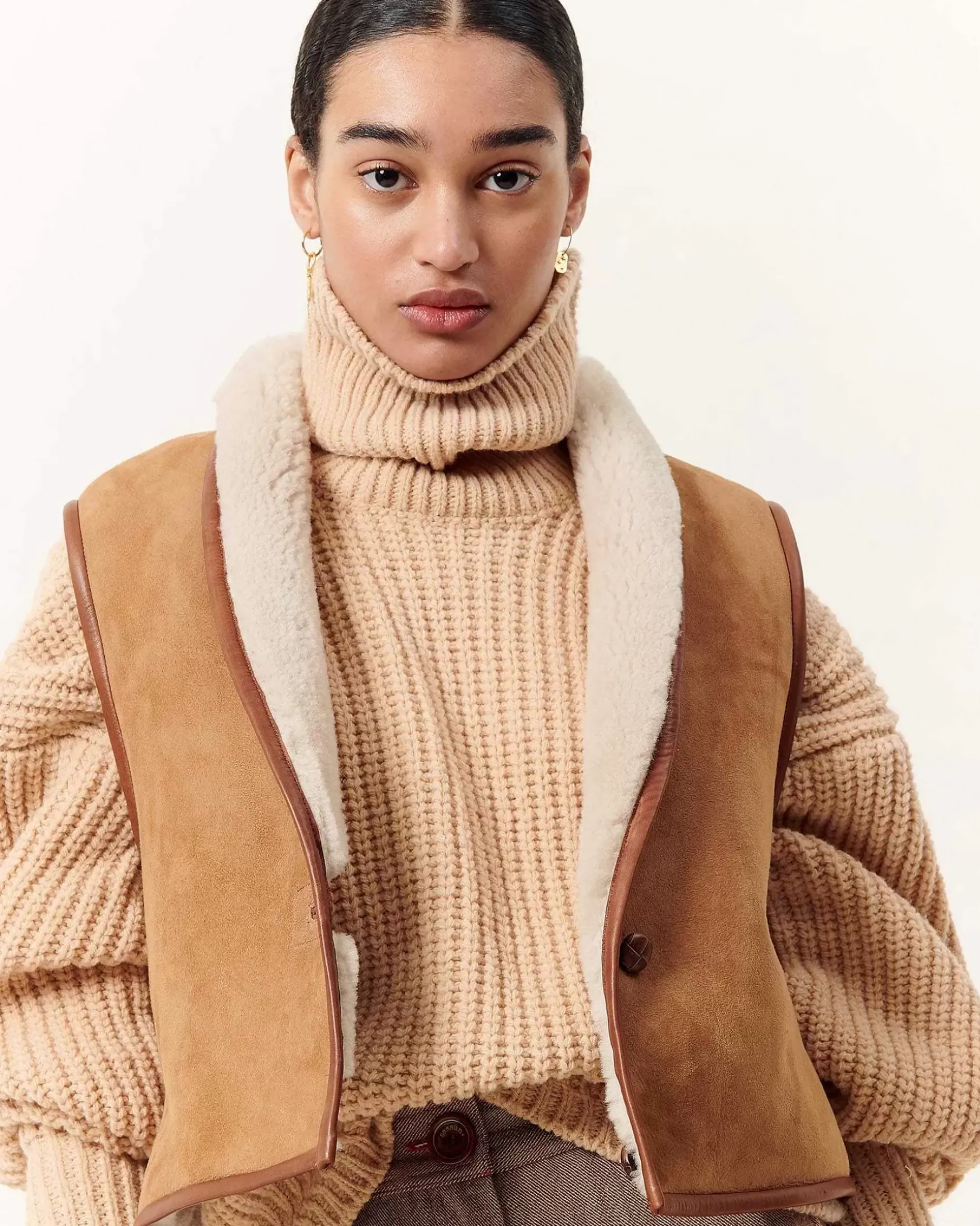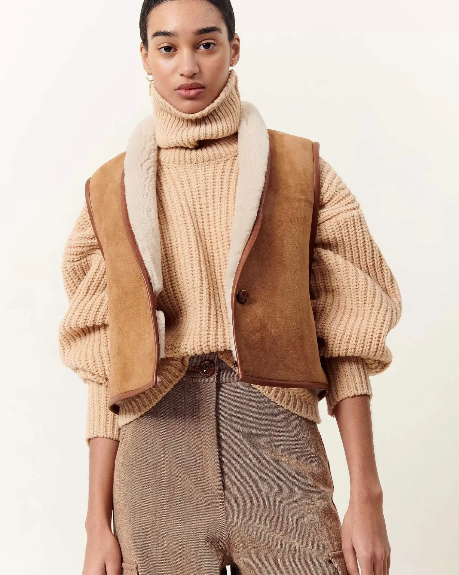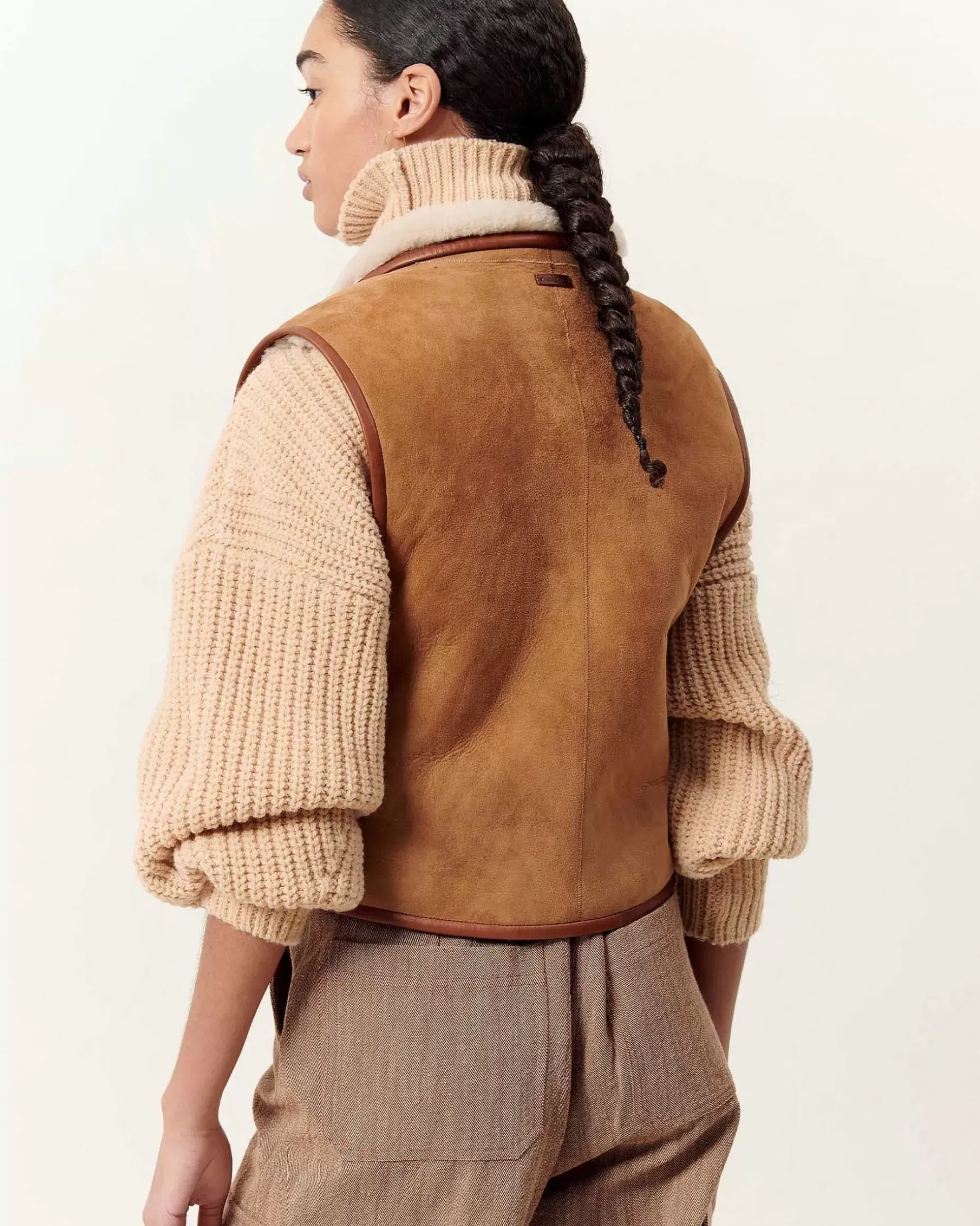 Ärmellose Wendejacke Aus Schaffell Mit Kontrastierendem Schrägband Aus Pflanzlich Gegerbtem Lammleder.