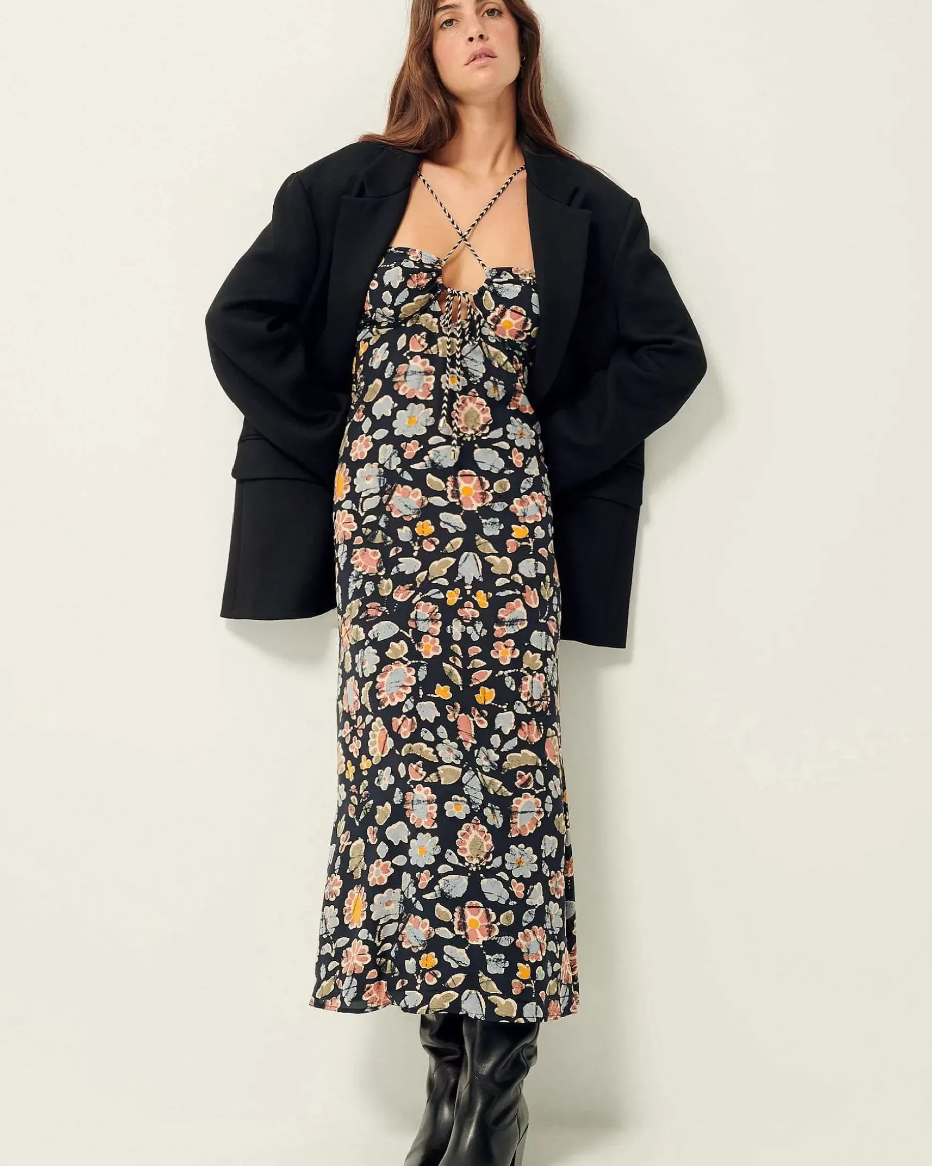 Langes Kleid Mit Verspielten, Überkreuzten Trägern Aus Fließendem Und Luftigem, Bedrucktem Viskosegewebe, Exklusives Sessùn-Muster.