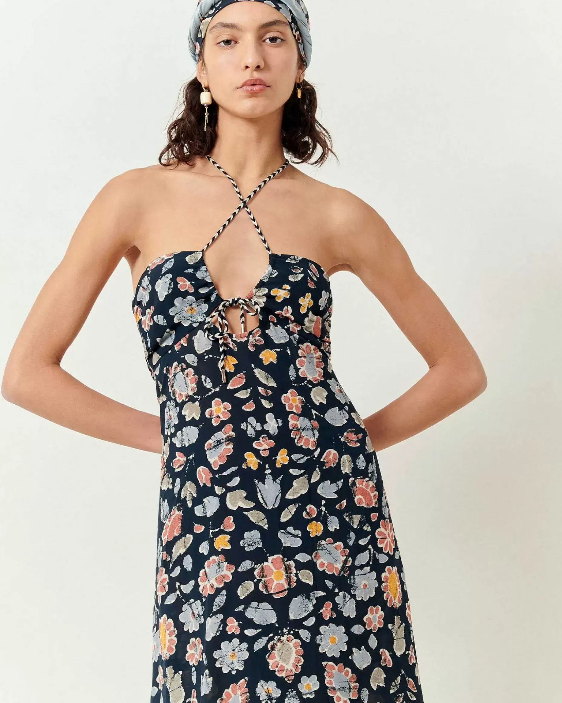 Langes Kleid Mit Verspielten, Überkreuzten Trägern Aus Fließendem Und Luftigem, Bedrucktem Viskosegewebe, Exklusives Sessùn-Muster.Rückenfrei Und Im Stil Eines Halstuchs Geknotet. Die Für Die Herstellung Dieses Artikels Verarbeitete Viskose Wurde Aus…