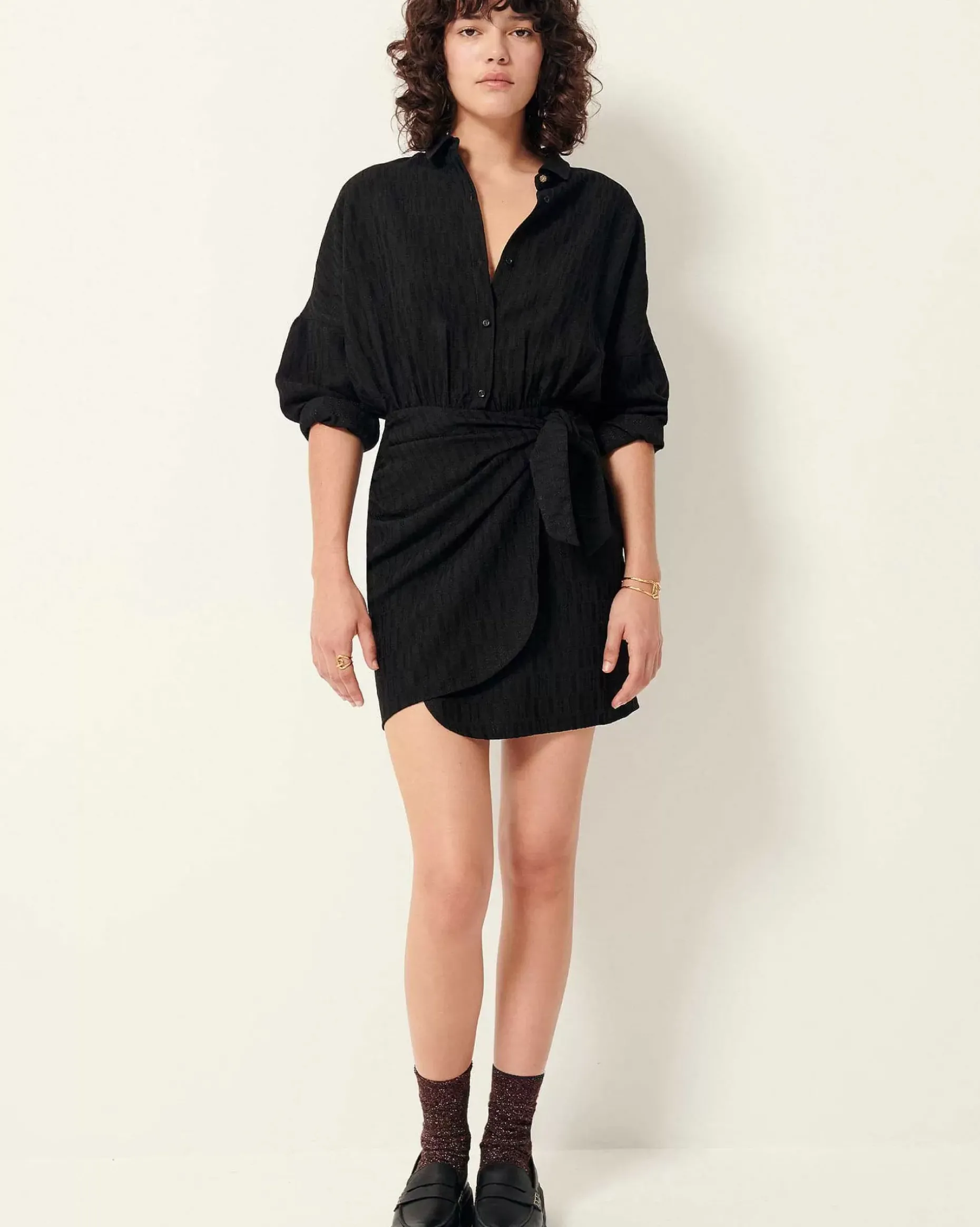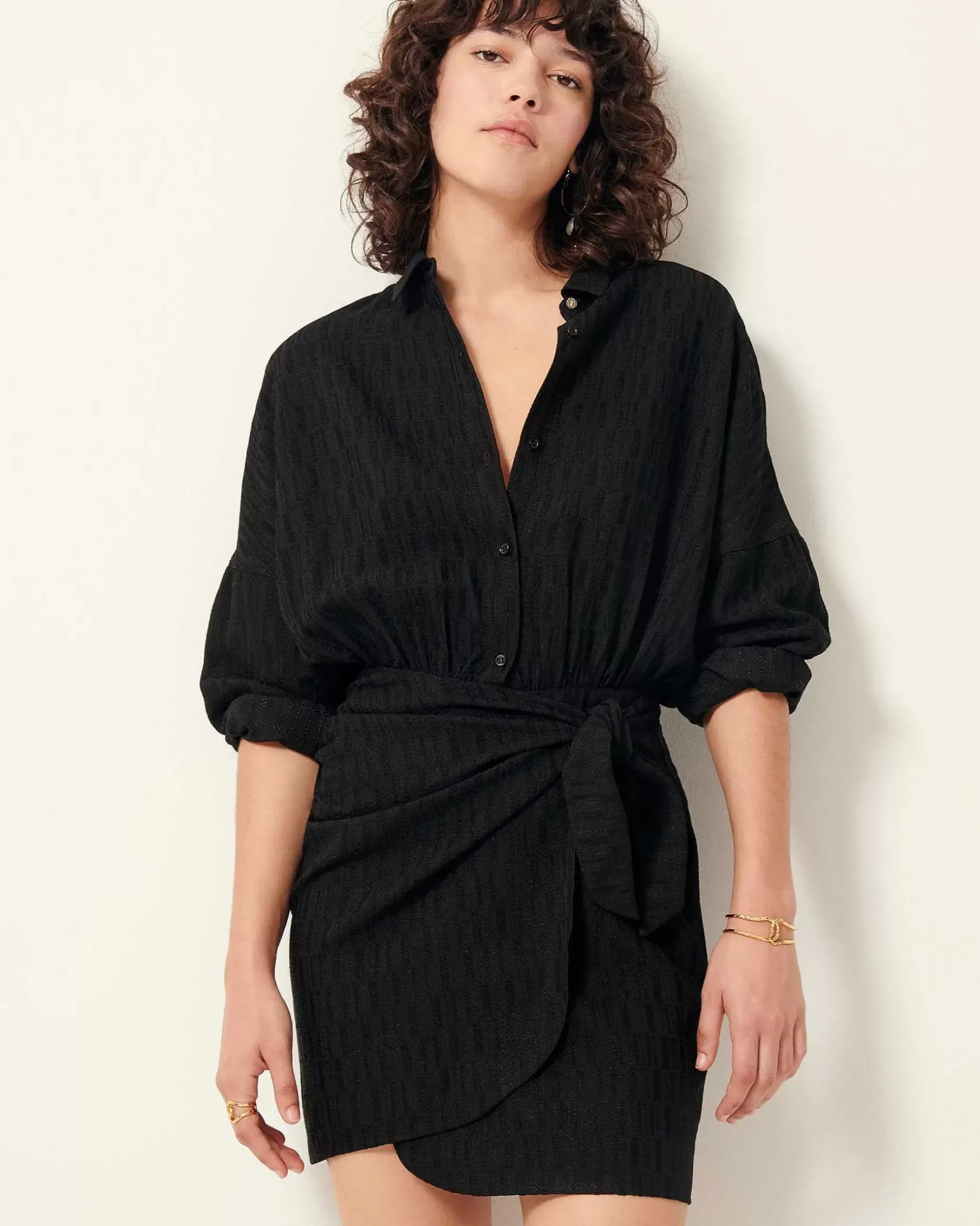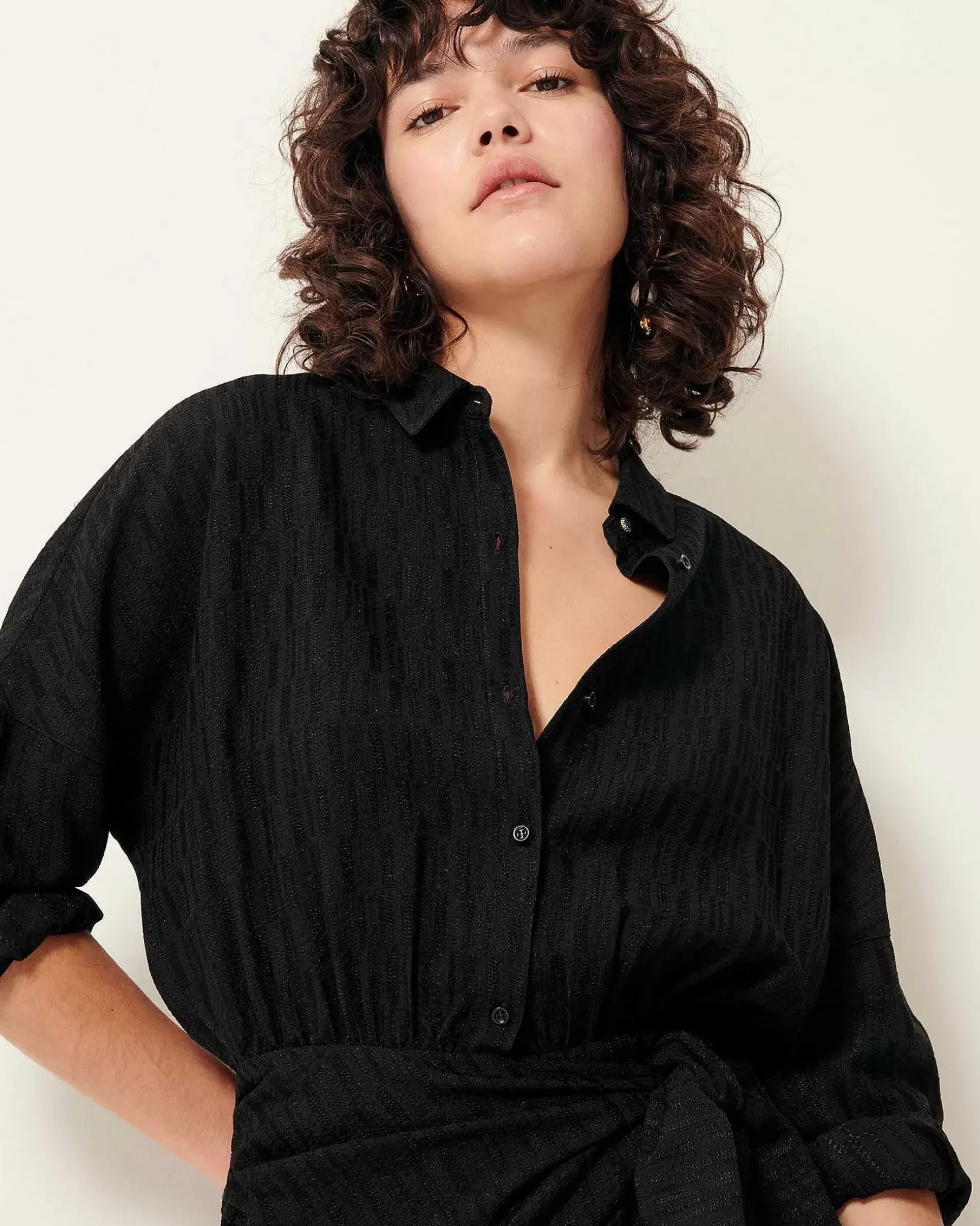 Kurzes, Unten Geknotetes Hemdblusenkleid Aus Ton-In-Ton Viskose-Krepp Mit Jacquardmusterung.