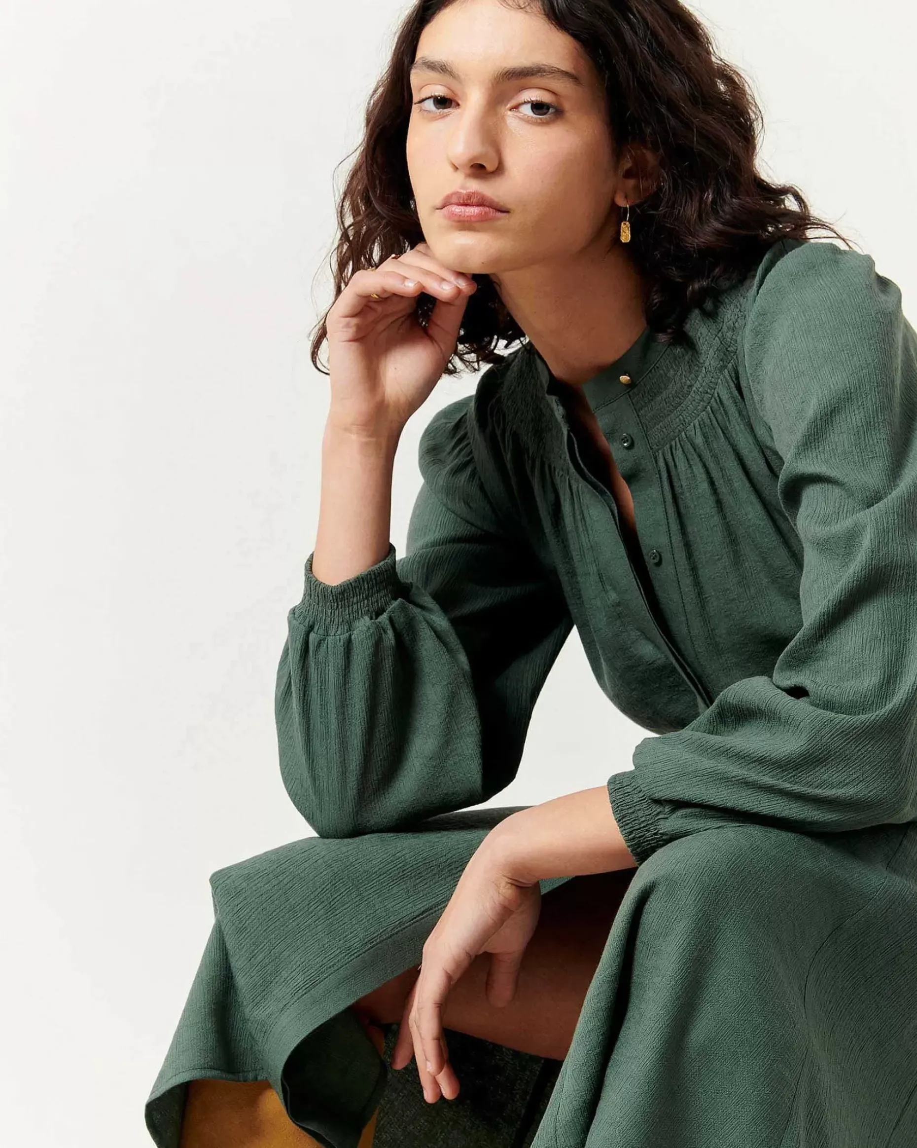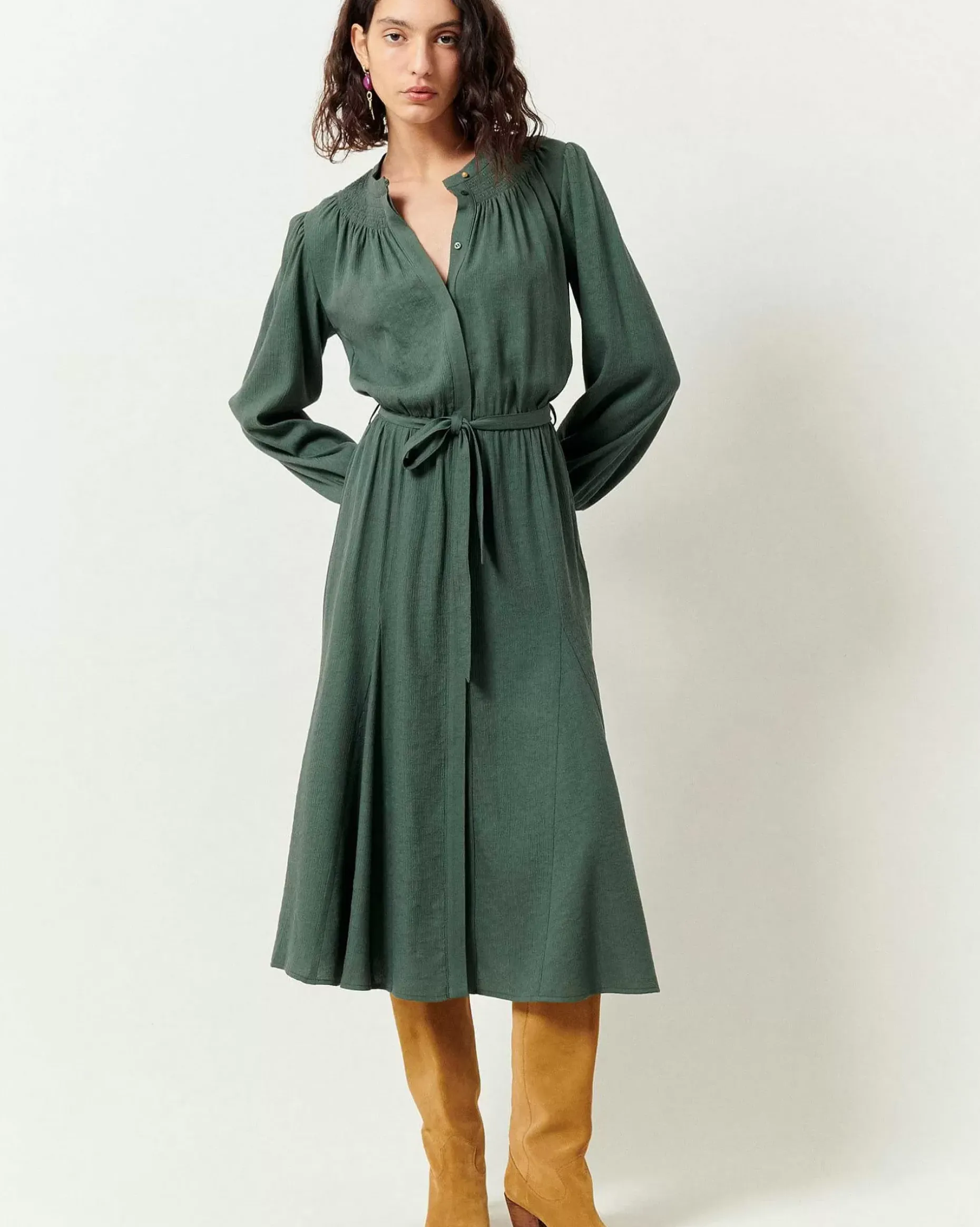 Langes Kleid Mit Godets Am Kleidrock Aus Ton-In-Ton Jacquard-Krepp Aus Viskose. Abgesteppte Raffungen Am Ausschnitt.