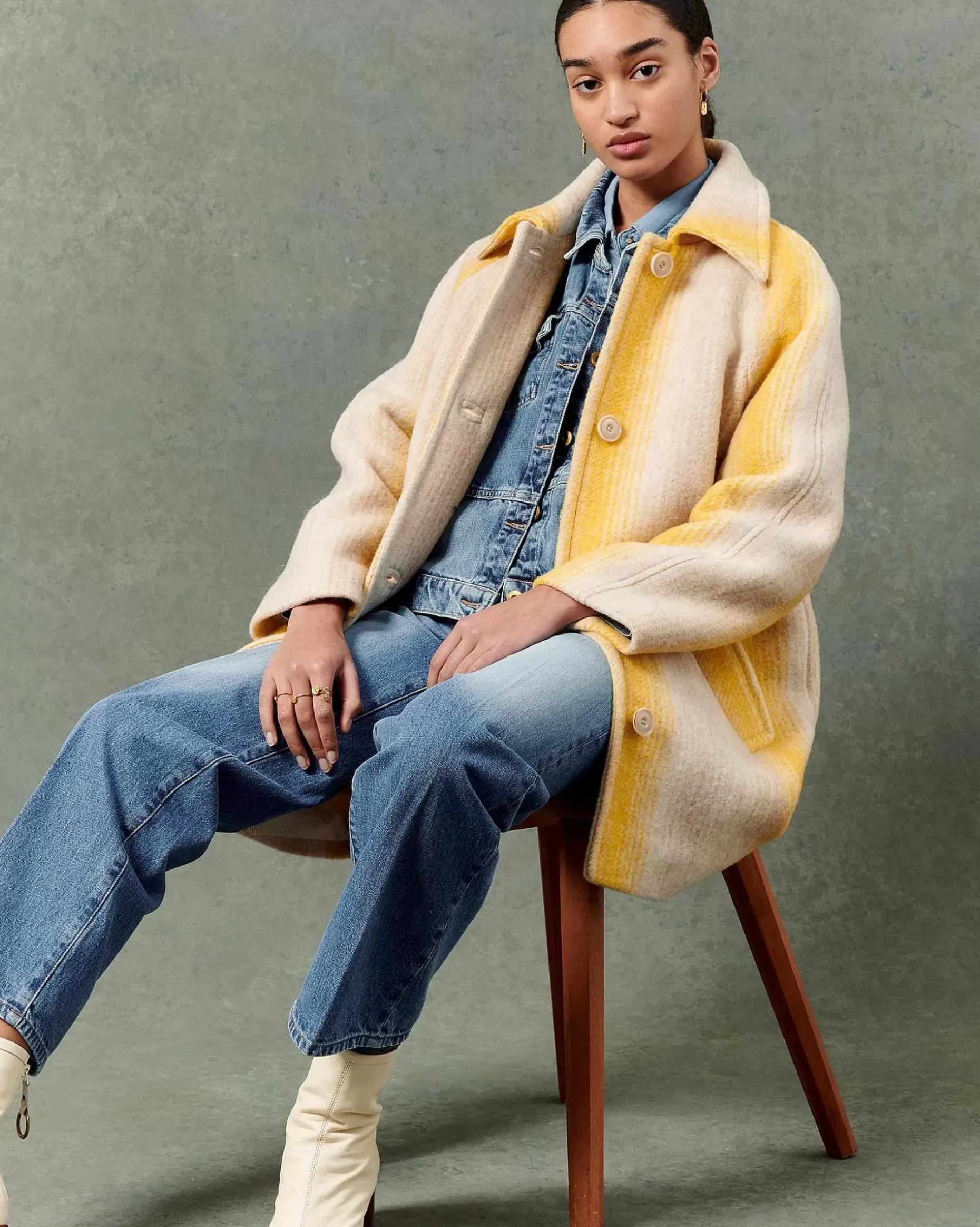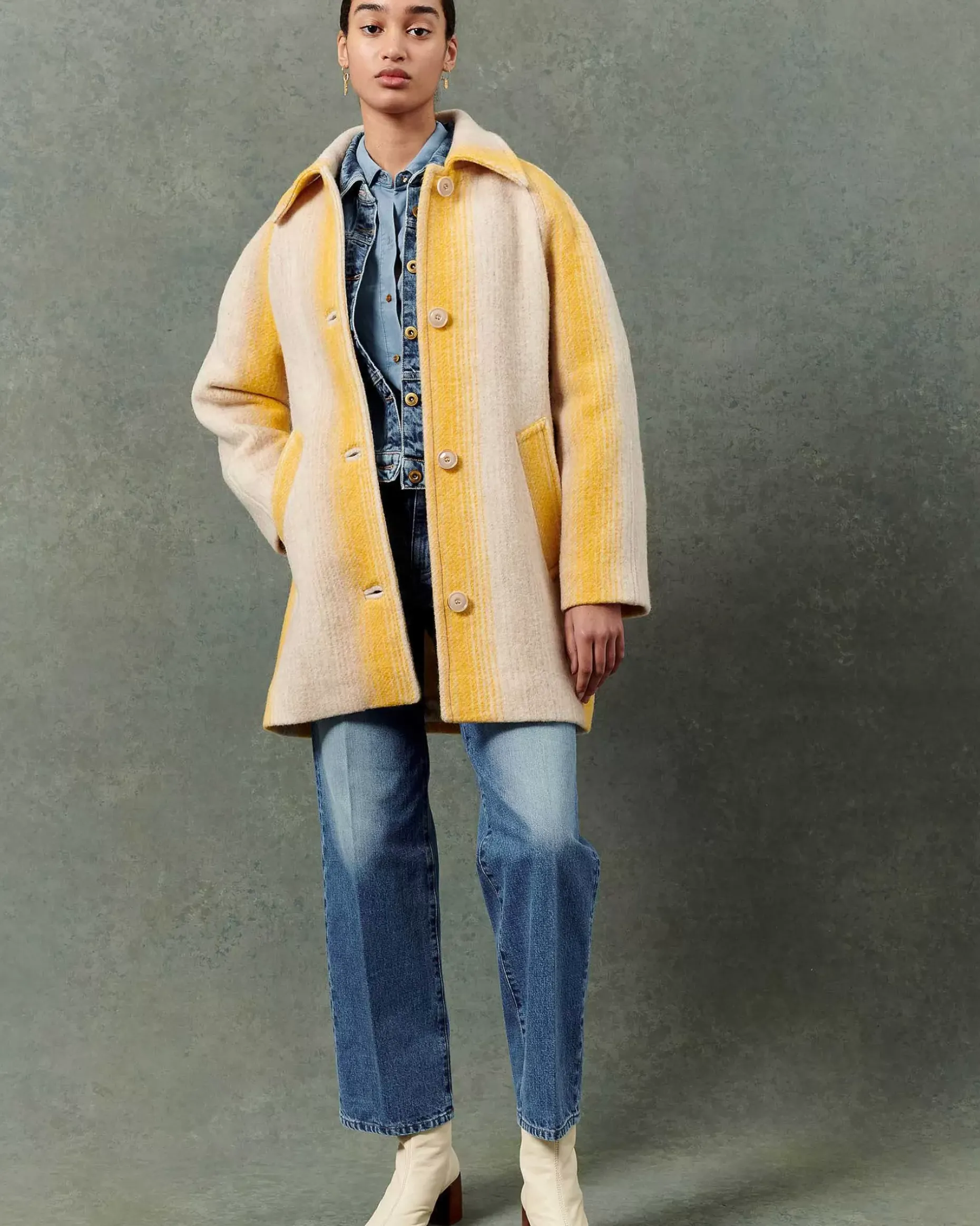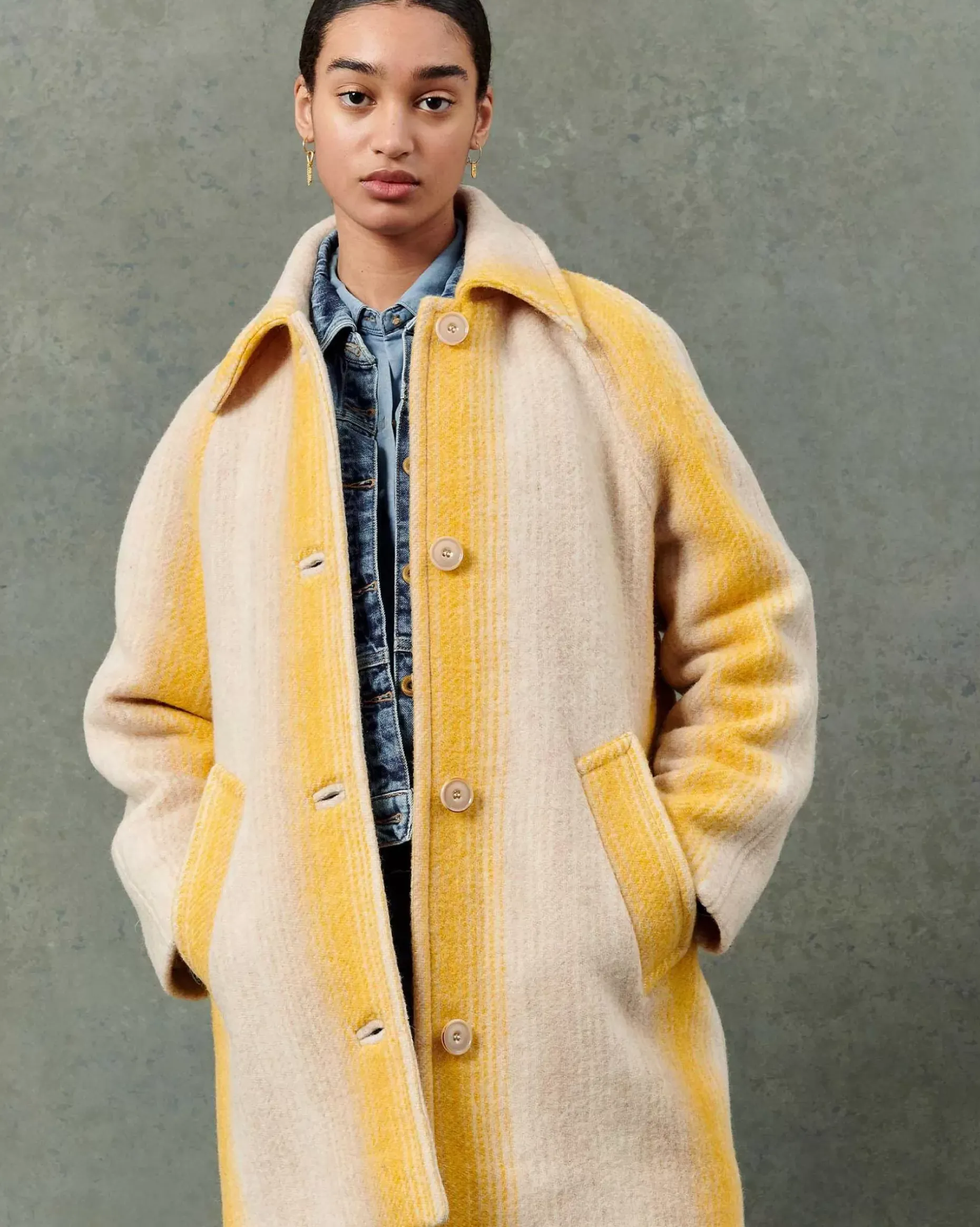 3/4-Langer Mantel Mit Raglanärmeln Aus Flauschigem Schurwollgewebe Mit Breiten, Fantasievoll Gestalteten Streifen, Italienische Webarbeit.
