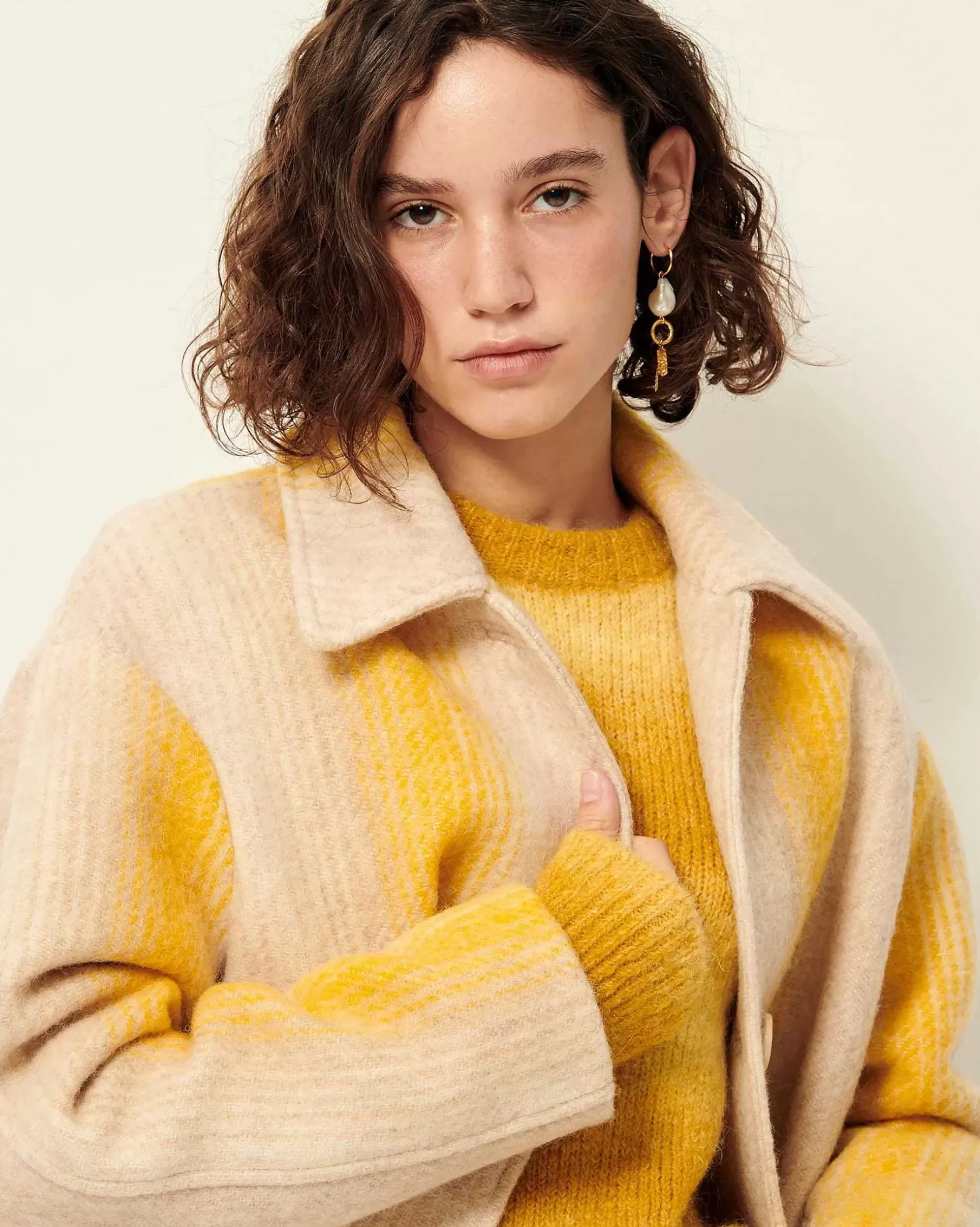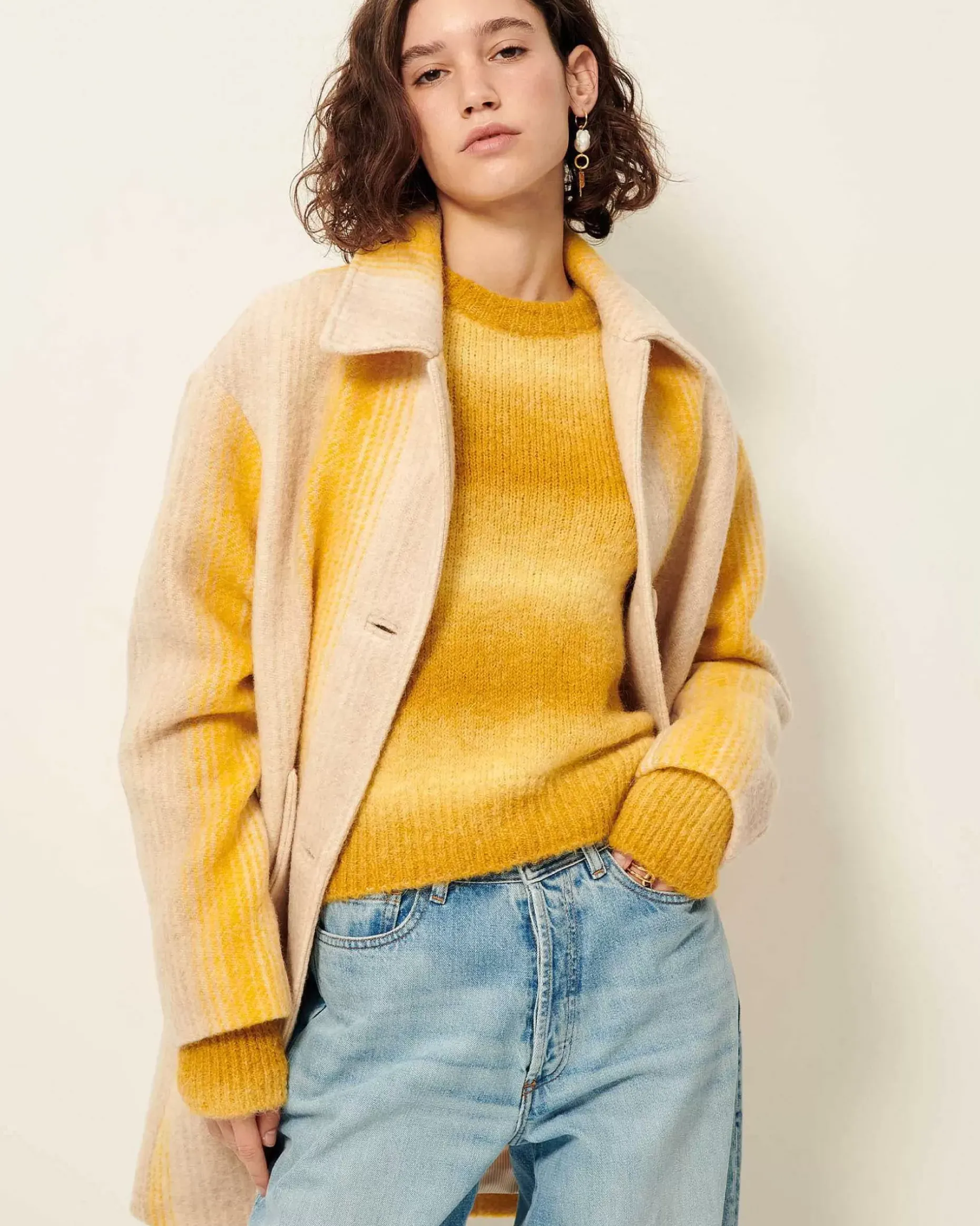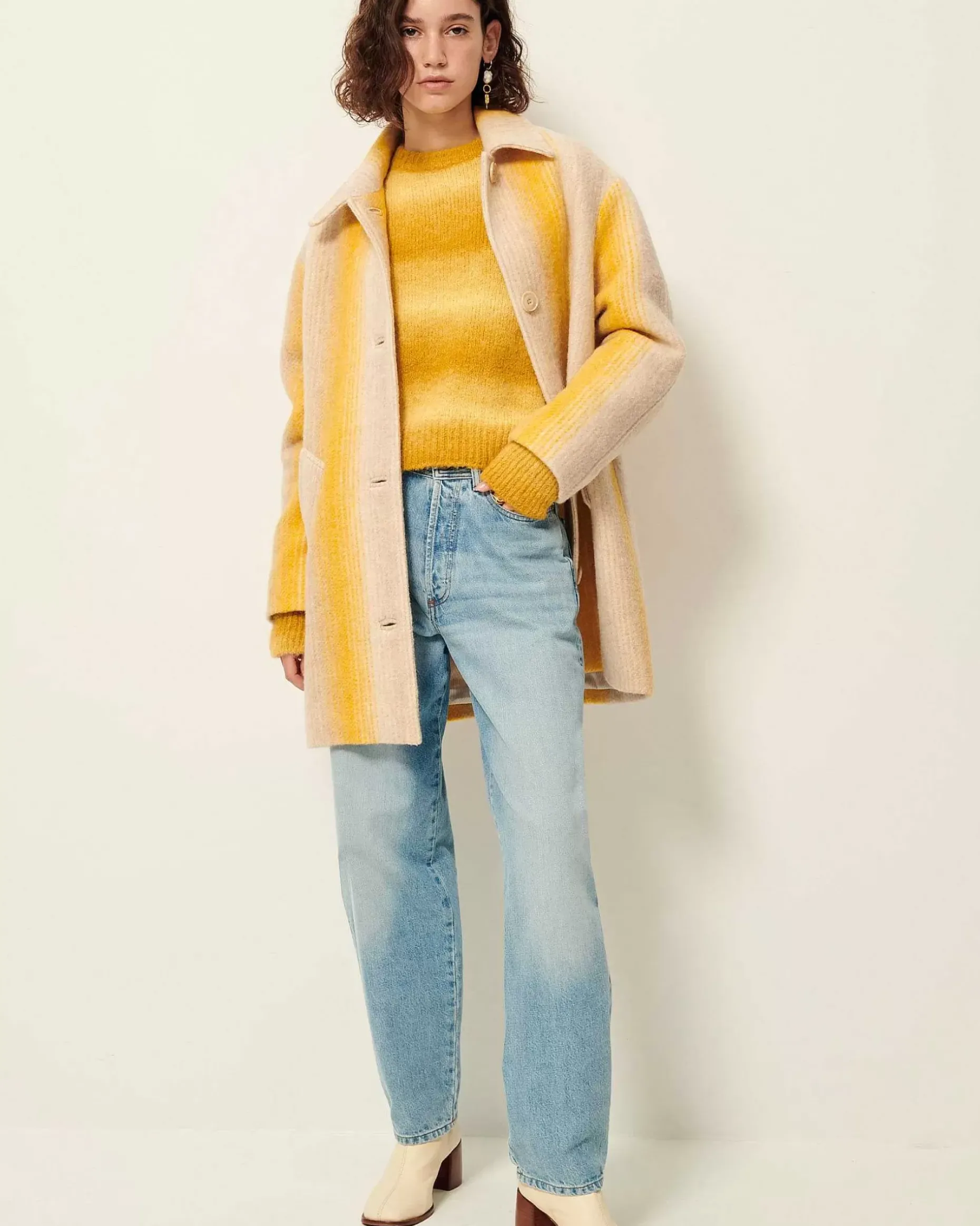 3/4-Langer Mantel Mit Raglanärmeln Aus Flauschigem Schurwollgewebe Mit Breiten, Fantasievoll Gestalteten Streifen, Italienische Webarbeit.