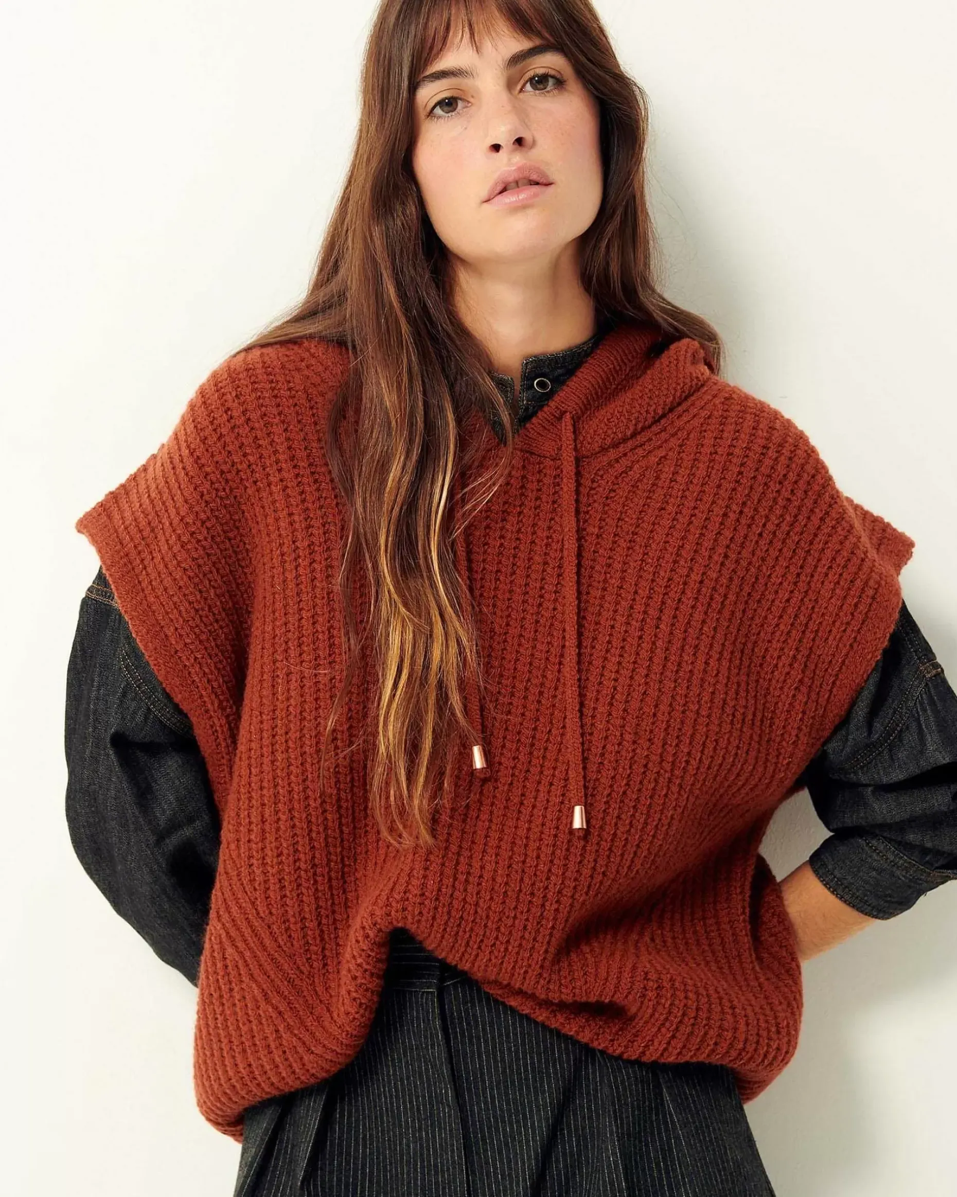 Ärmelloser Kapuzenpulli Aus Grobem Strick.