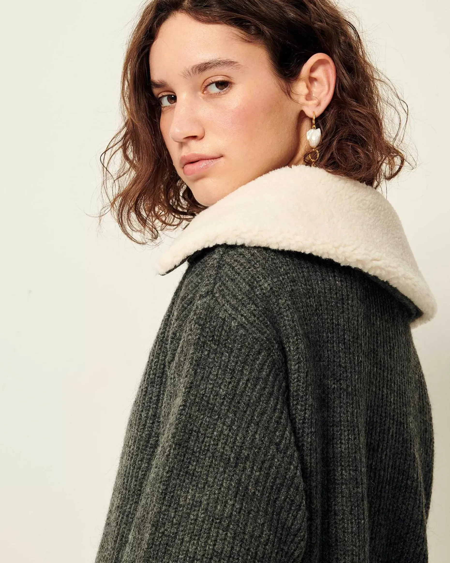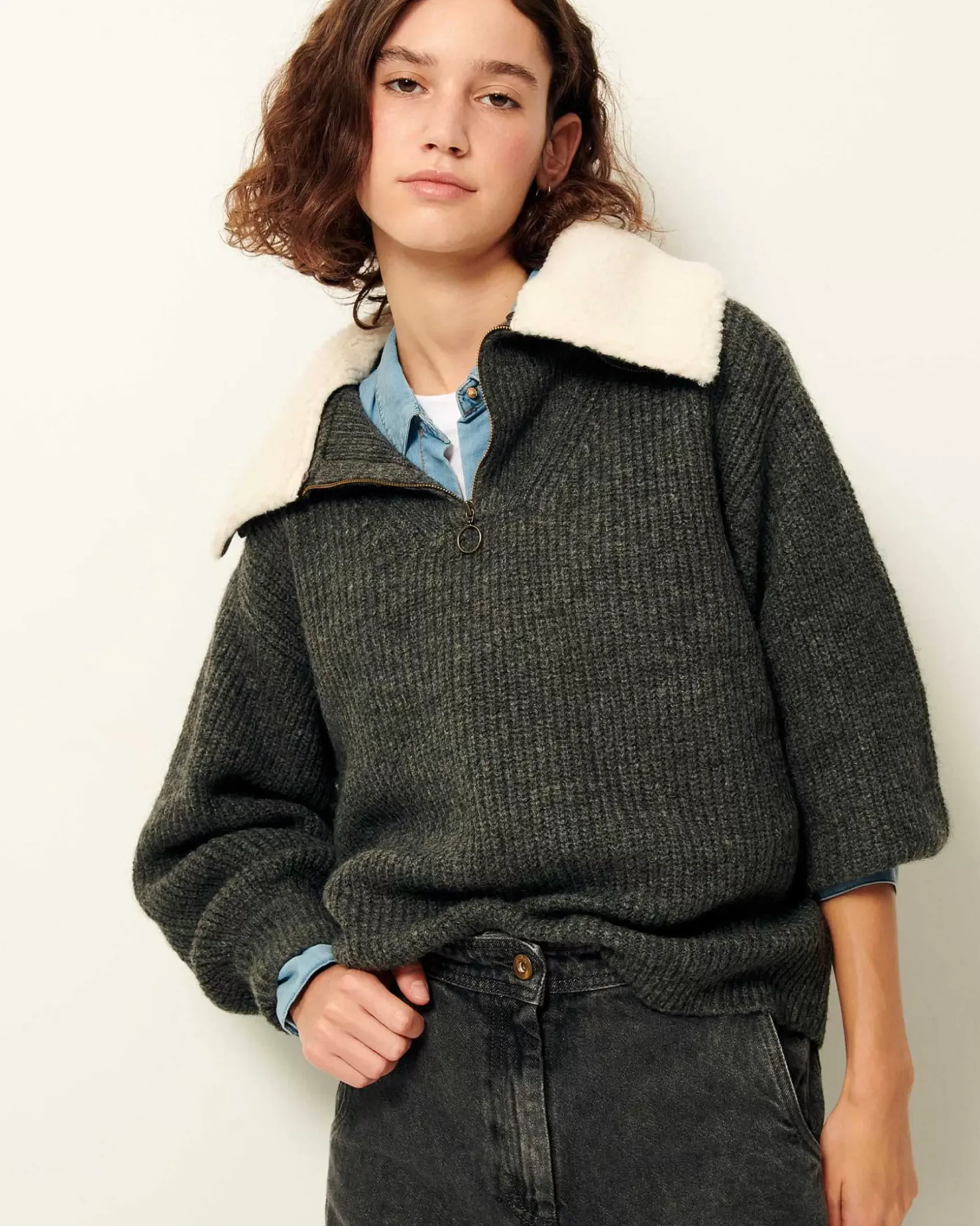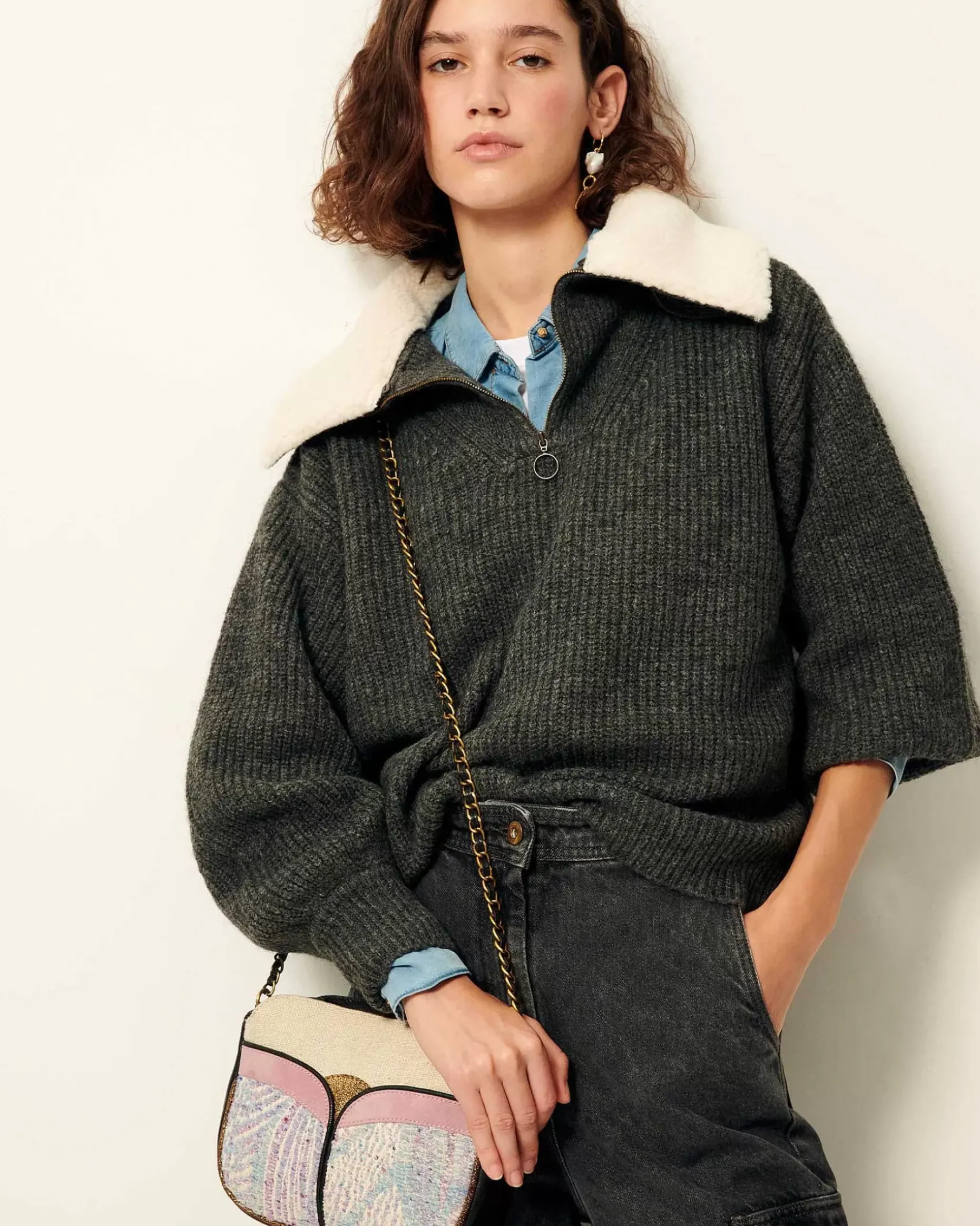 Pulli Mit Troyerkragen Aus Flauschigem, Perlenbesetztem Rippstrick.