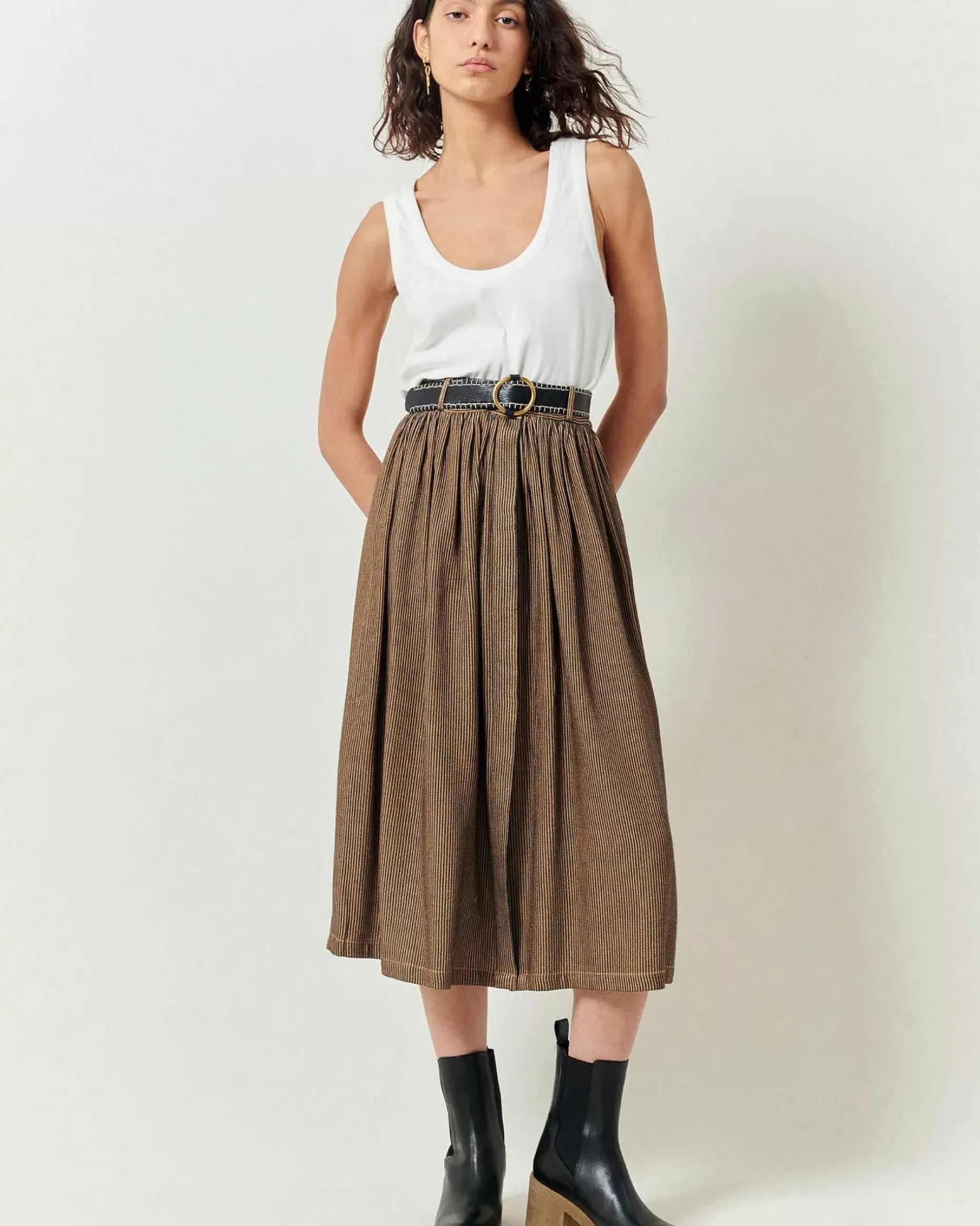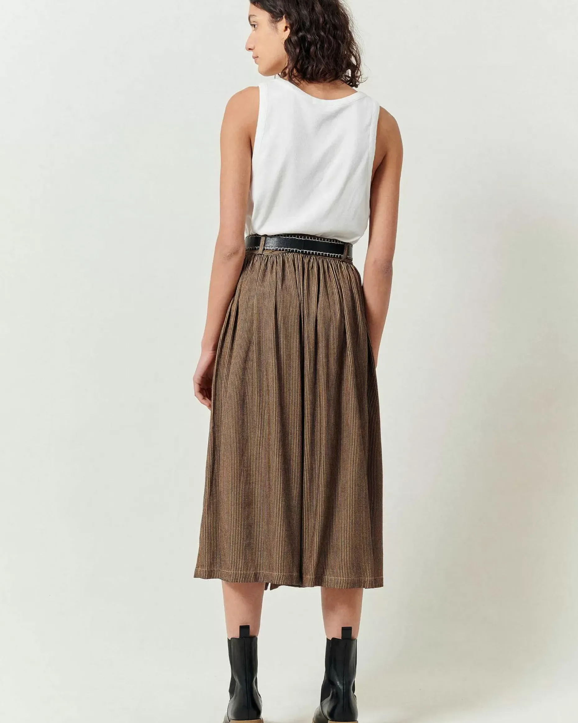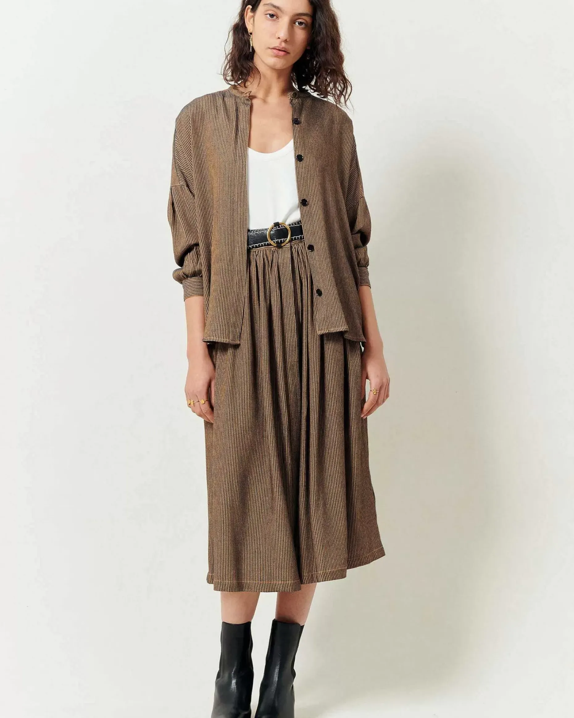 Halblanger, Geknöpfter Rock Aus Fließendem Gewebe Aus Merzerisierten, Zweifarbig Gestreiften Garnen, Französische Webarbeit, Exklsuiv Für Sessùn.