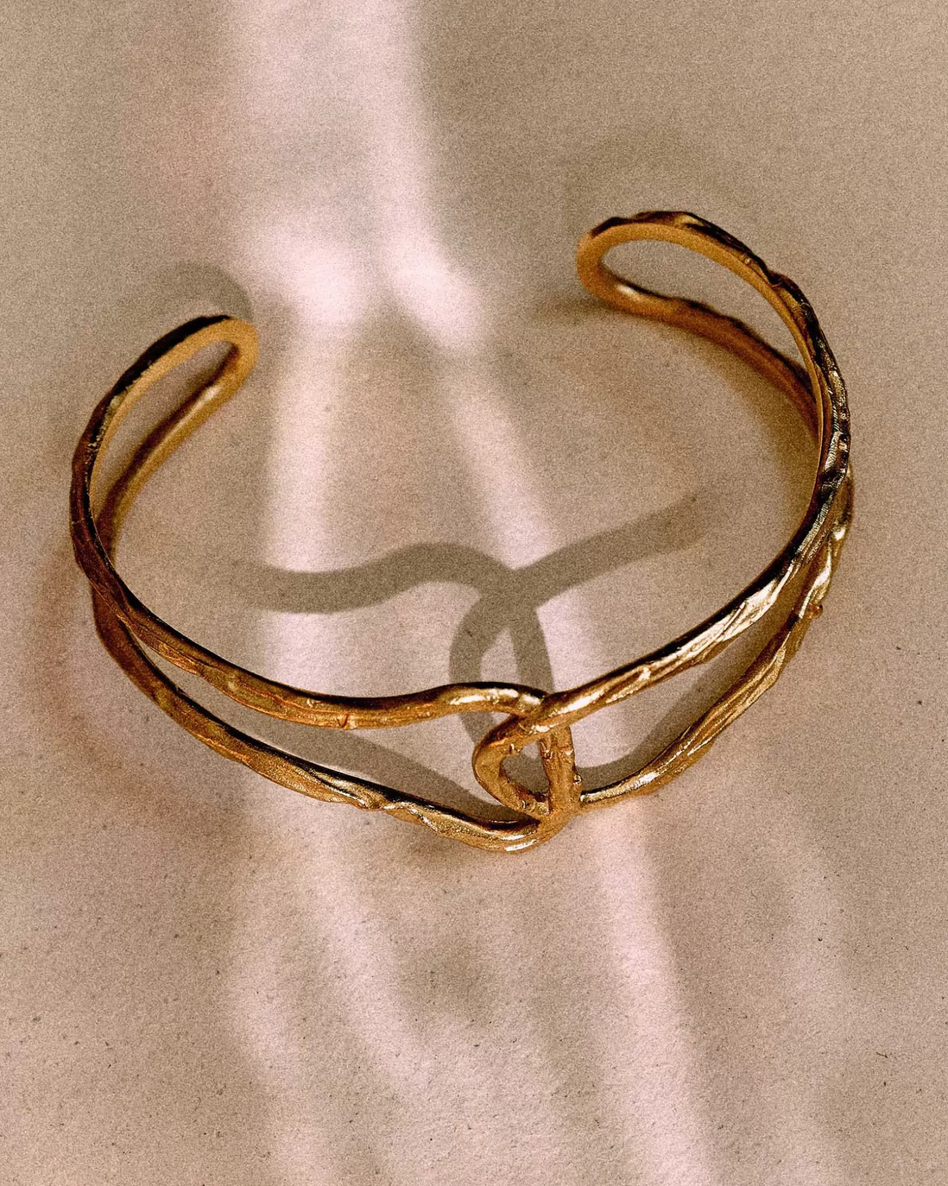 Armreif Aus Ineinander Verknoteten Ringelementen In Strukturierter Goldoptik.