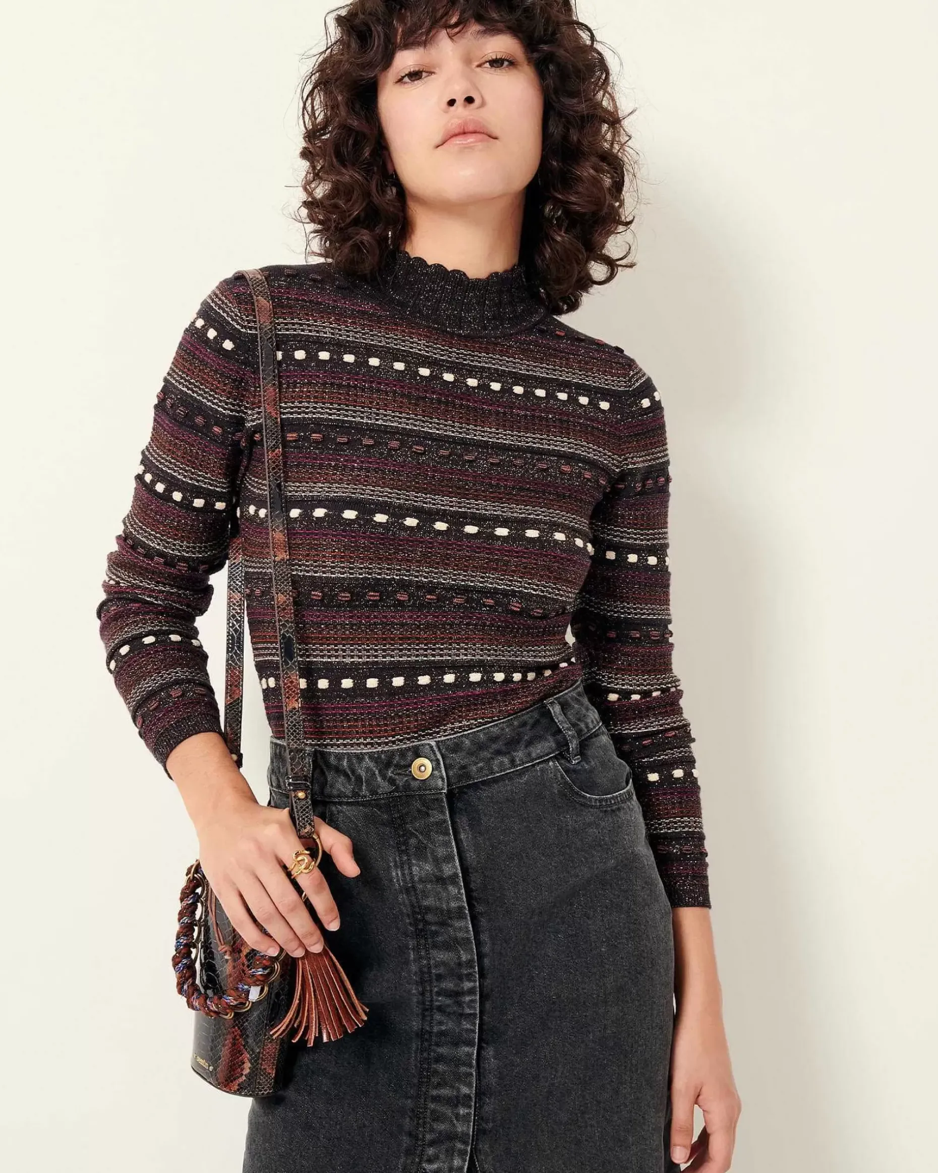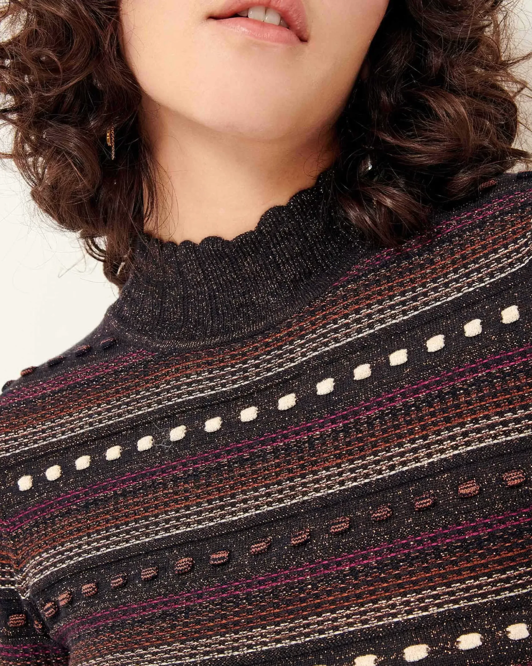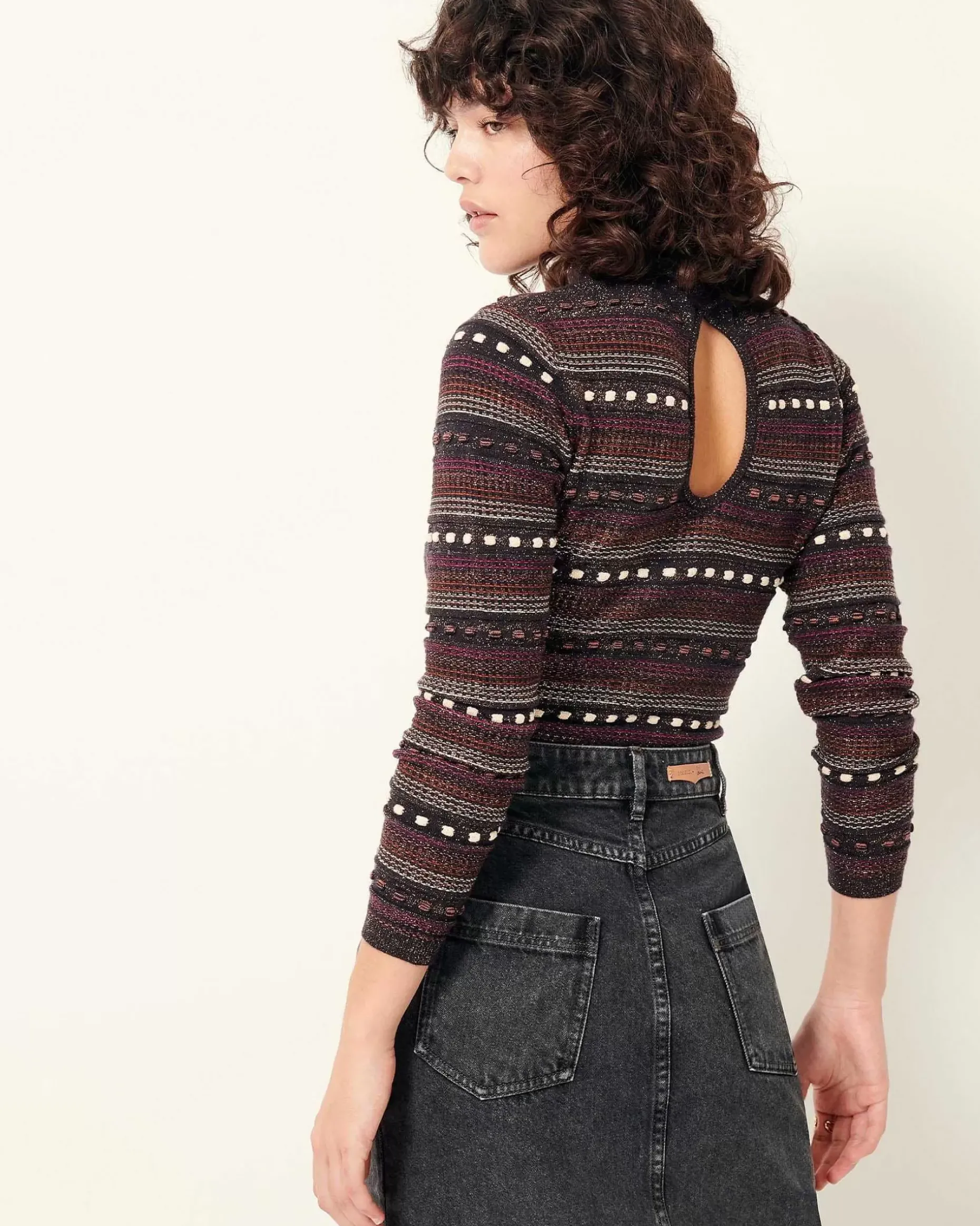 Langarmbody Mit Stehkragen Aus Jacquardstrick Mit Bunten Streifen Und Verspieltem, Texturiertem Muster, Exklusives Sessùn-Muster.