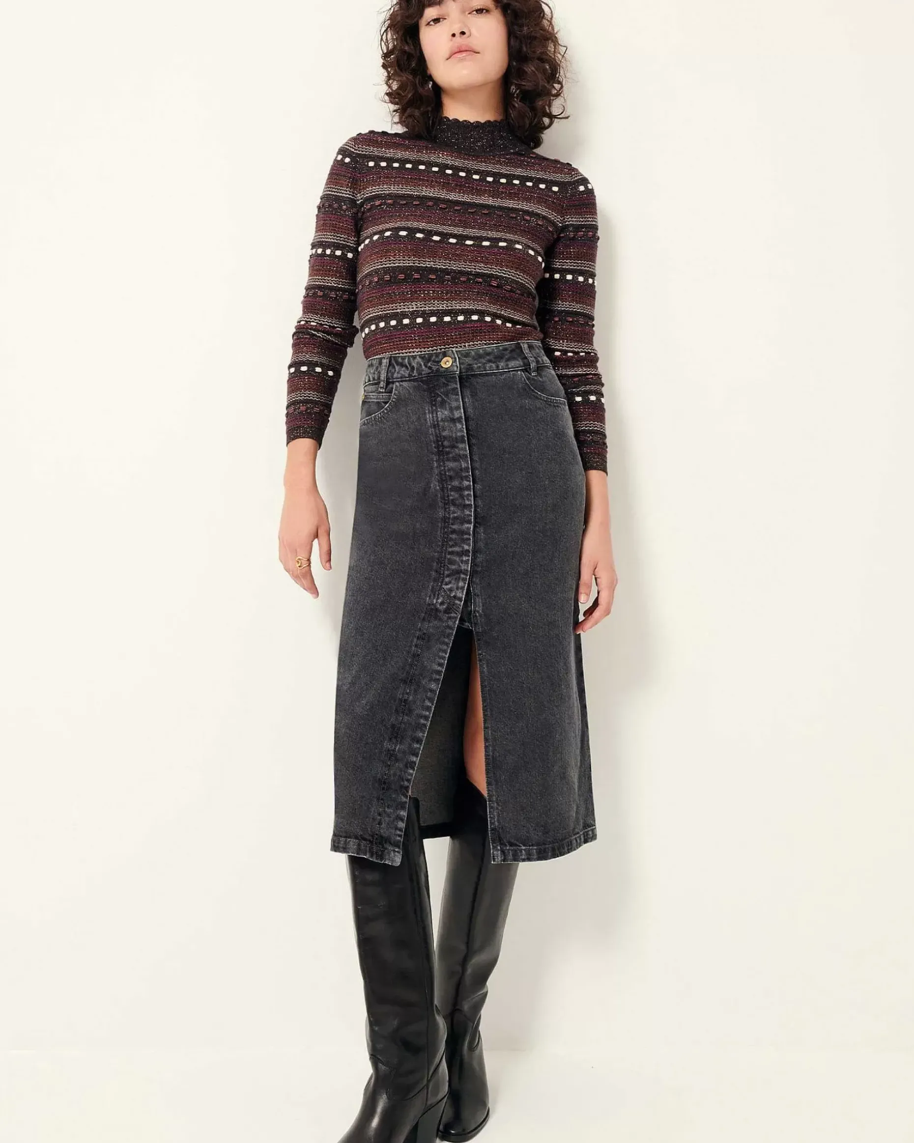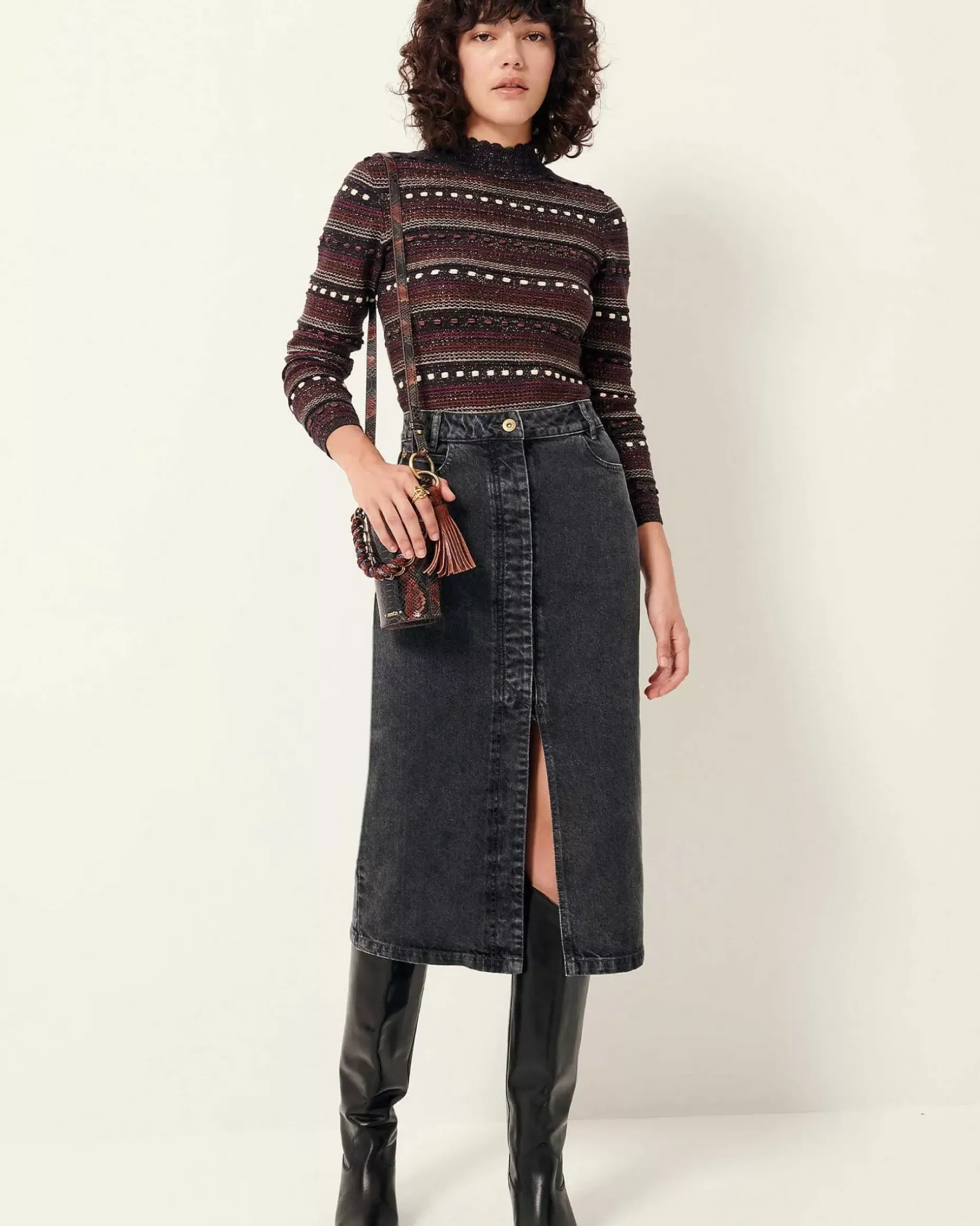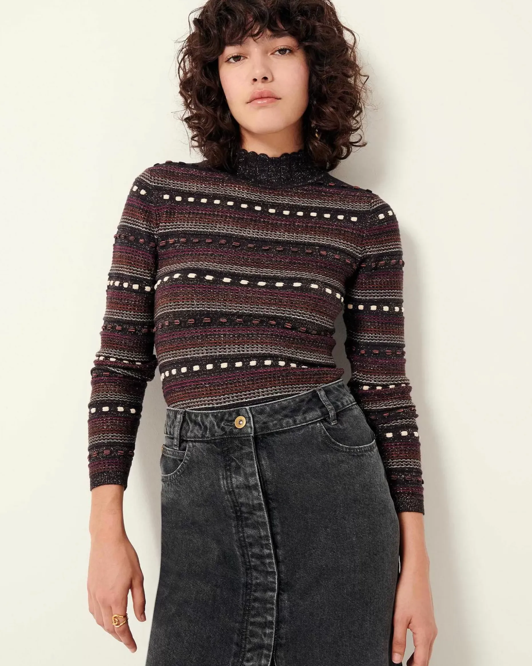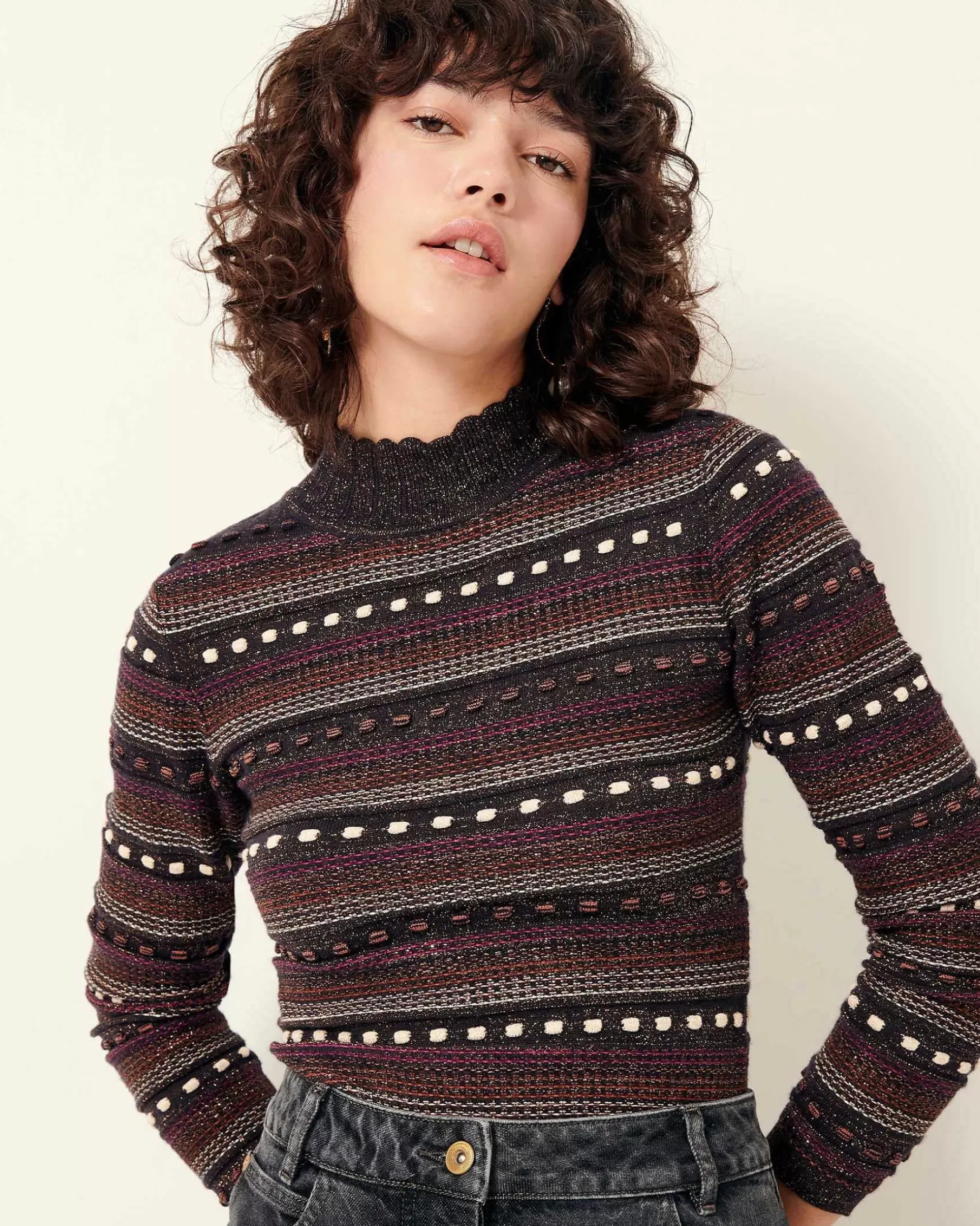 Langarmbody Mit Stehkragen Aus Jacquardstrick Mit Bunten Streifen Und Verspieltem, Texturiertem Muster, Exklusives Sessùn-Muster.
